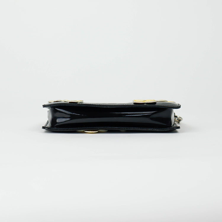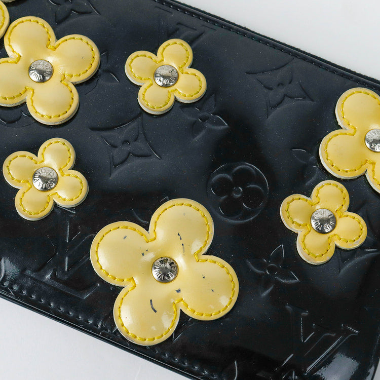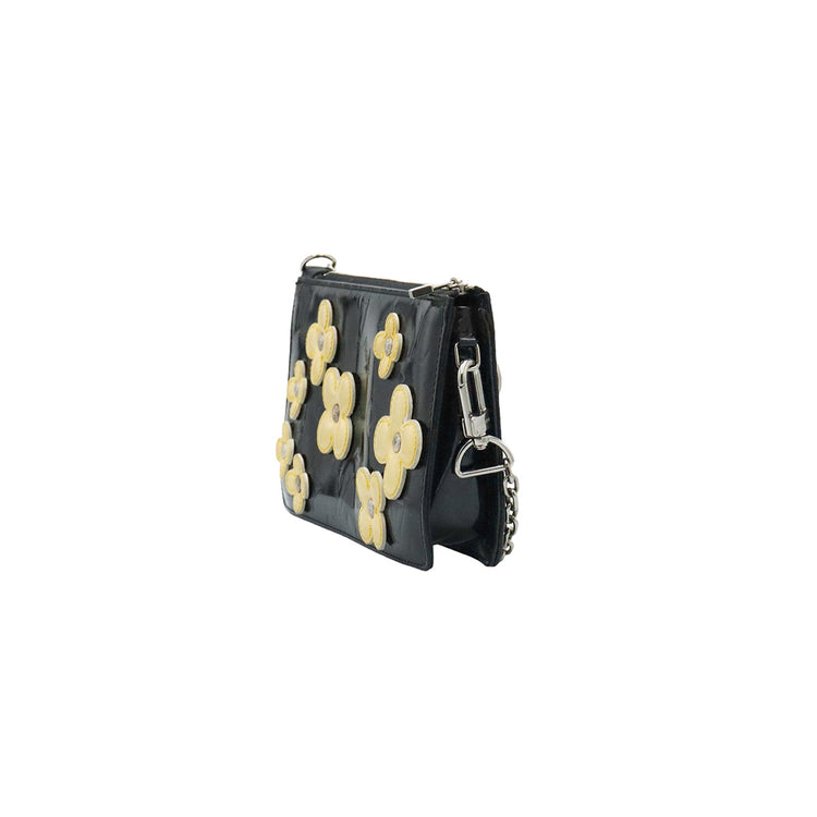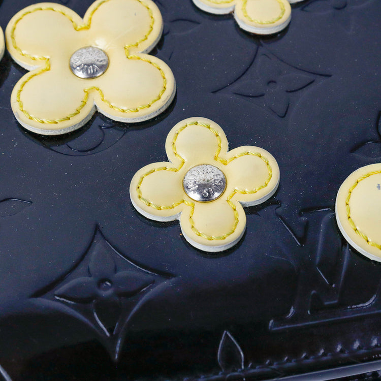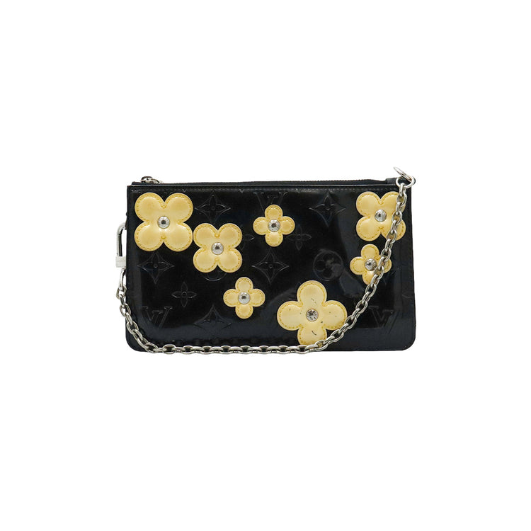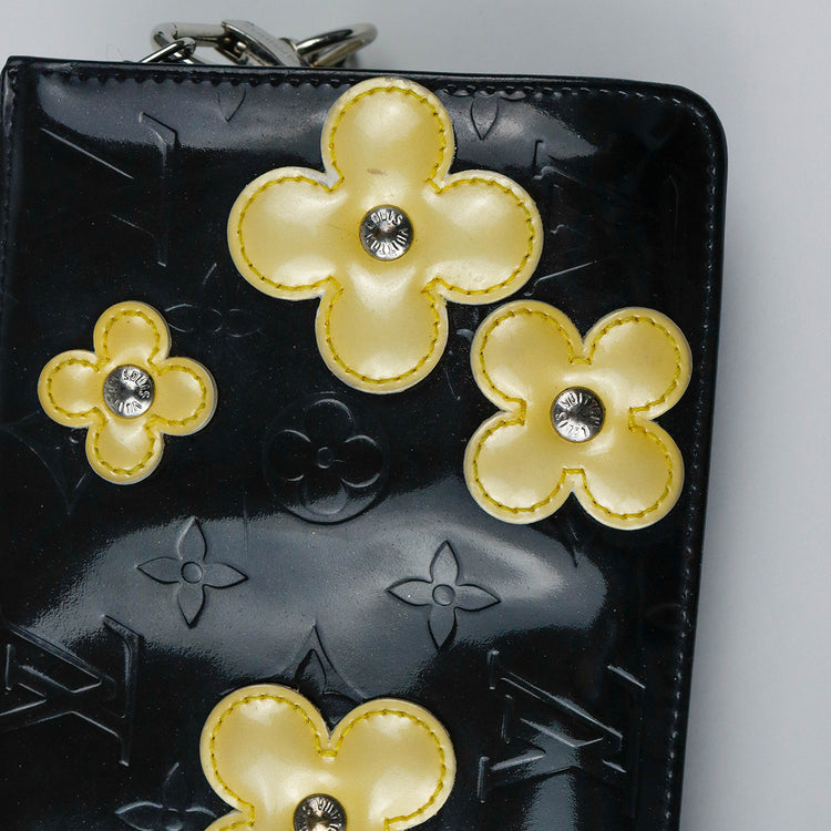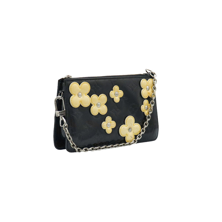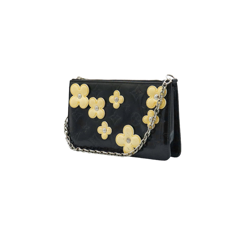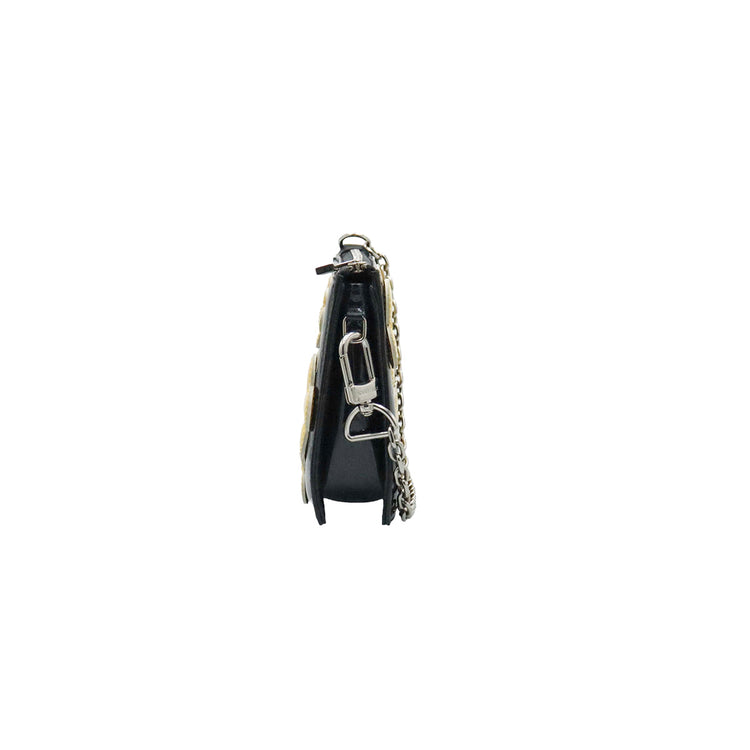 Mini Pochette Fleurs Lexington Louis Vuitton, confeccionado en piel vernis color negro con flores en color beige, manchada por dentro y fuer, herrajes en color plateado.