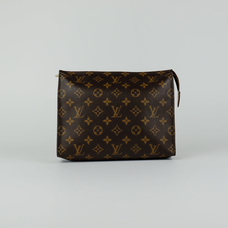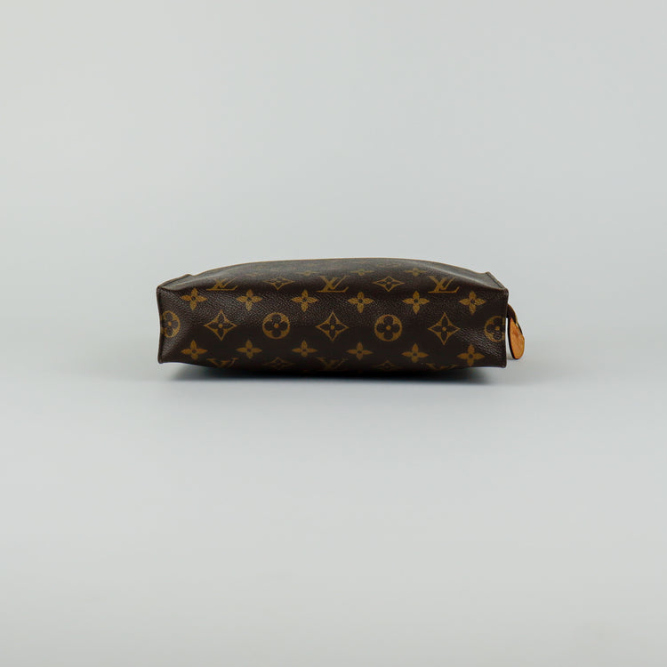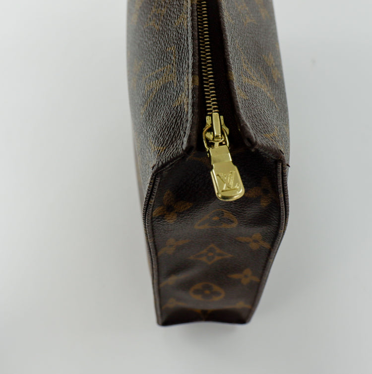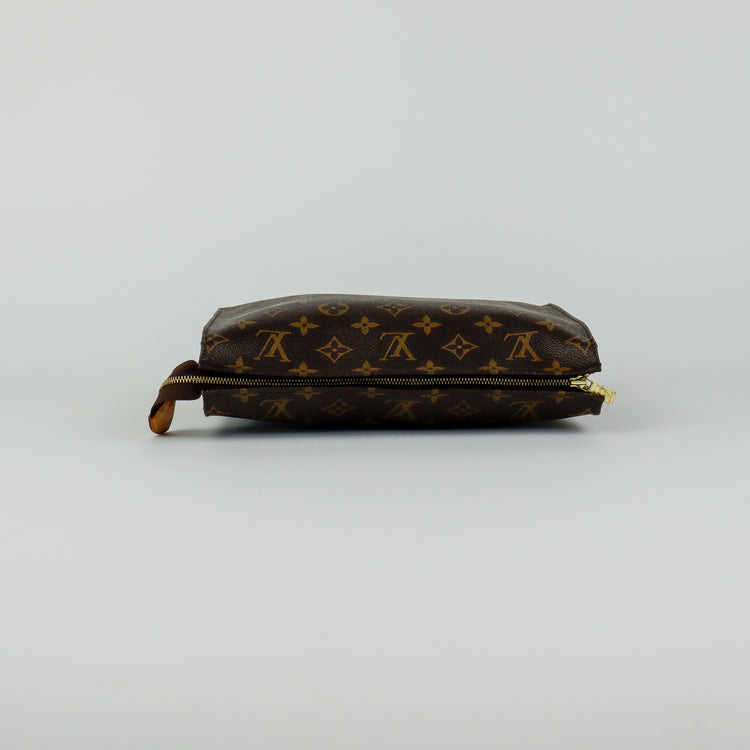 Mini bolso estilo cosmetiquera de la marca Louis Vuitton, confeccionado en lona monogram con cierre de cremallera, maltratado por dentro.