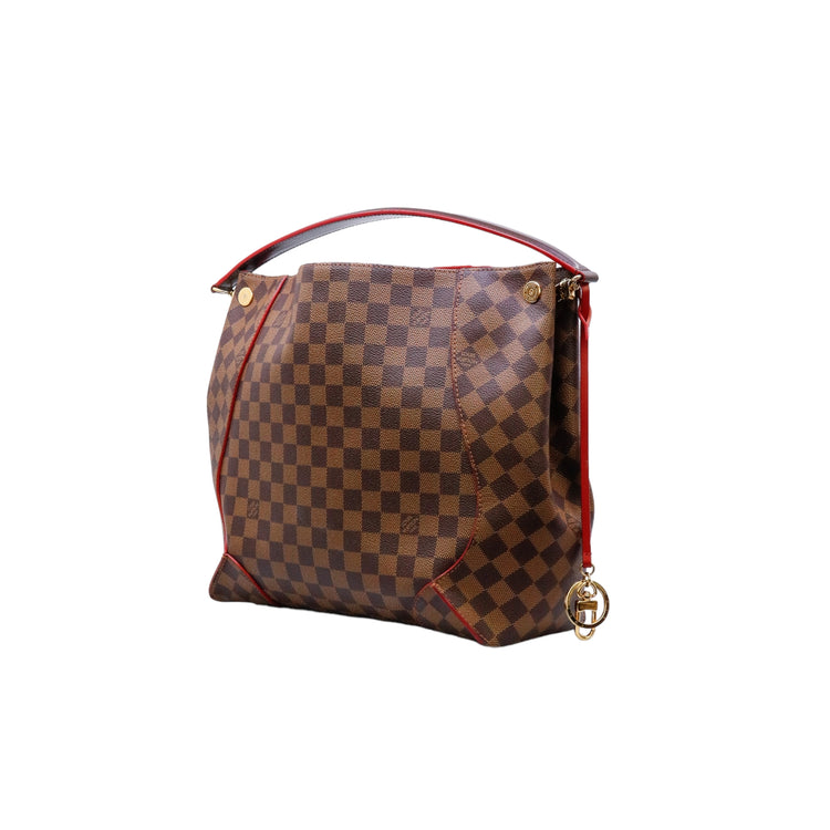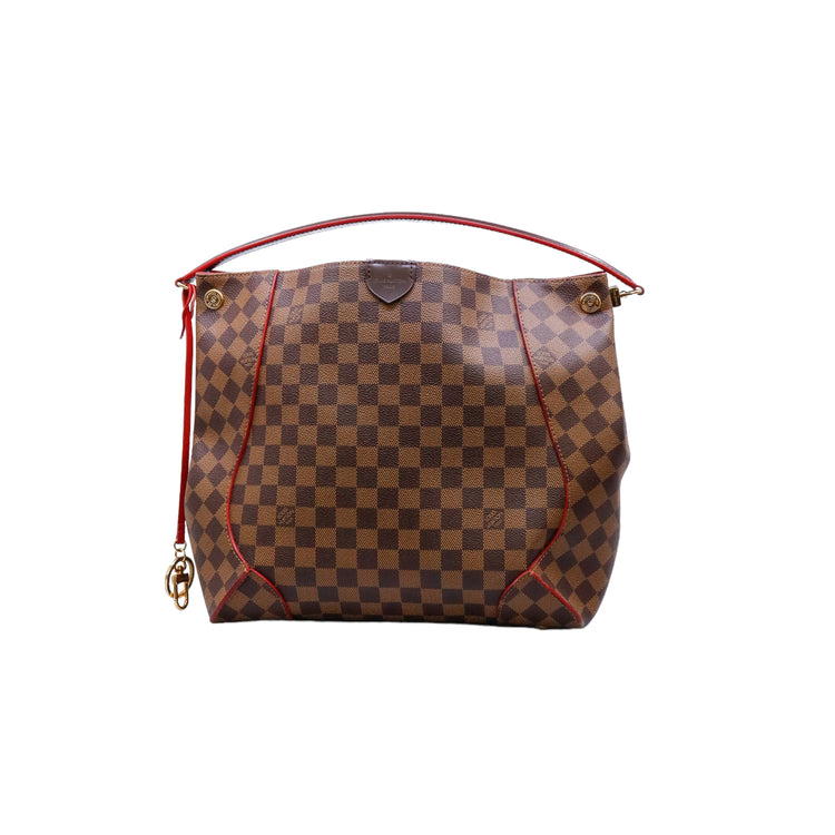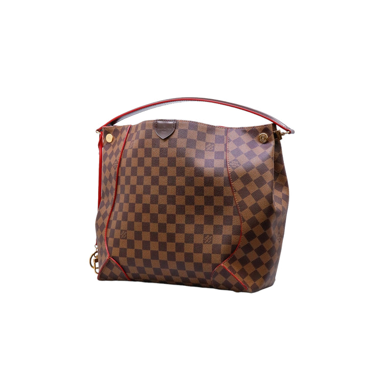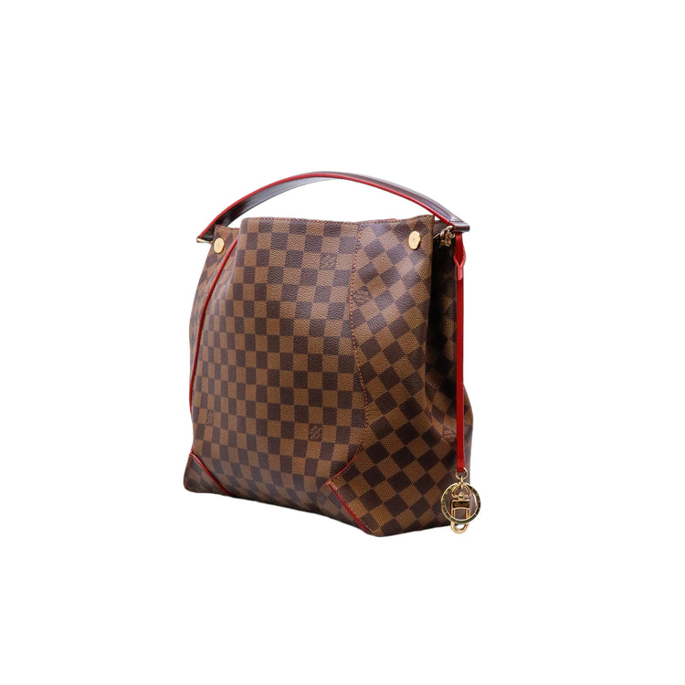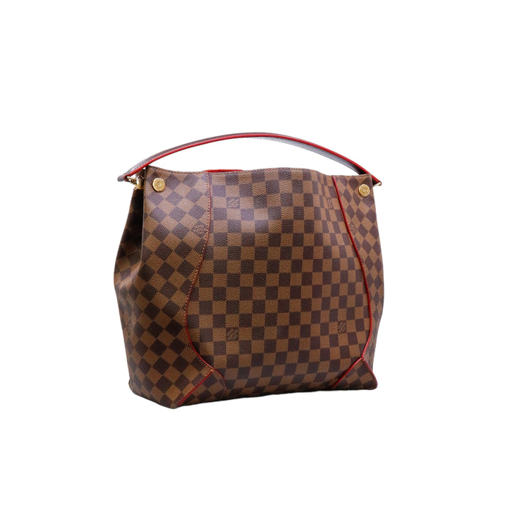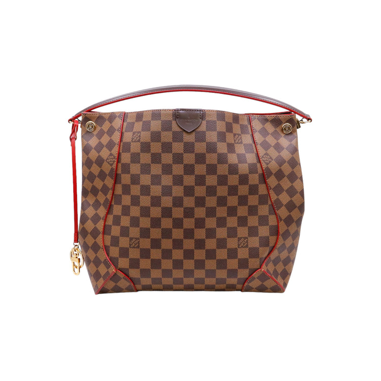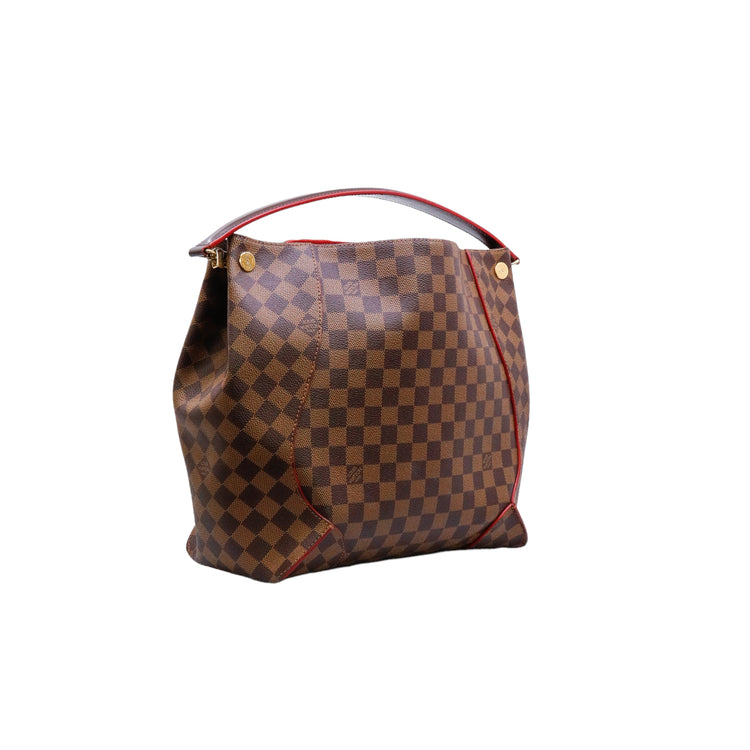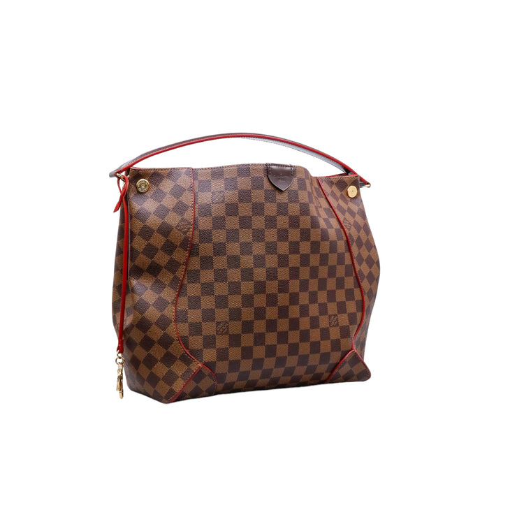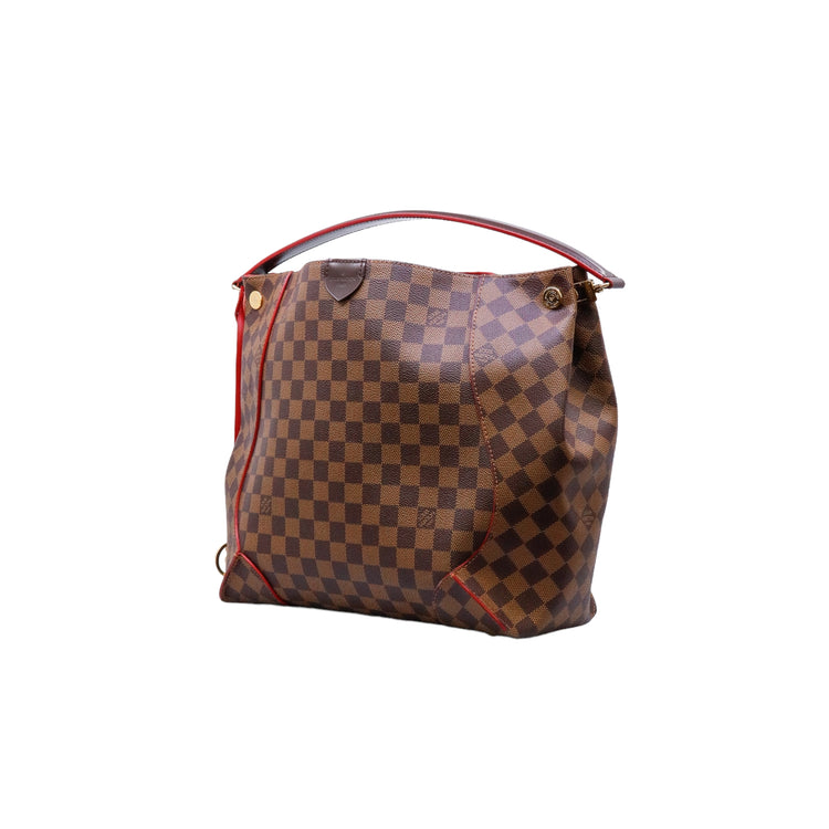 Bolso marca Louis Vuitton modelo Caissa, confeccionado en lona Damier Ebene, con asa única desmontable en piel, forro interno tipo alcántara rojo con bolsillo interno, cierre de cremallera y herrajes en color dorado.