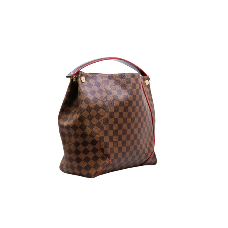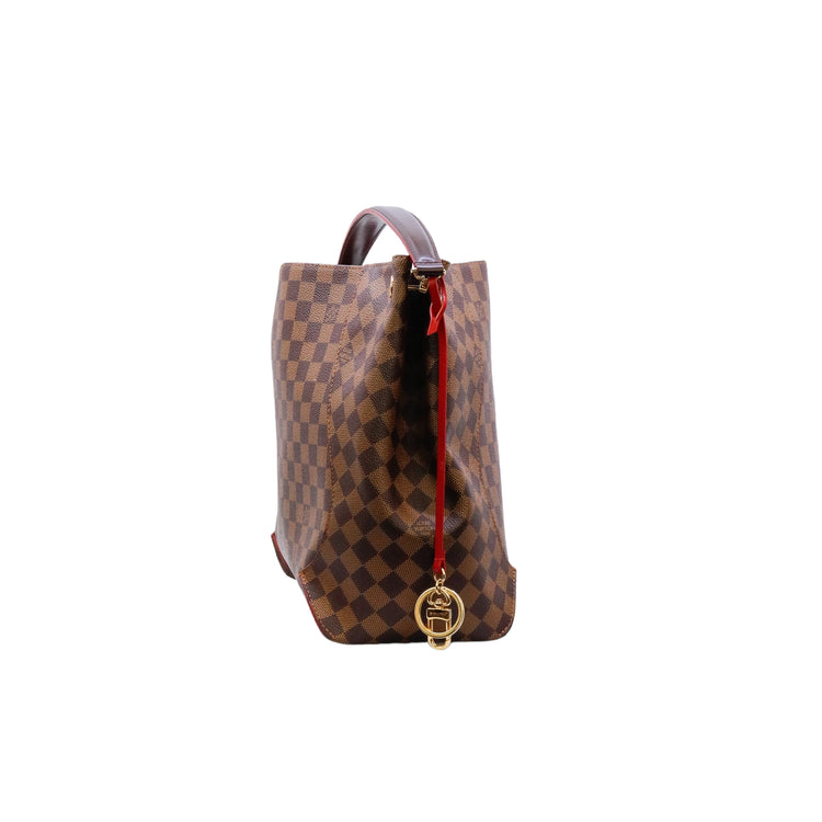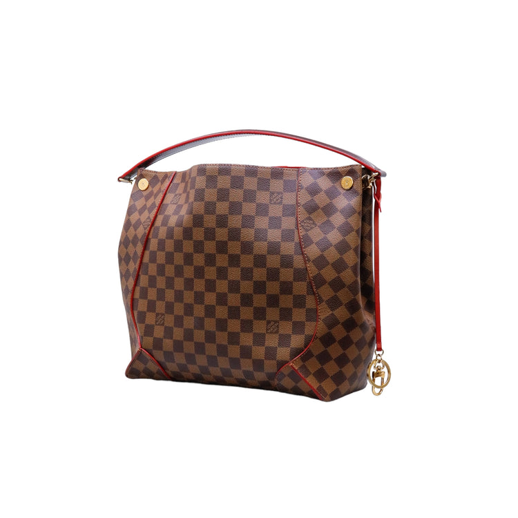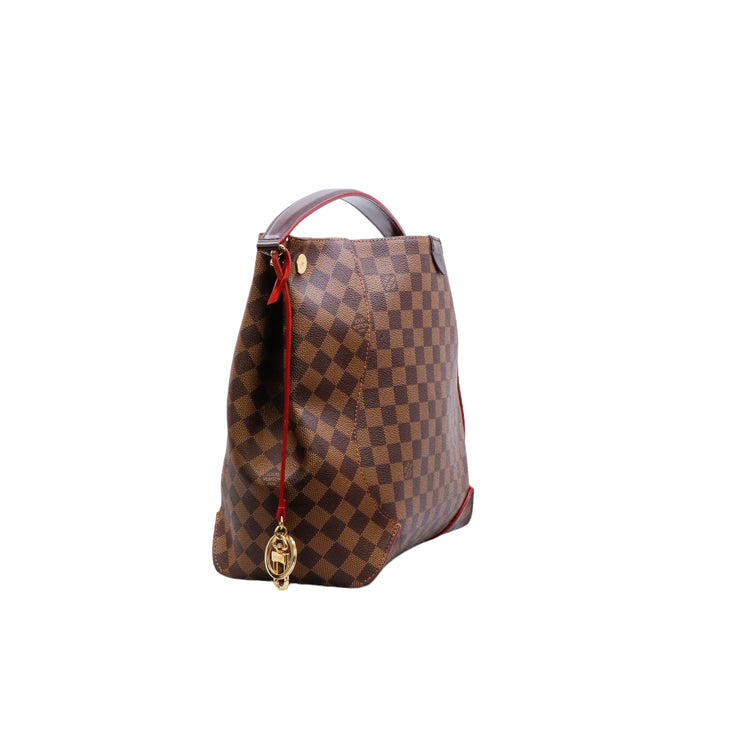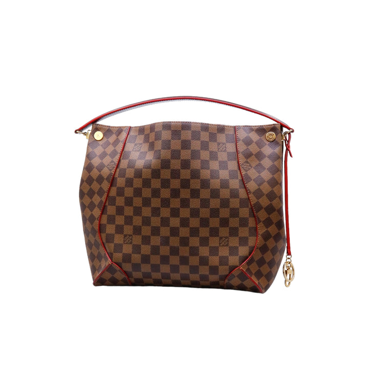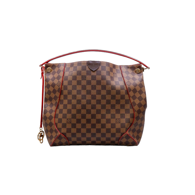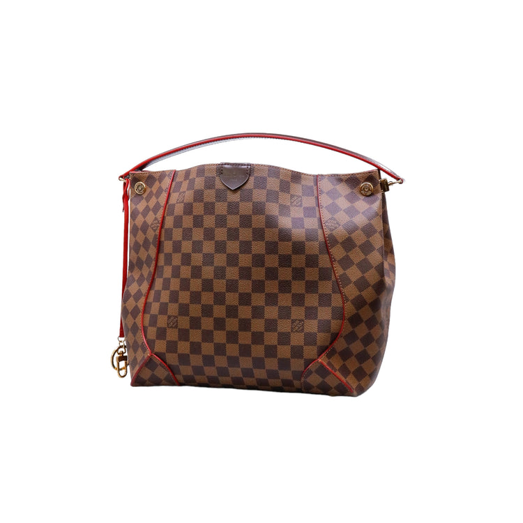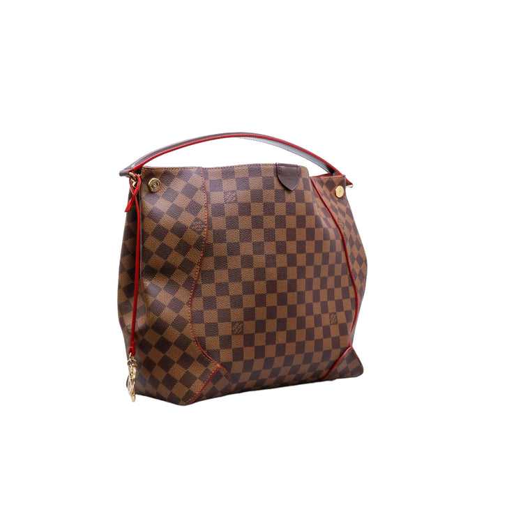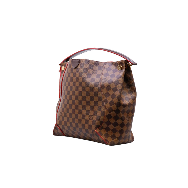 Bolso marca Louis Vuitton modelo Caissa, confeccionado en lona Damier Ebene, con asa única desmontable en piel, forro interno tipo alcántara rojo con bolsillo interno, cierre de cremallera y herrajes en color dorado.