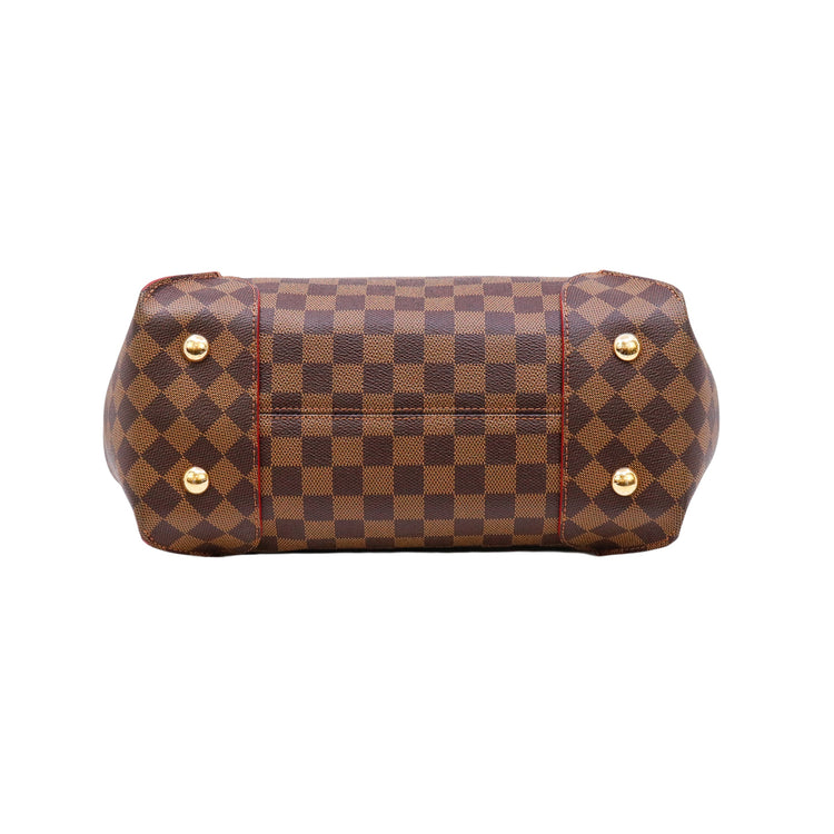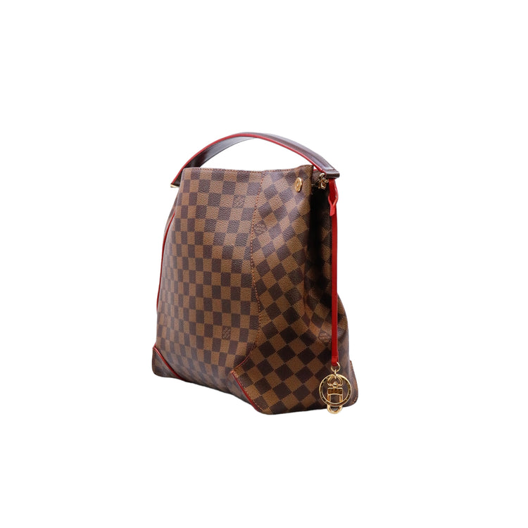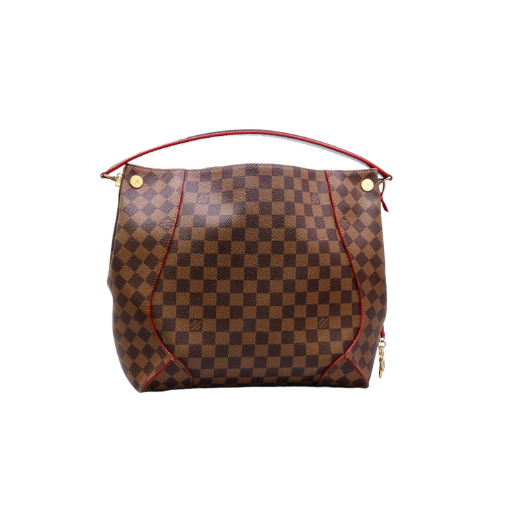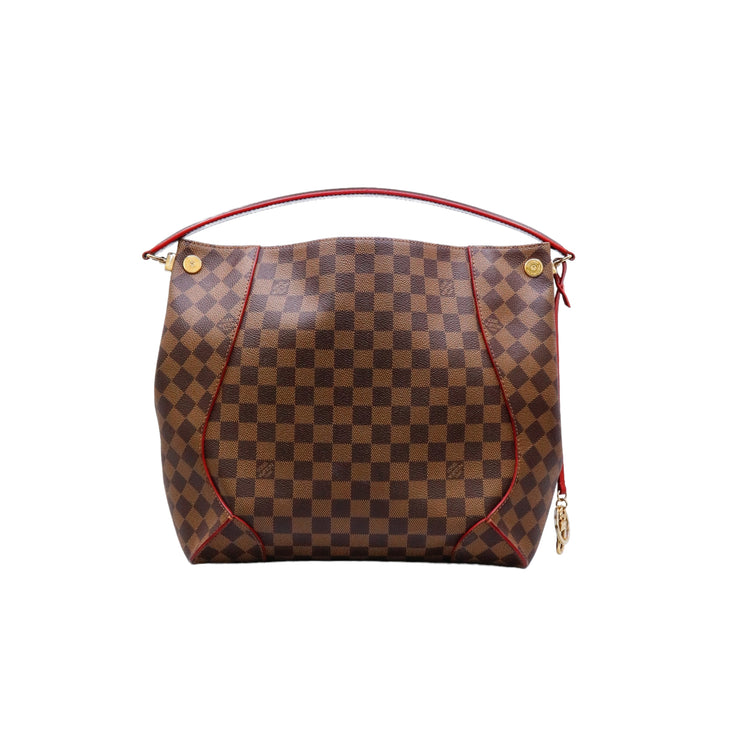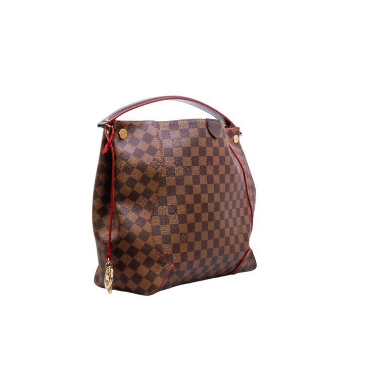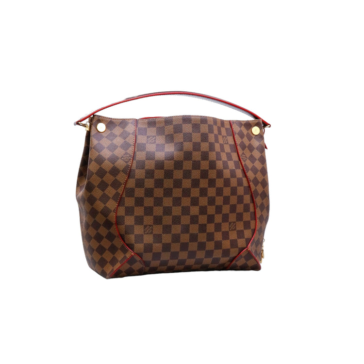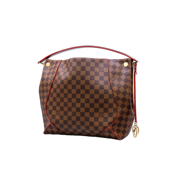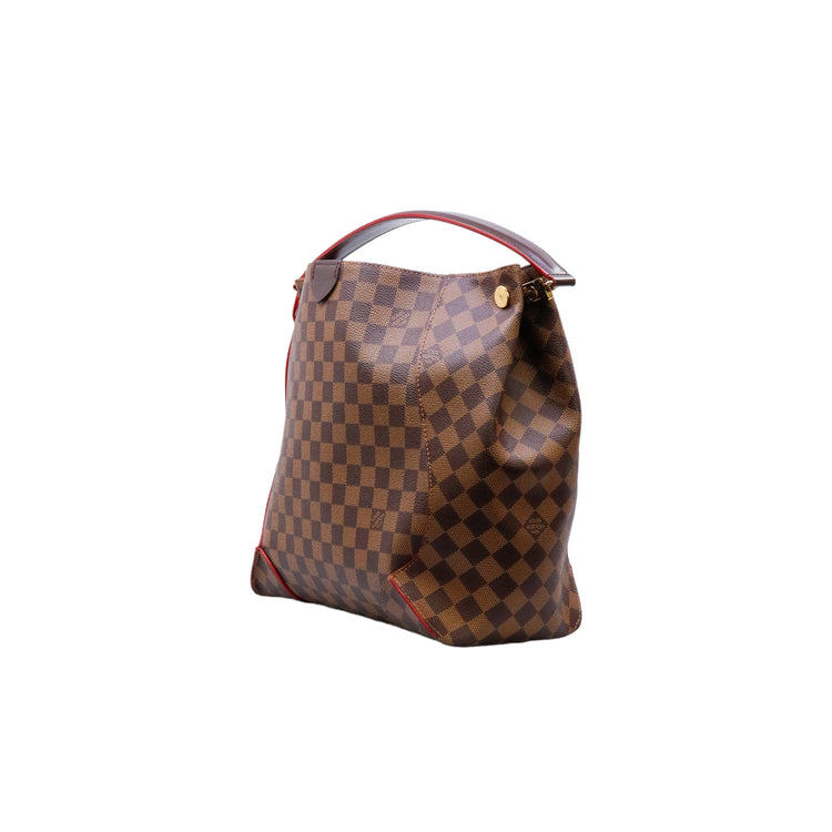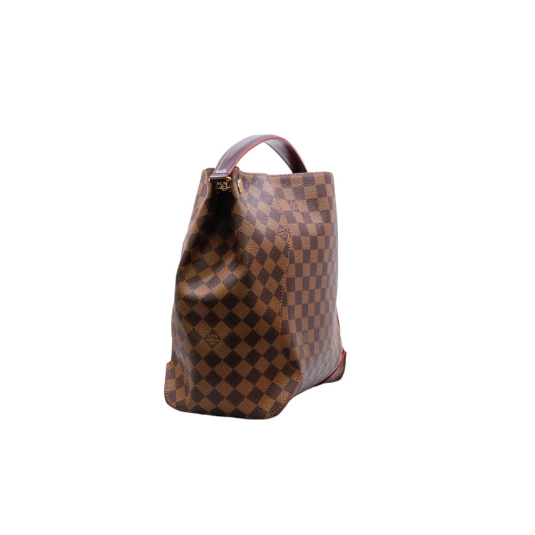 Bolso marca Louis Vuitton modelo Caissa, confeccionado en lona Damier Ebene, con asa única desmontable en piel, forro interno tipo alcántara rojo con bolsillo interno, cierre de cremallera y herrajes en color dorado.