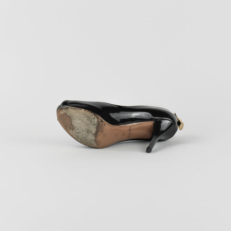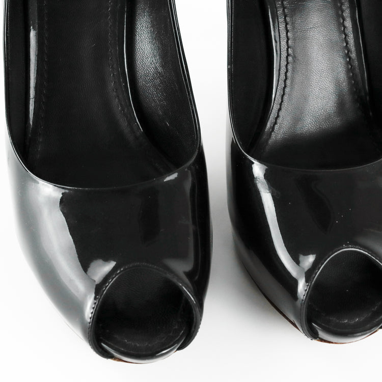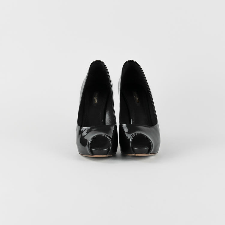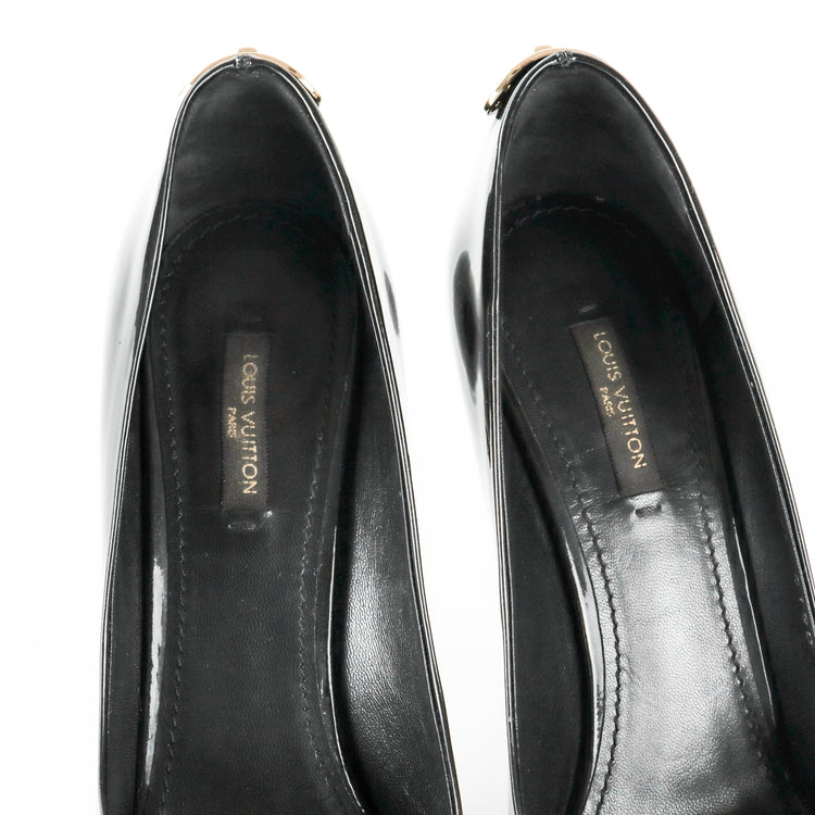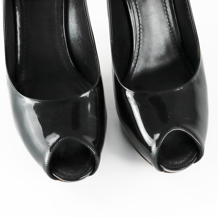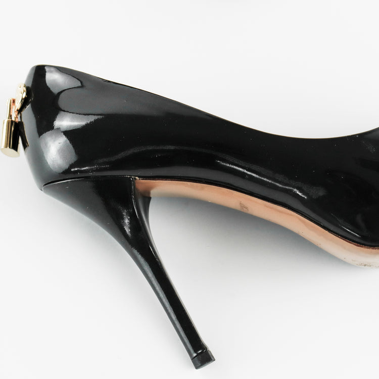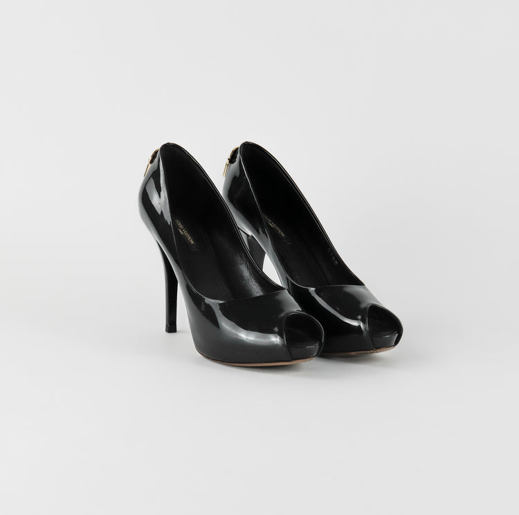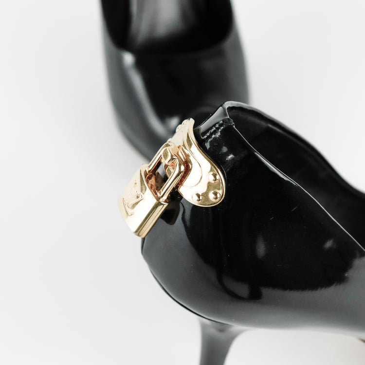 Zapatos de tacón peep toe Louis Vuitton, confeccionados en charol negro con acabado de efecto tornasol, detalle en talón con candado en color dorado, leves detalles en suela por poco uso.