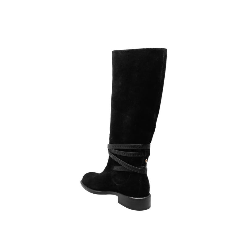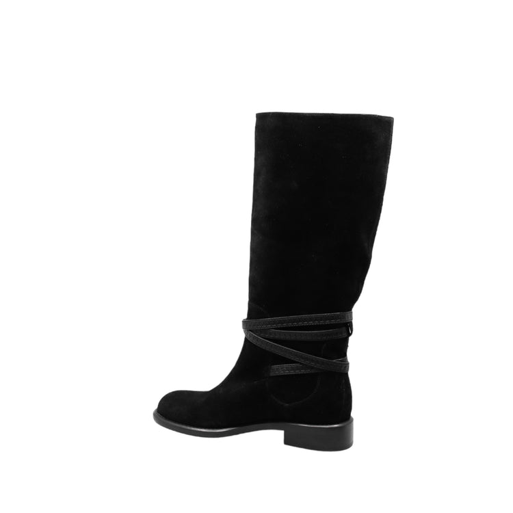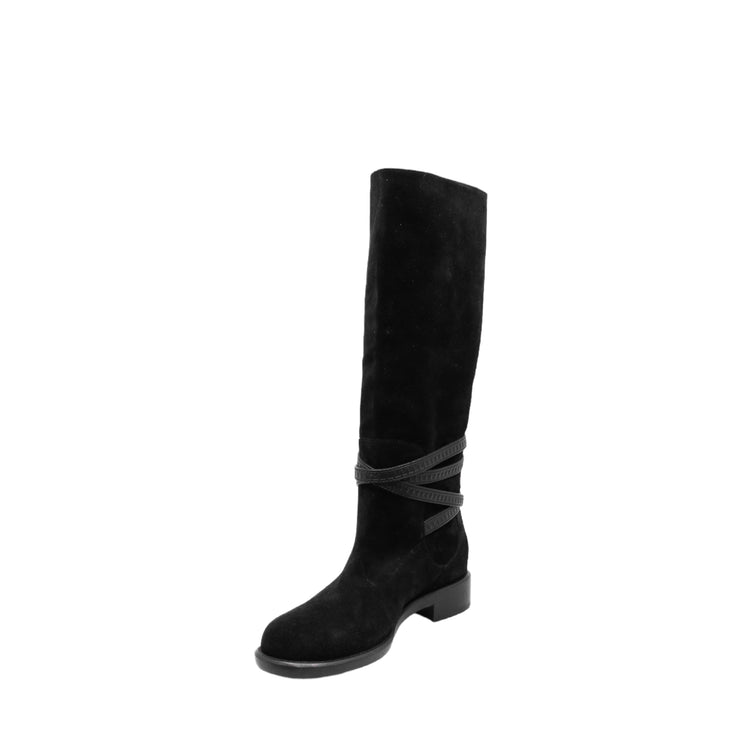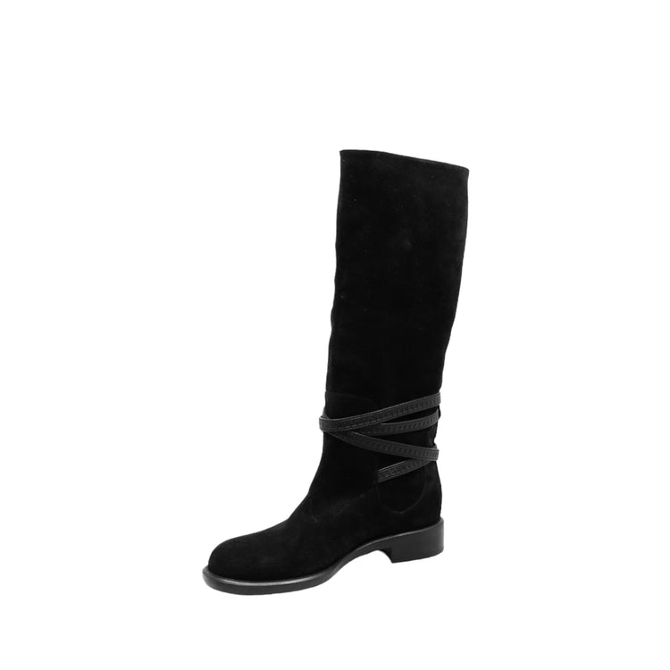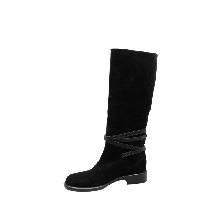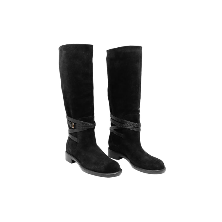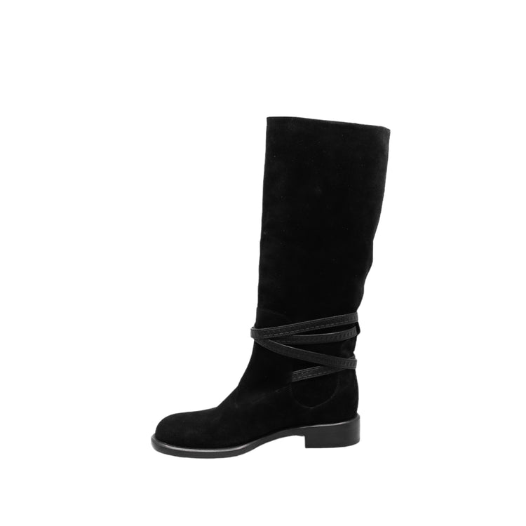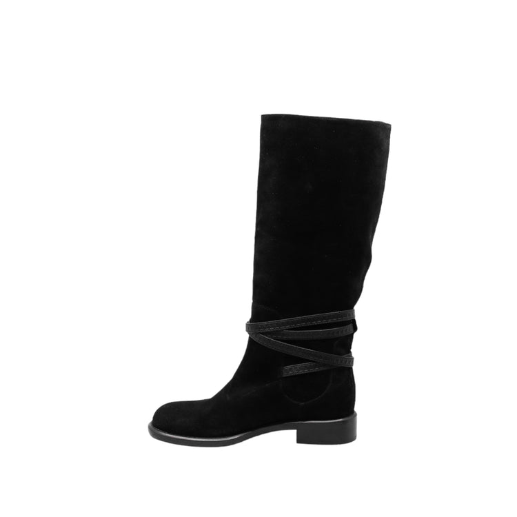 Botas planas de la marca Louis Vuitton, confeccionadas en gamuza color negro, con tiras ajustables al tobillo, punta redonda, 40 cm de largo.