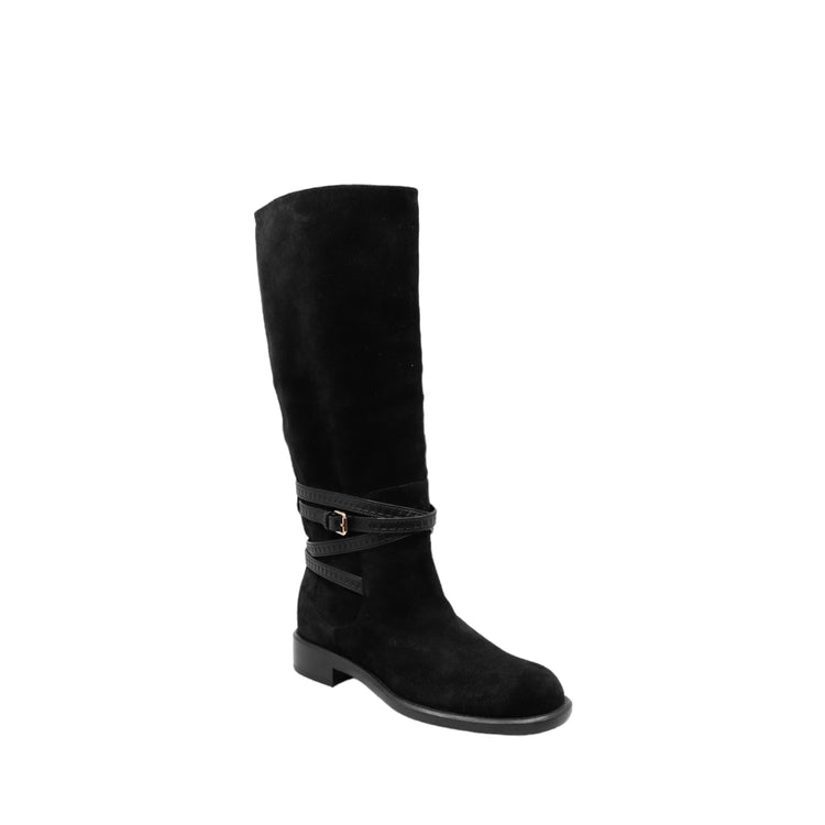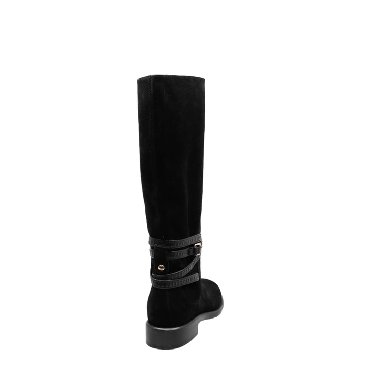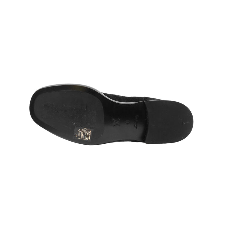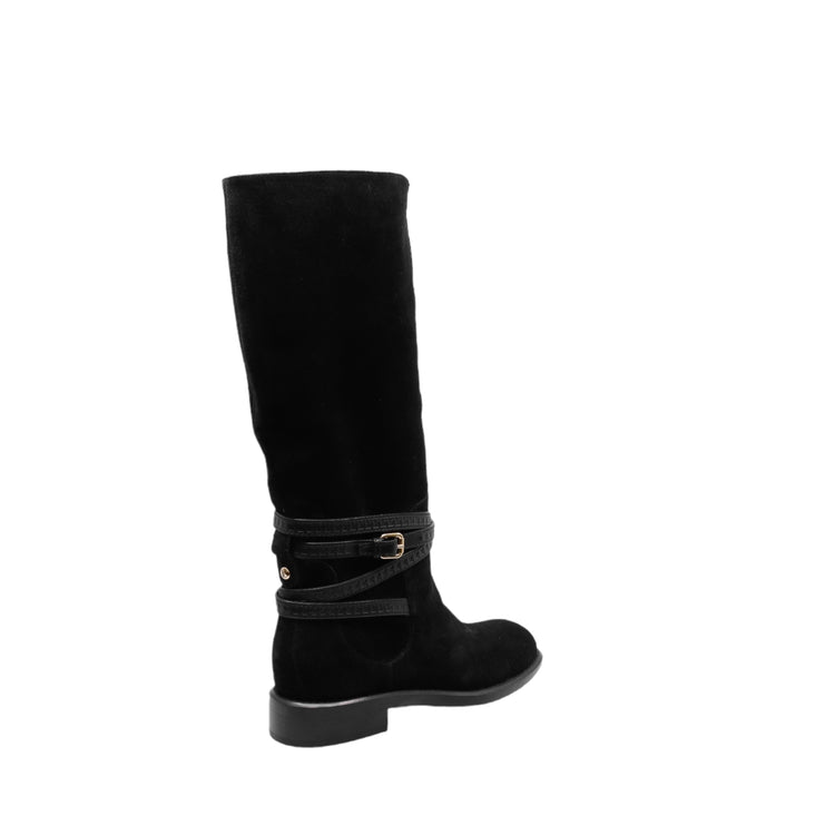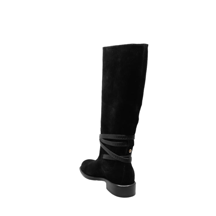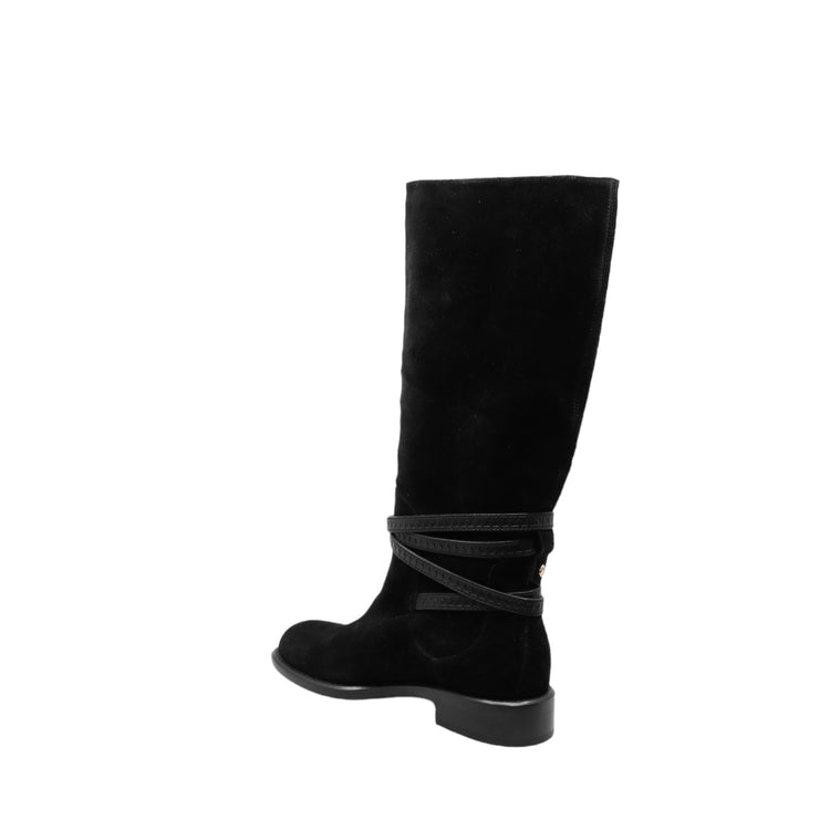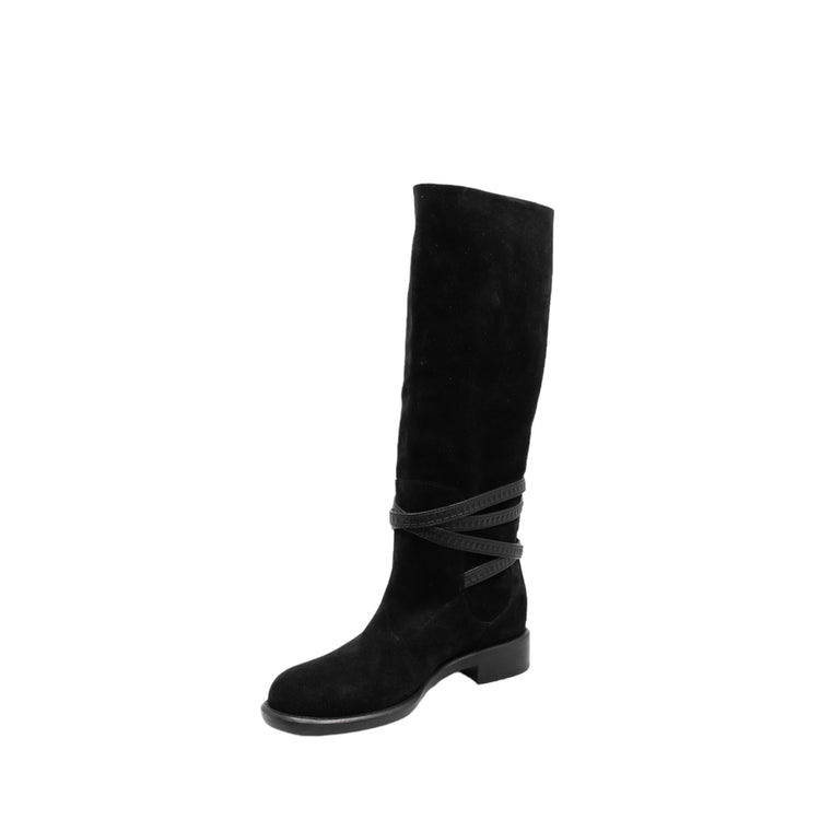 Botas planas de la marca Louis Vuitton, confeccionadas en gamuza color negro, con tiras ajustables al tobillo, punta redonda, 40 cm de largo.