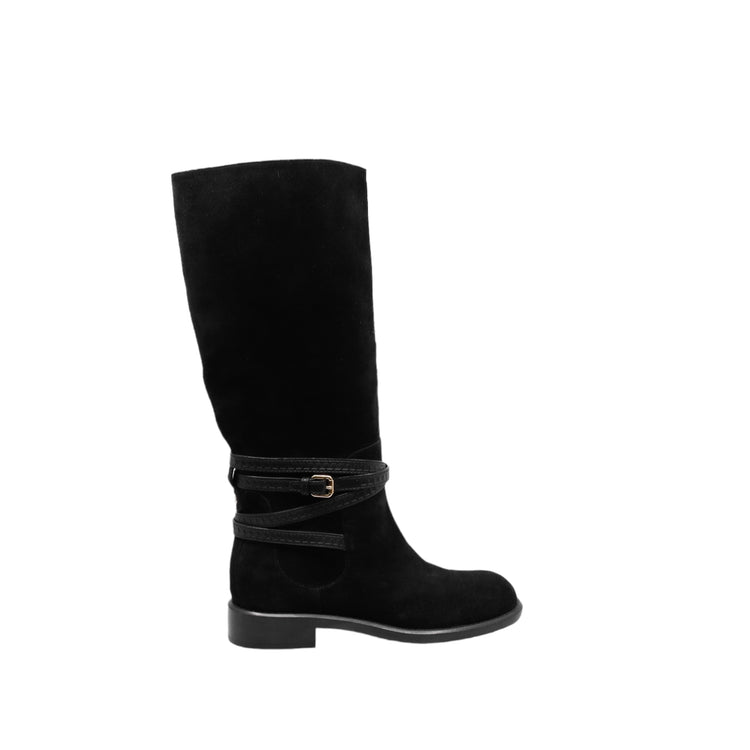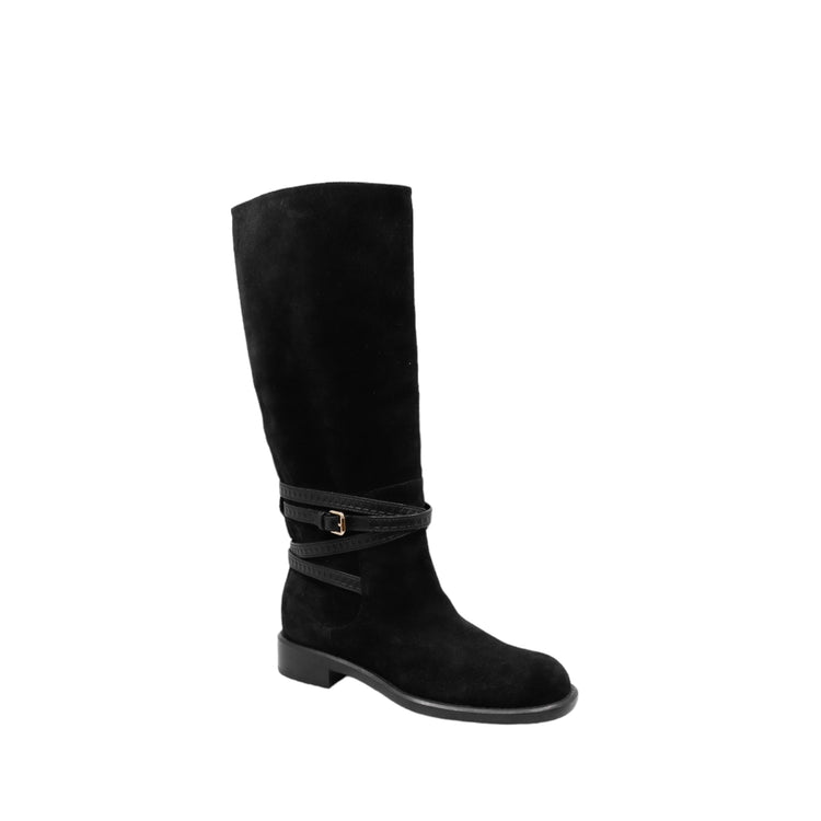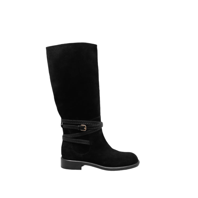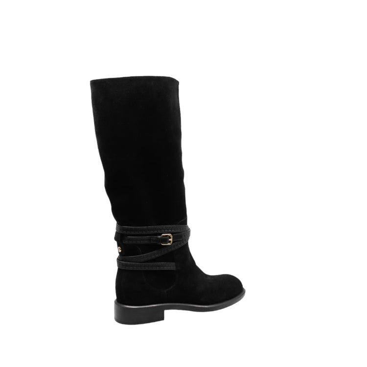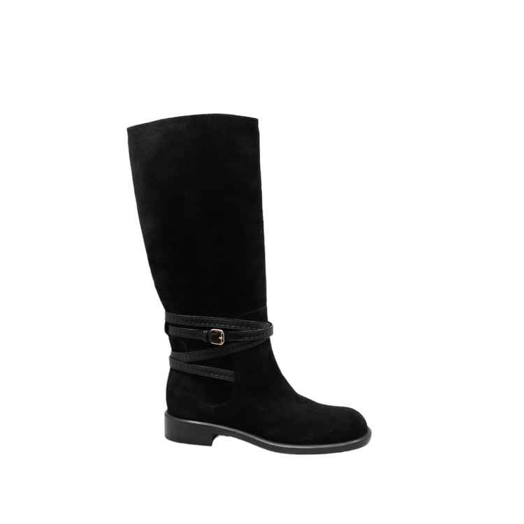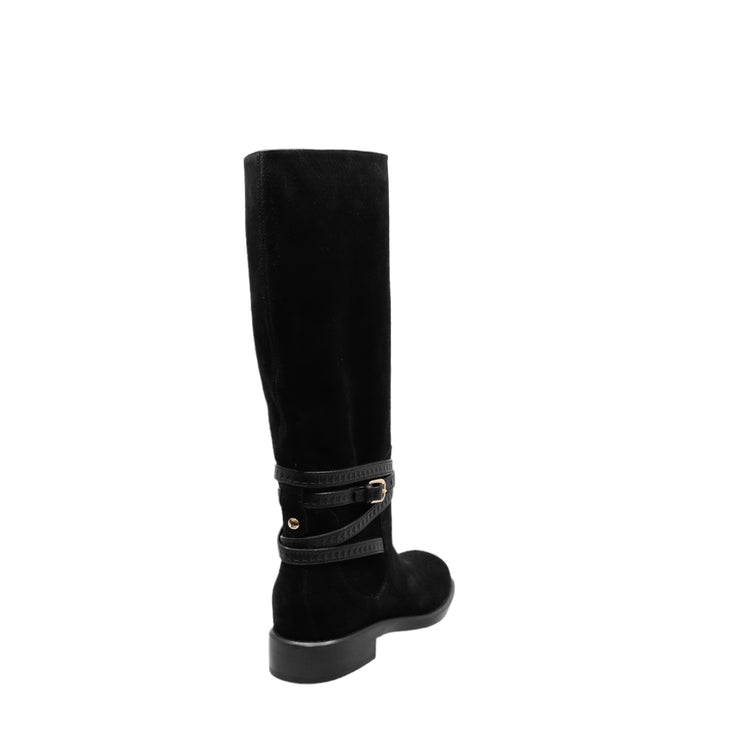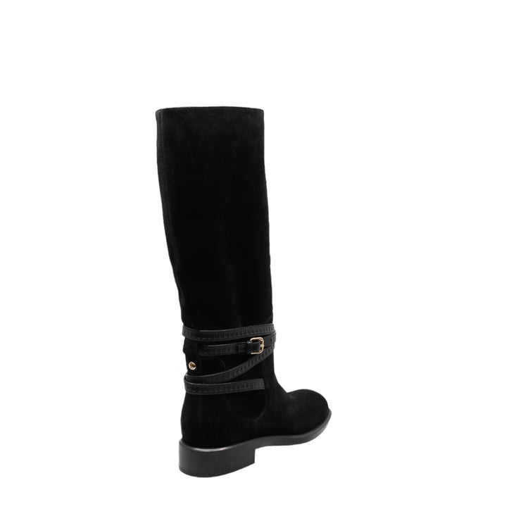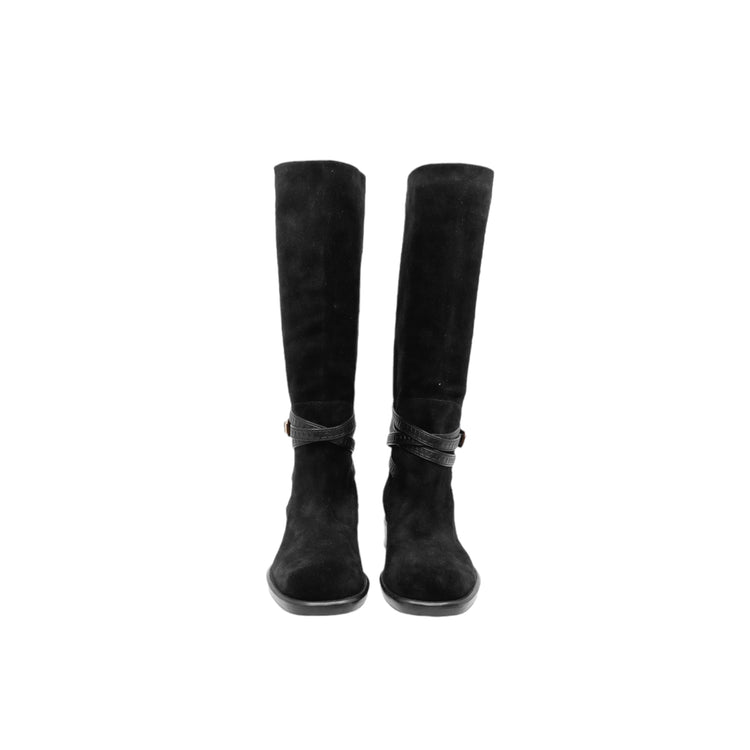 Botas planas de la marca Louis Vuitton, confeccionadas en gamuza color negro, con tiras ajustables al tobillo, punta redonda, 40 cm de largo.