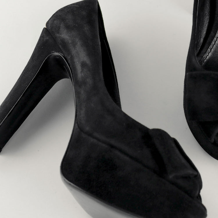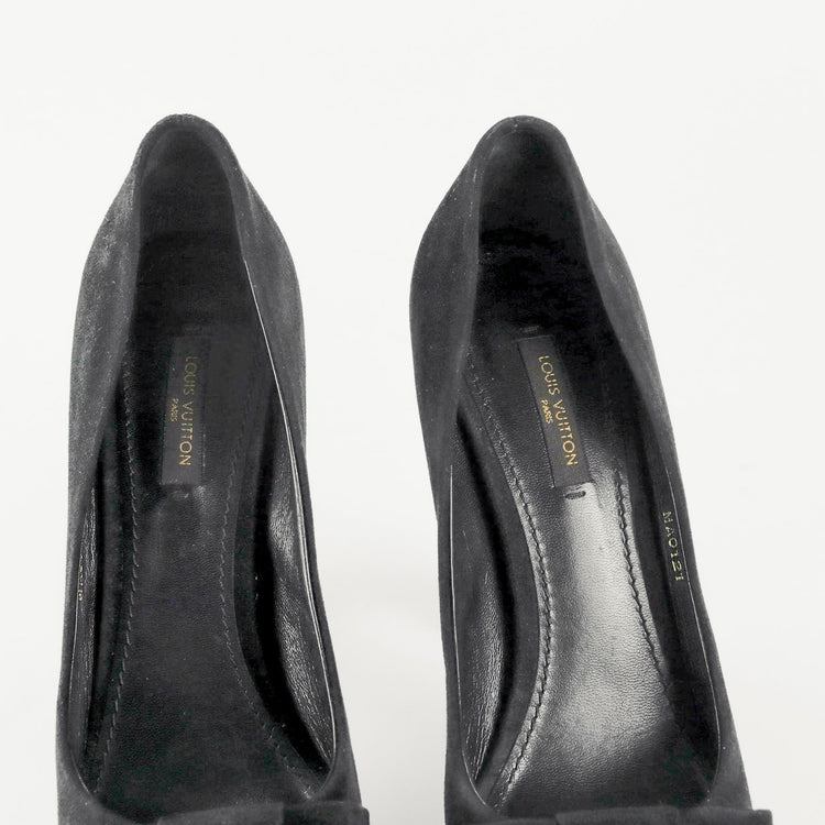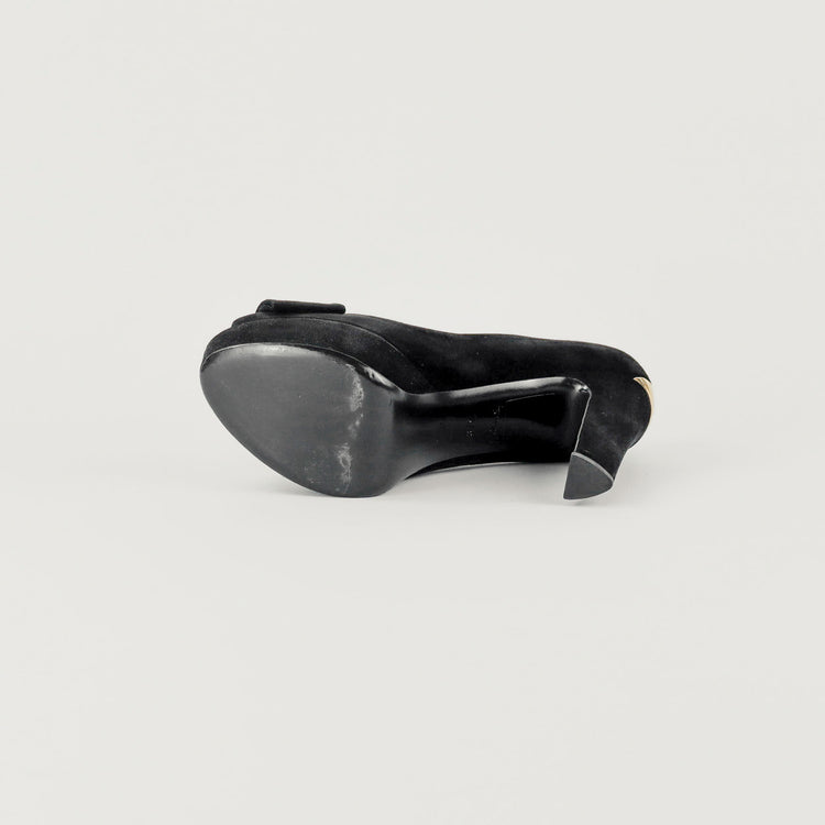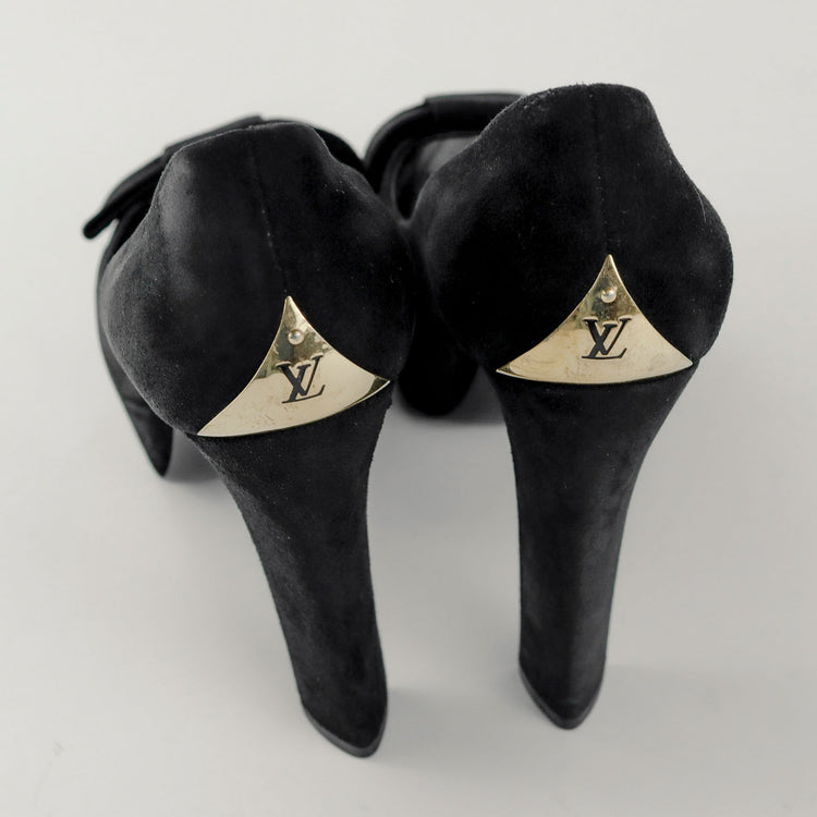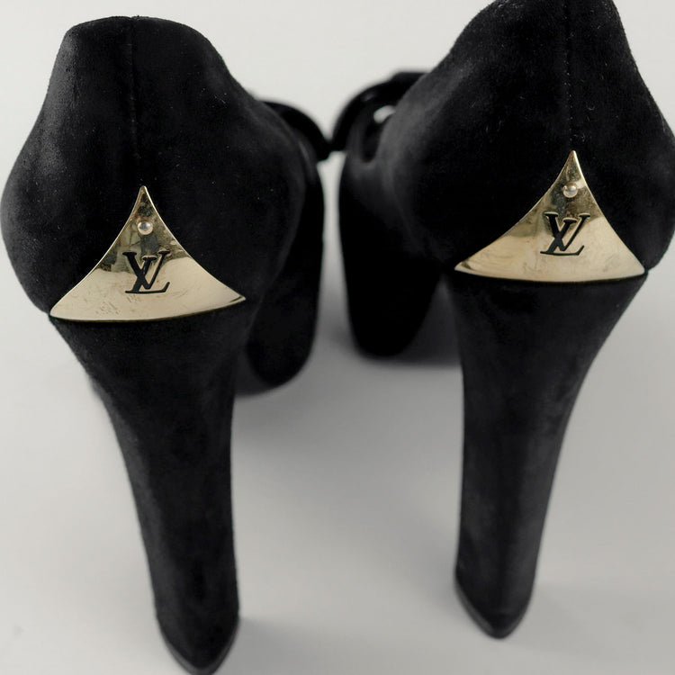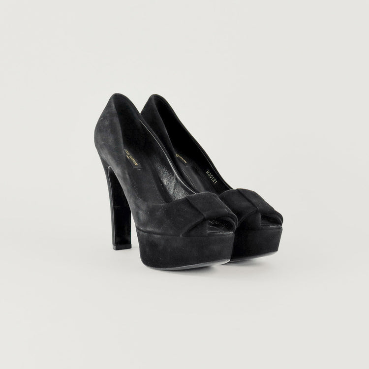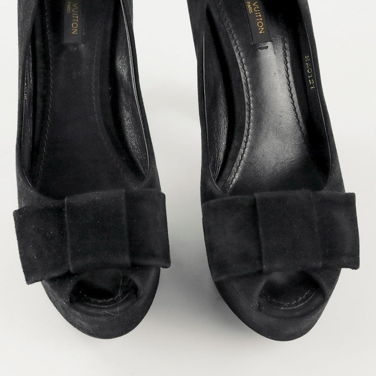 Zapatos de plataforma con tacón tipo peep toe Louis Vuitton, confeccionados en suede color negro, con plataforma de 3 cms, con moño de adorno sobre el empeine, desgaste por uso regular.