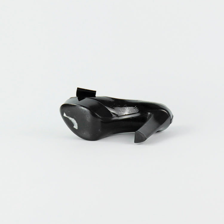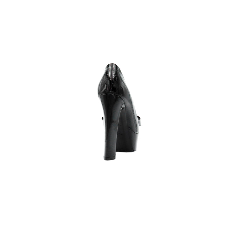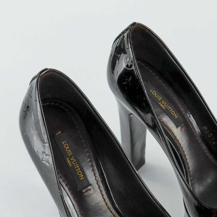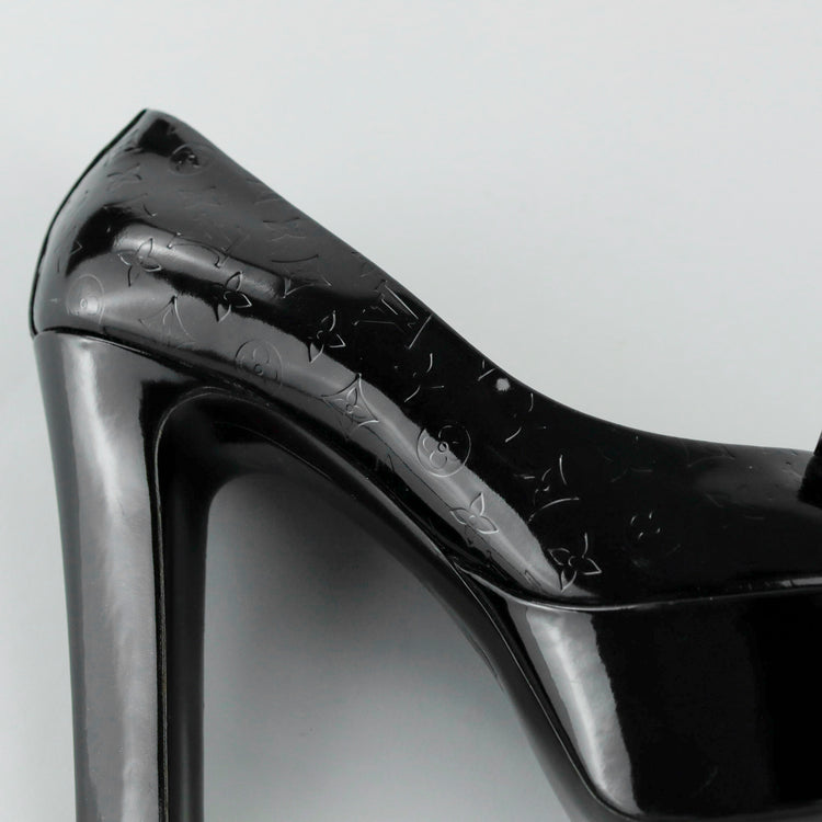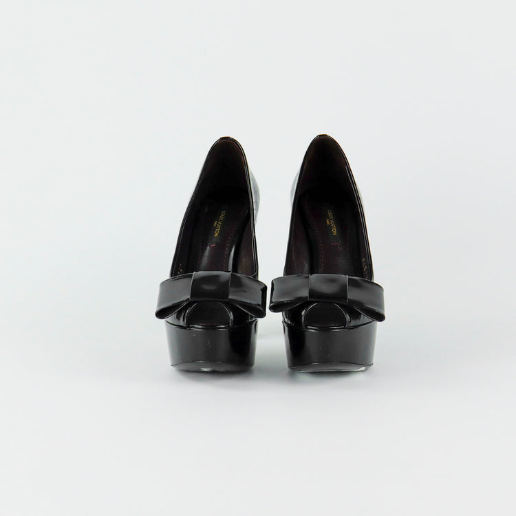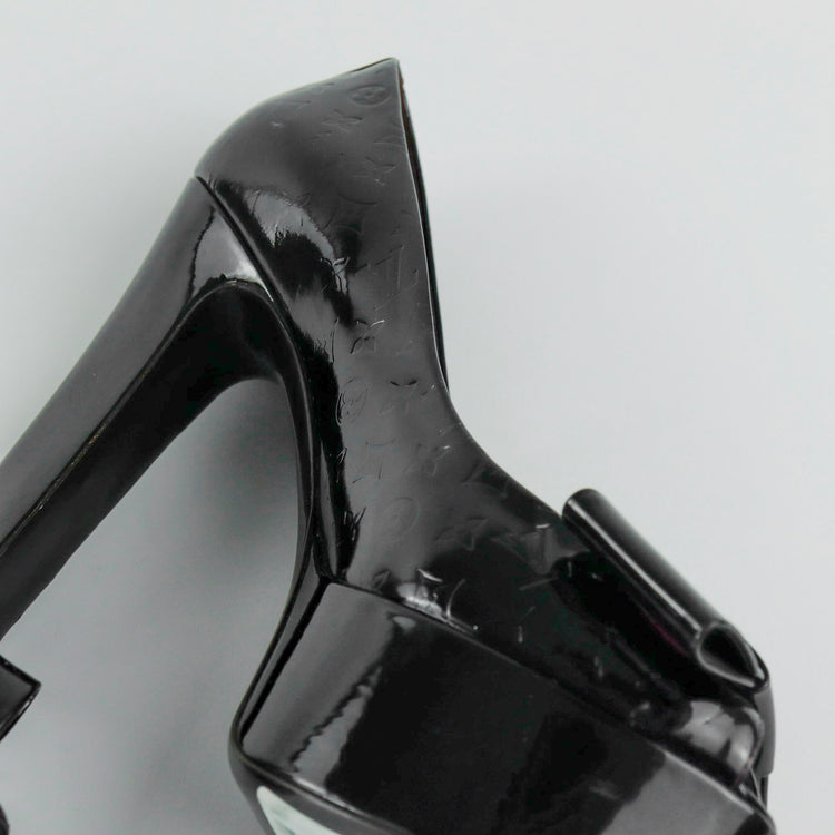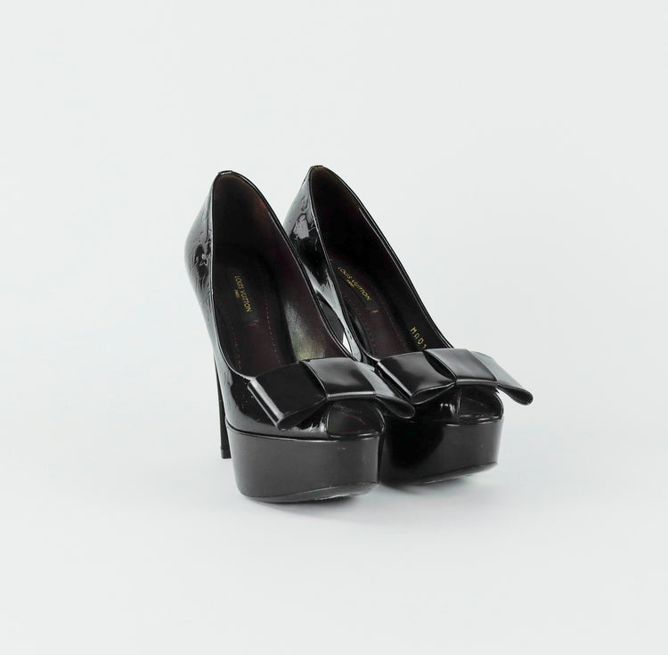 Zapatos de tacón peep toe Louis Vuitton, confeccionados en monograma vernis amarante, con adorno de moño en el empeine, leves detalles en suela por poco uso.