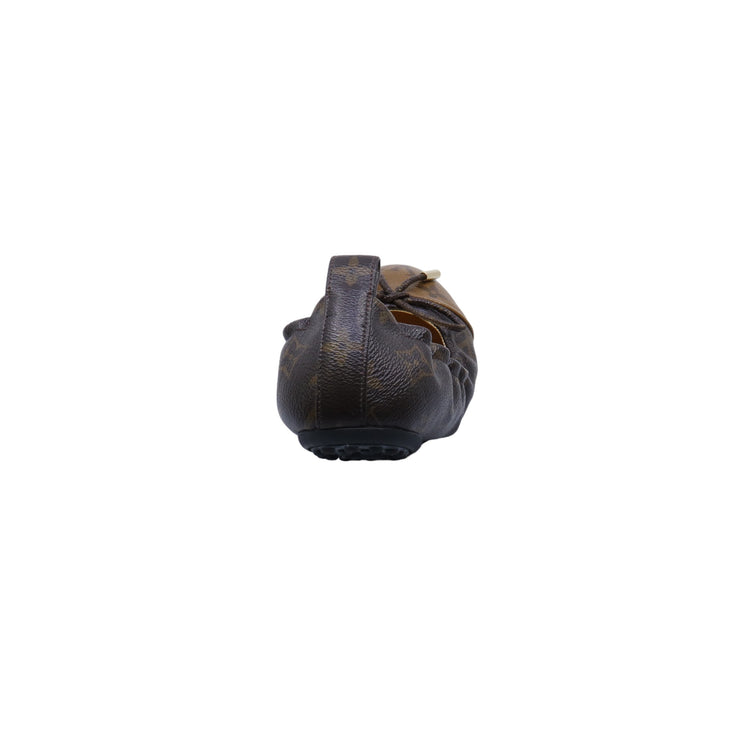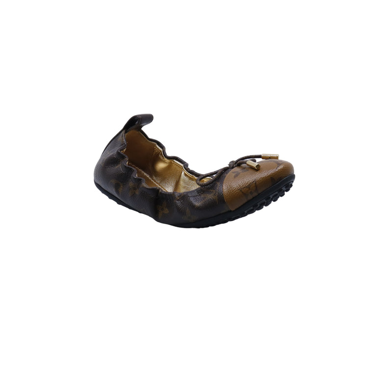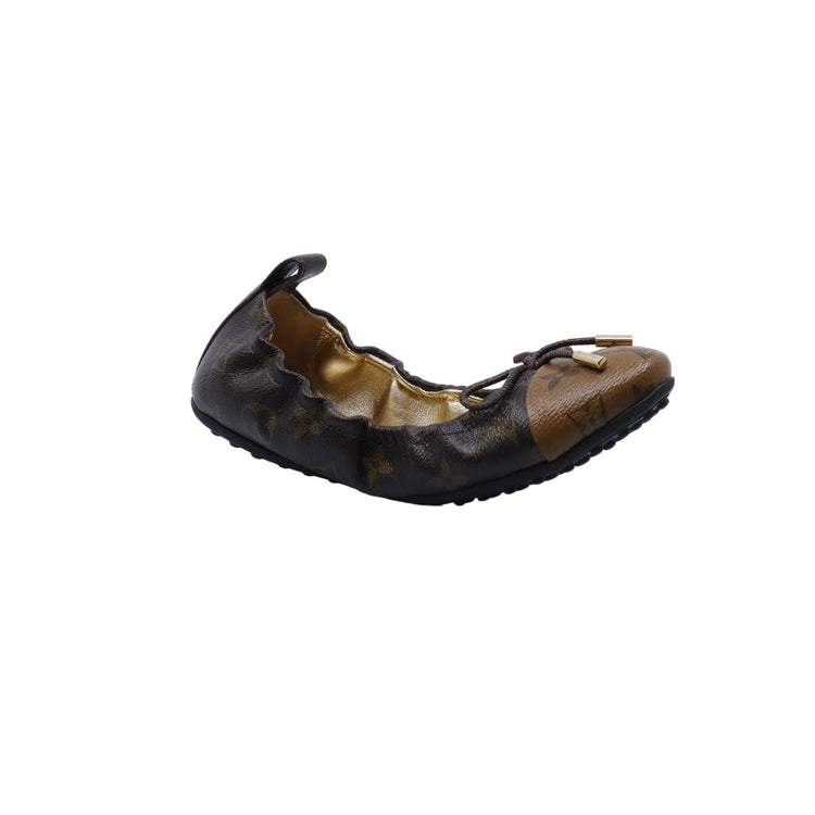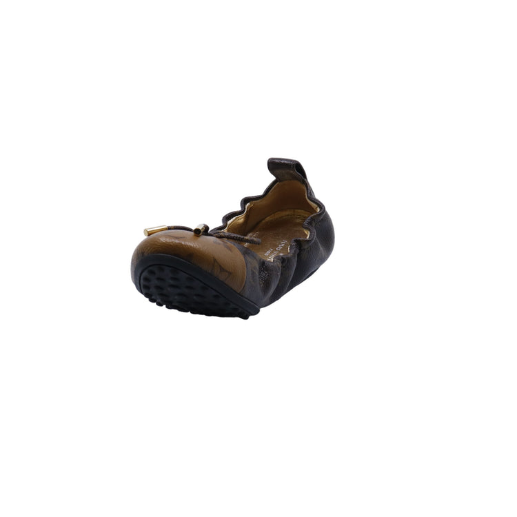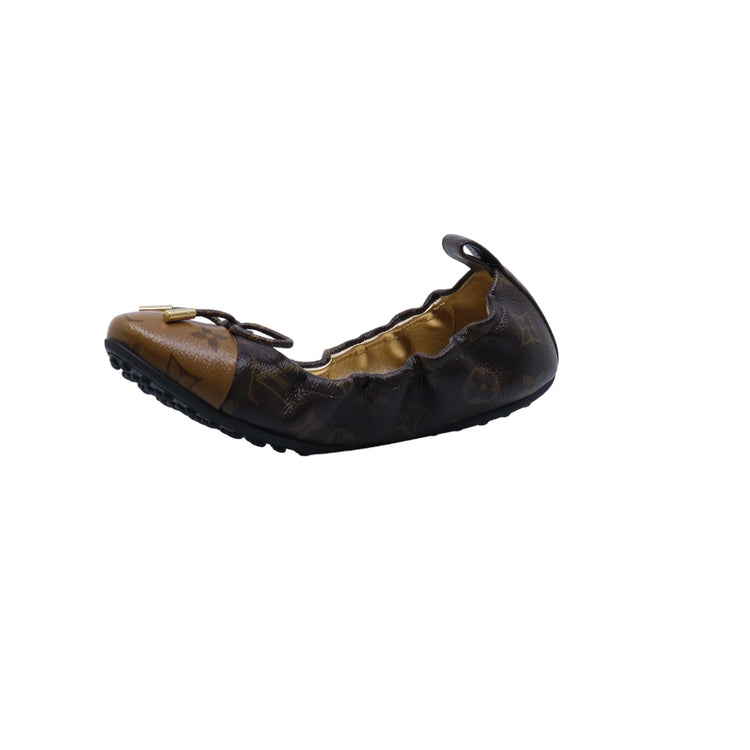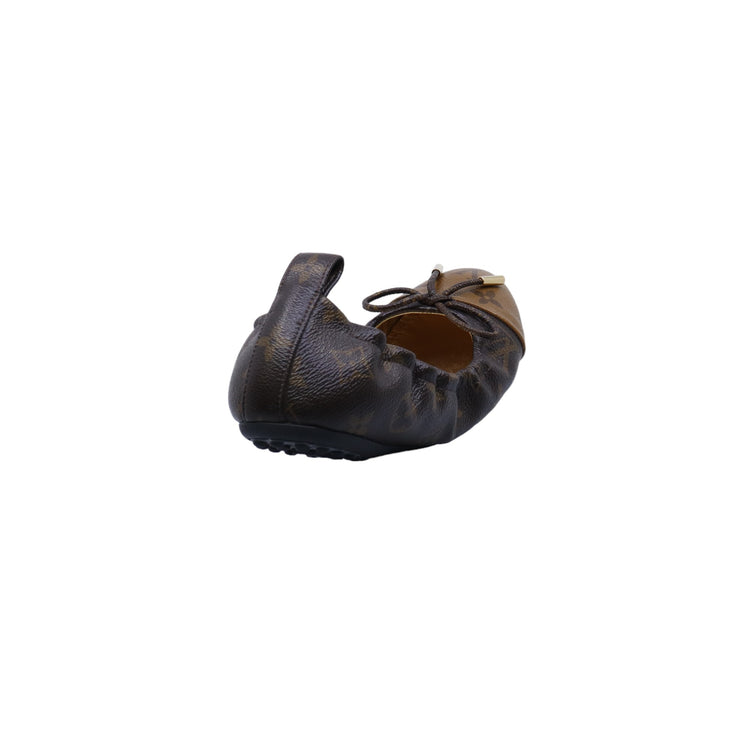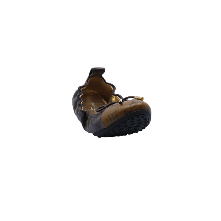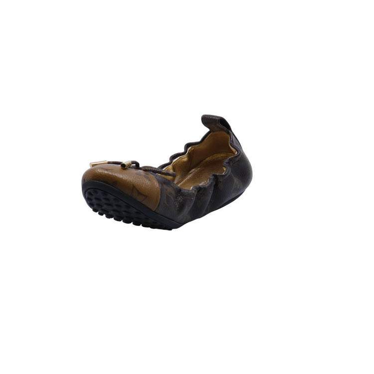 Zapato tipo bailarina de la marca Louis Vuitton confeccionado en piel con canvas monogram, ajuste completo con elástico en contorno, suela de caucho. CALZADO DE SEGUNDA MANO EN BUEN ESTADO. Cuenta con cubre polvo.