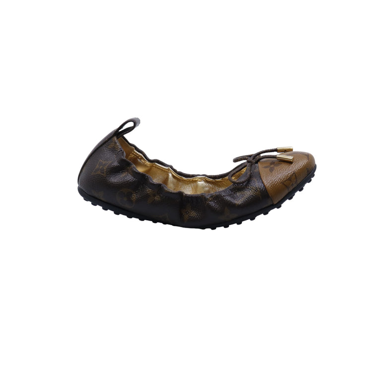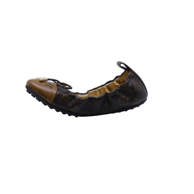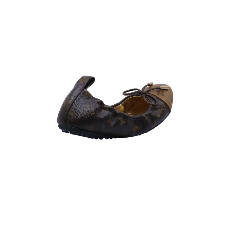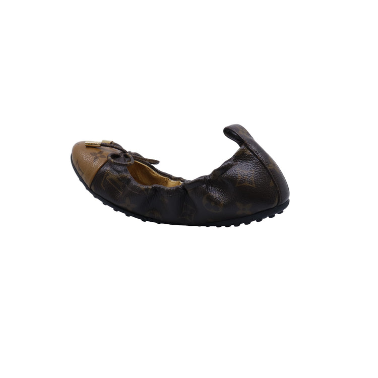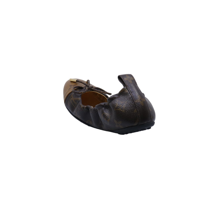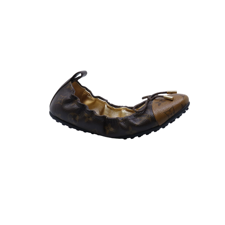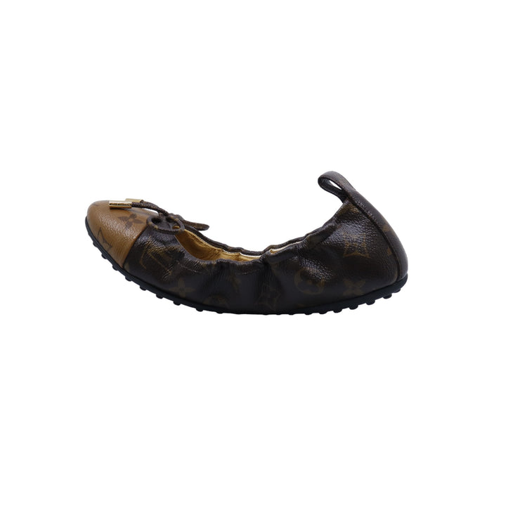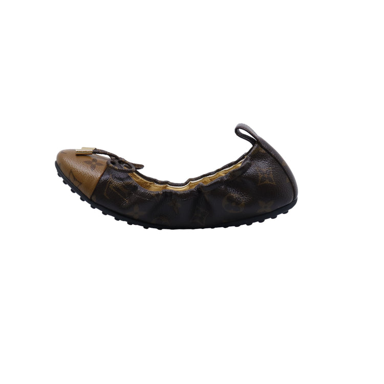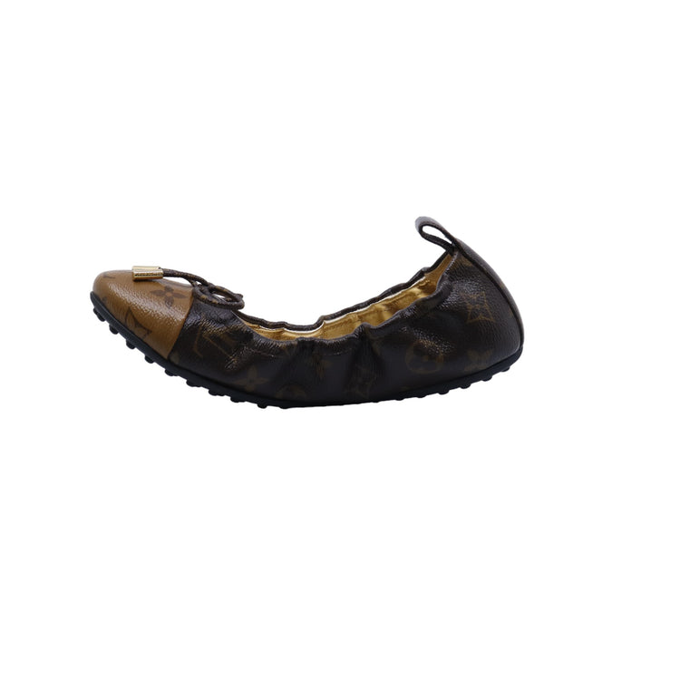 Zapato tipo bailarina de la marca Louis Vuitton confeccionado en piel con canvas monogram, ajuste completo con elástico en contorno, suela de caucho. CALZADO DE SEGUNDA MANO EN BUEN ESTADO. Cuenta con cubre polvo.