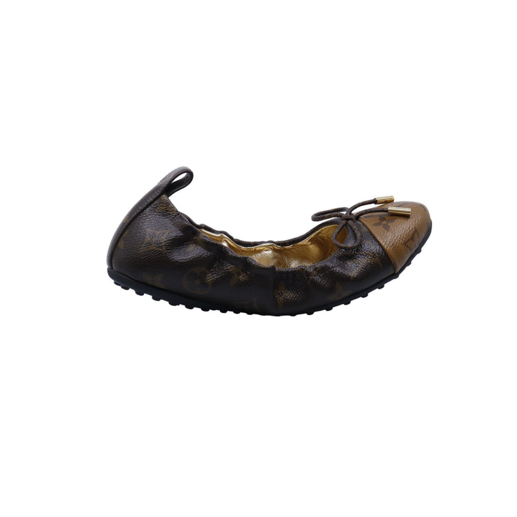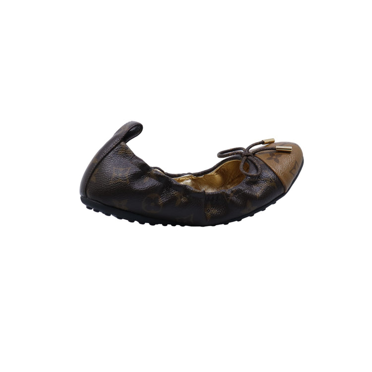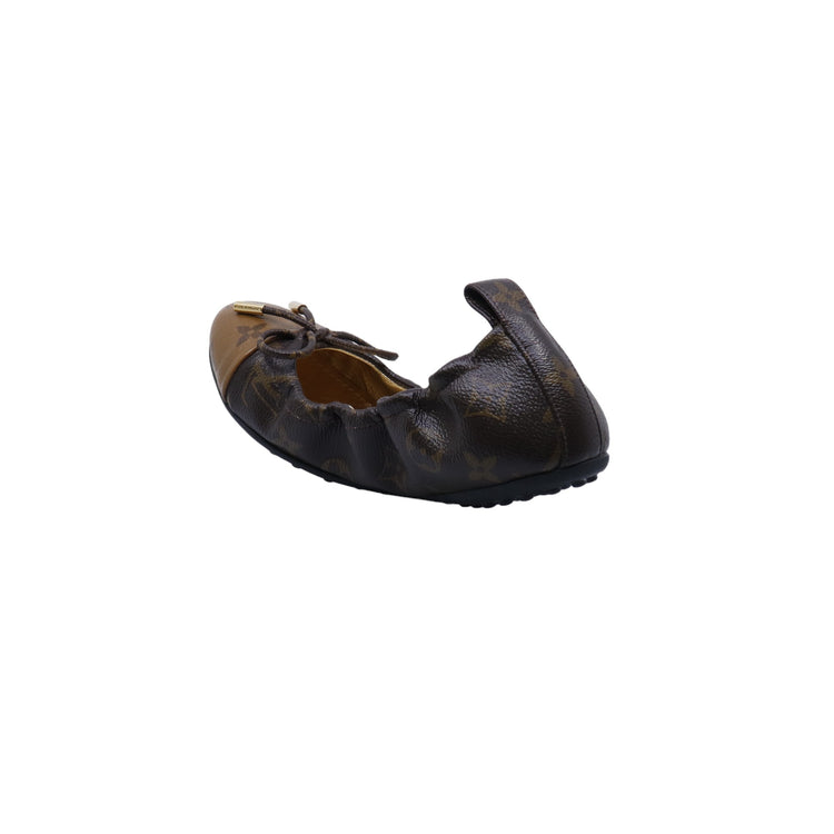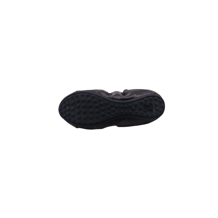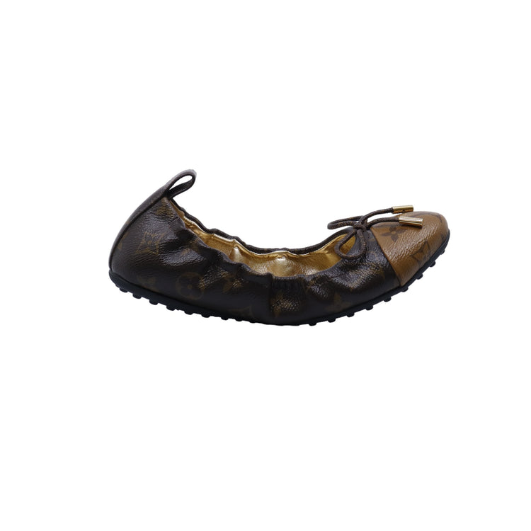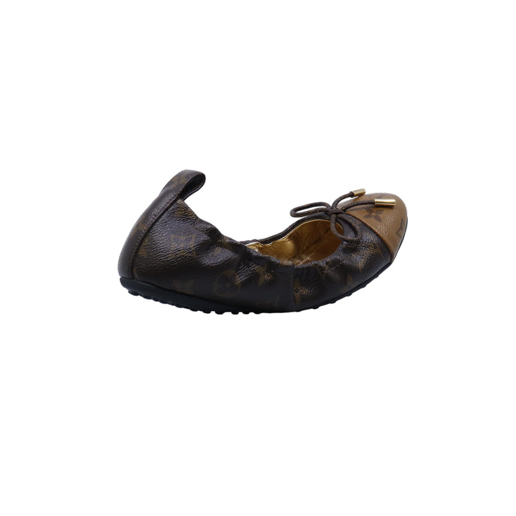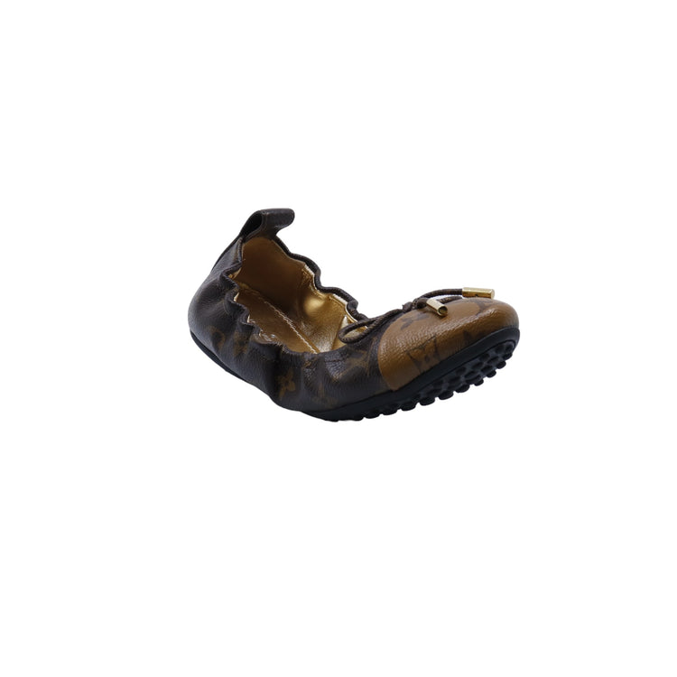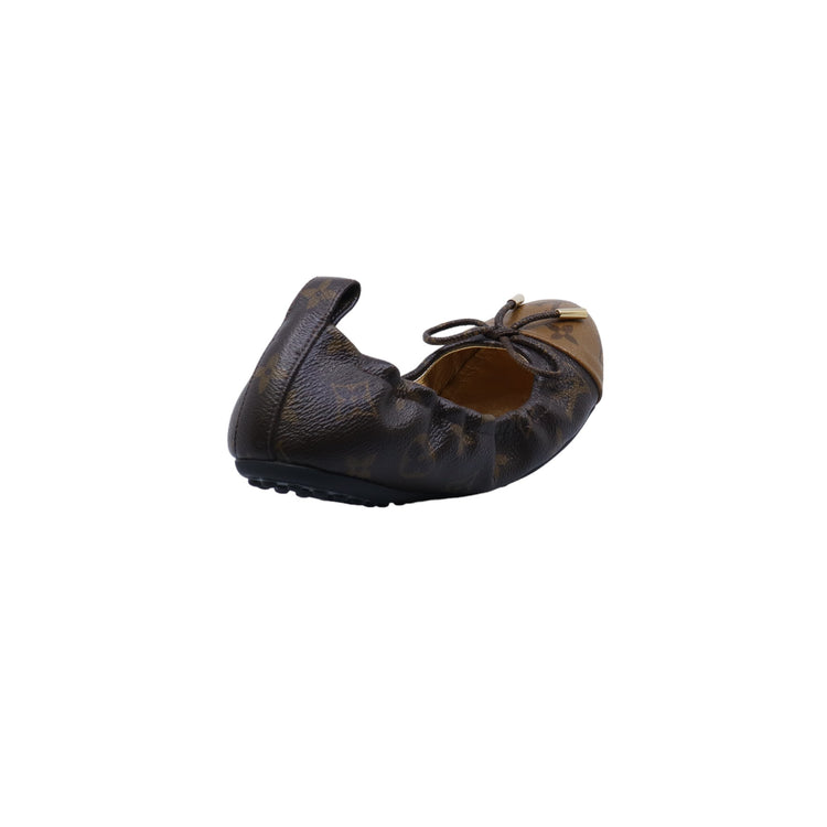 Zapato tipo bailarina de la marca Louis Vuitton confeccionado en piel con canvas monogram, ajuste completo con elástico en contorno, suela de caucho. CALZADO DE SEGUNDA MANO EN BUEN ESTADO. Cuenta con cubre polvo.