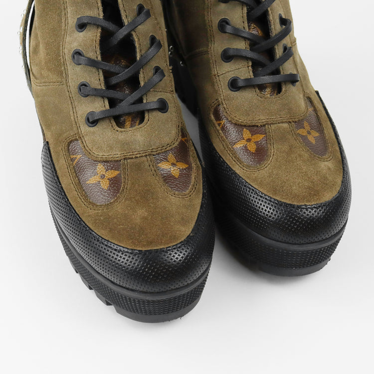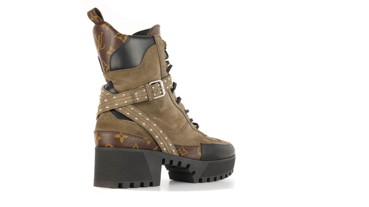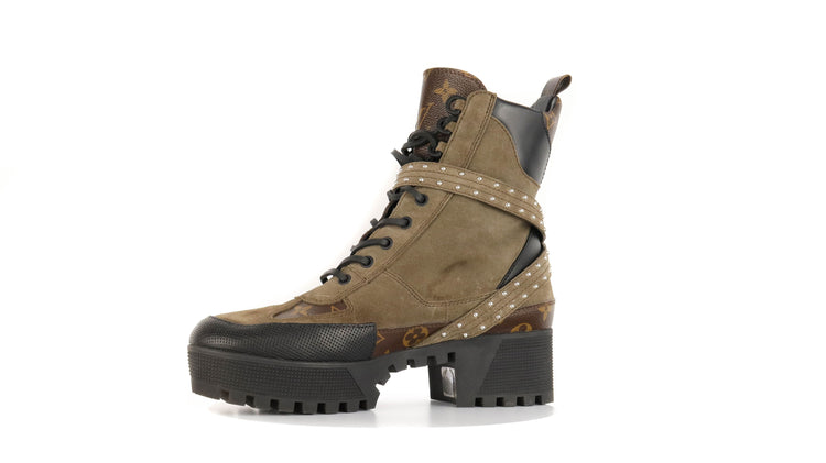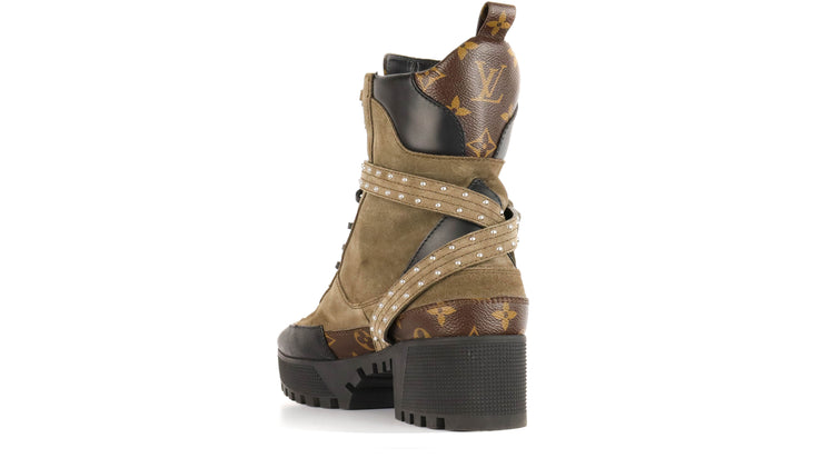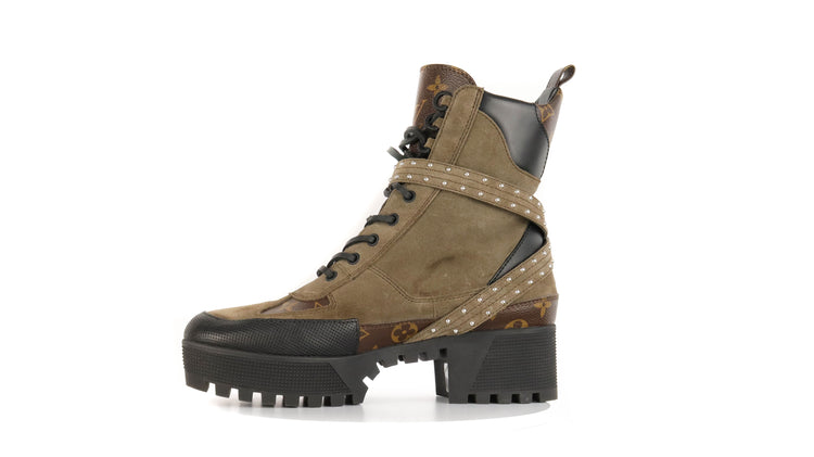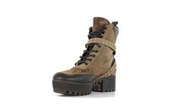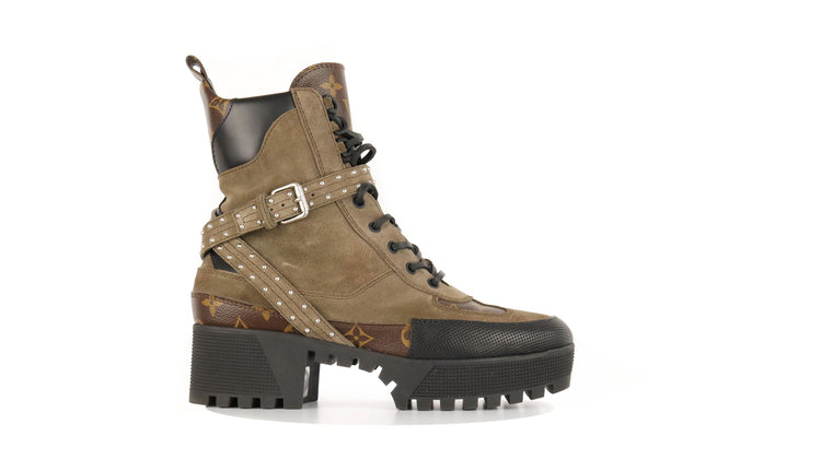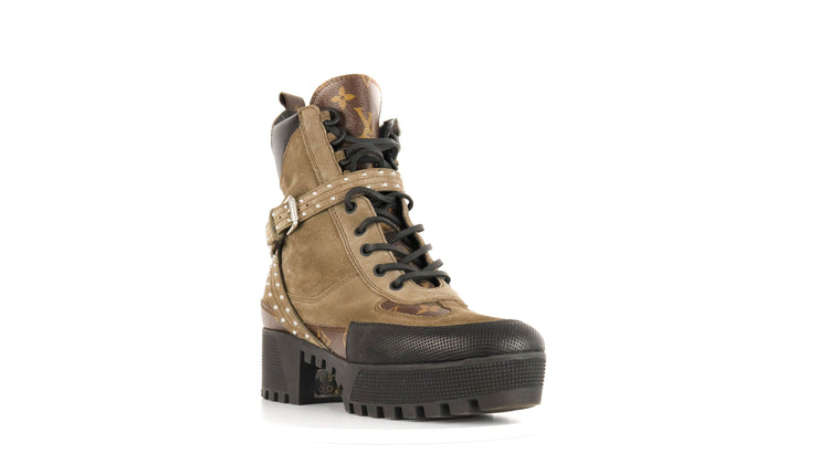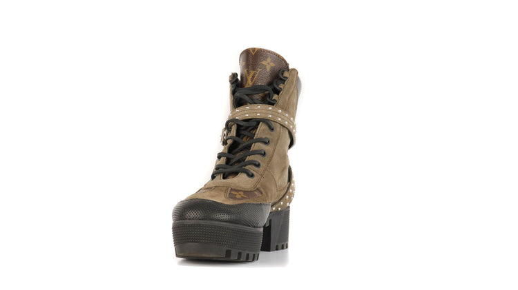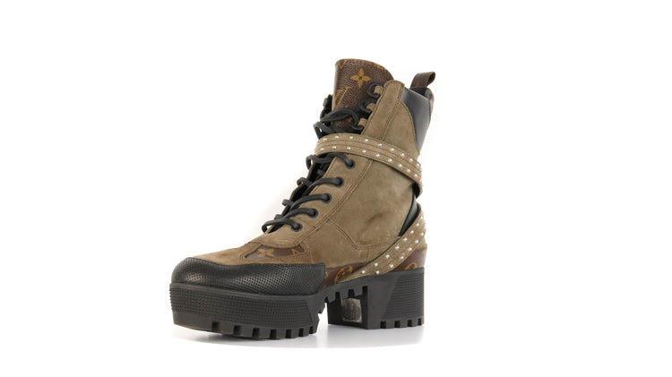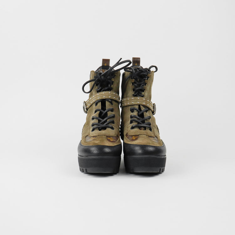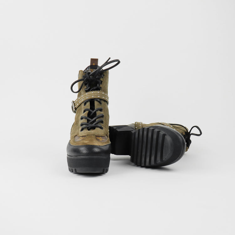 Botas de desierto marca Louis Vuitton, confeccionadas en piel natural tipo gamuza en color verde caqui combinado con lona monogram, el modelo se distingue por su suela estriada con plataforma. Cordones ajustables, cinta con hebilla en el mismo material de las botas, adornada con estoperoles.