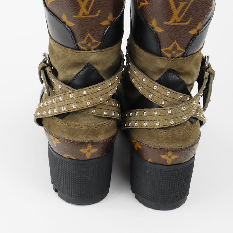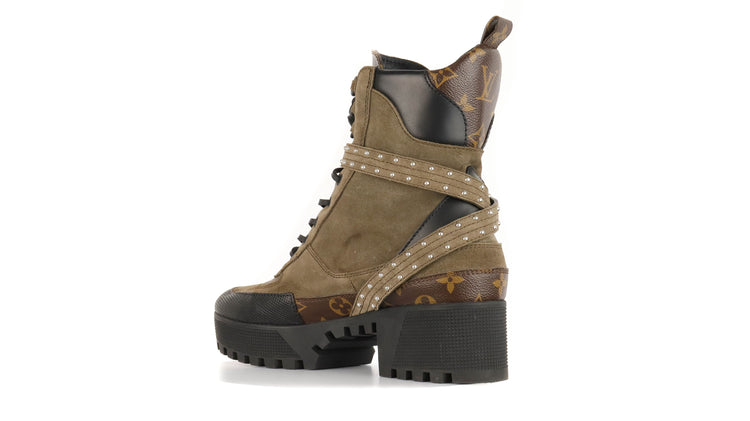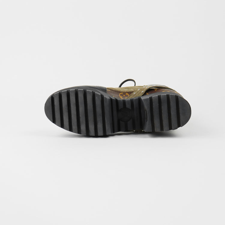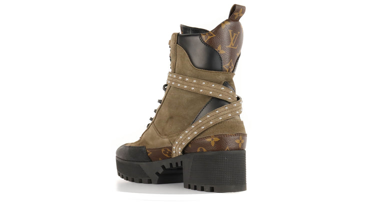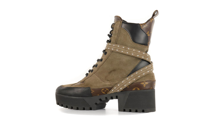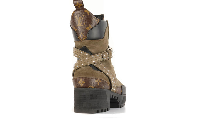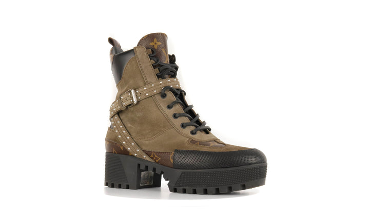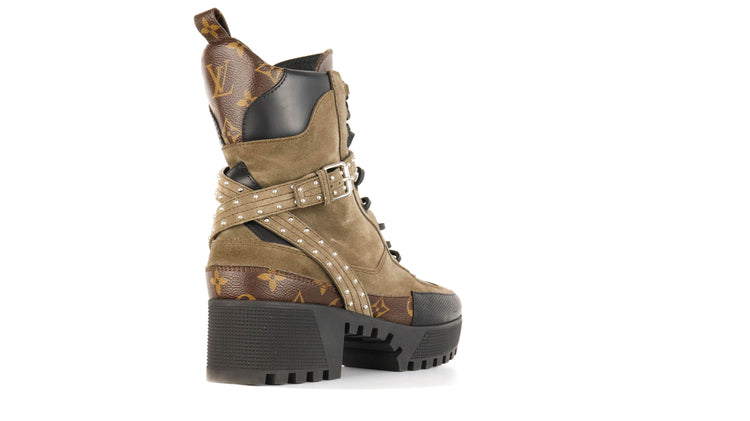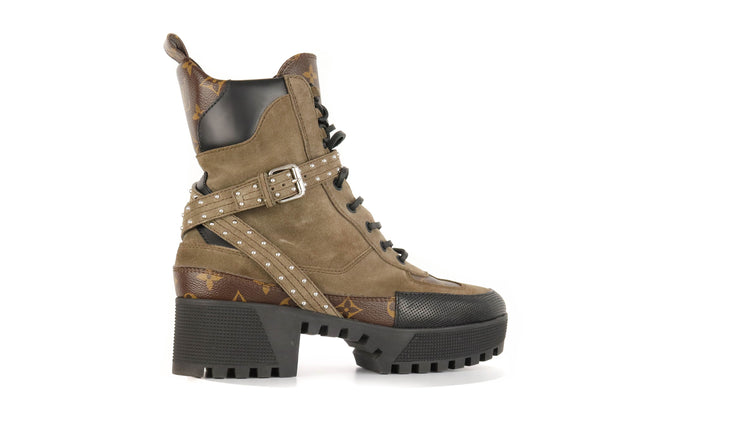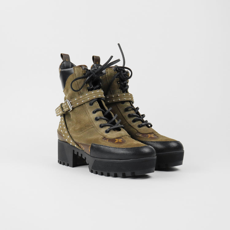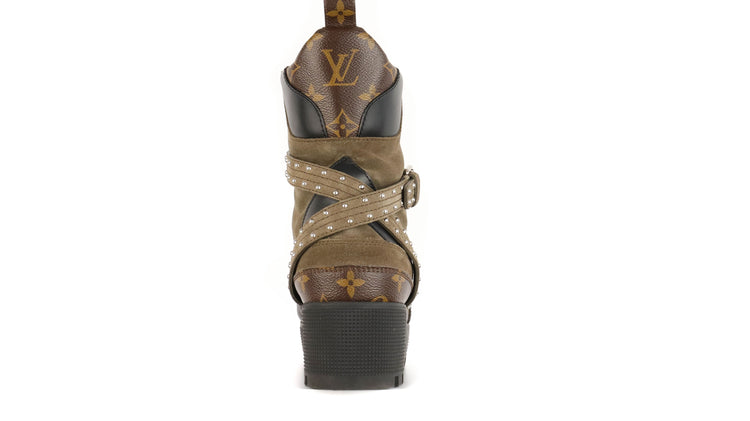 Botas de desierto marca Louis Vuitton, confeccionadas en piel natural tipo gamuza en color verde caqui combinado con lona monogram, el modelo se distingue por su suela estriada con plataforma. Cordones ajustables, cinta con hebilla en el mismo material de las botas, adornada con estoperoles.