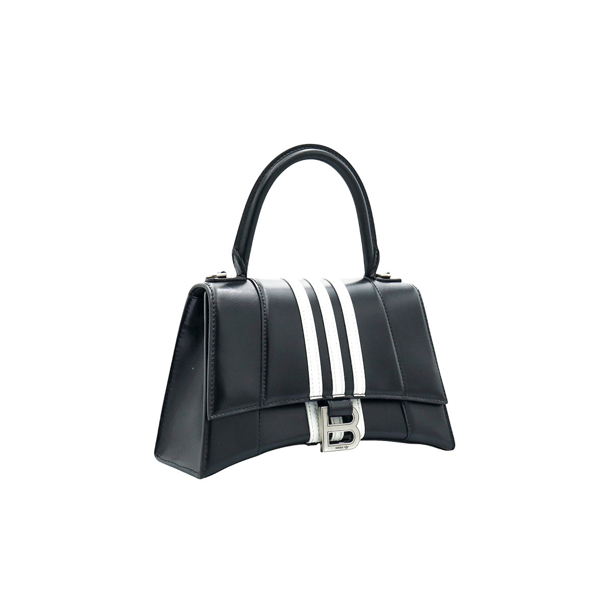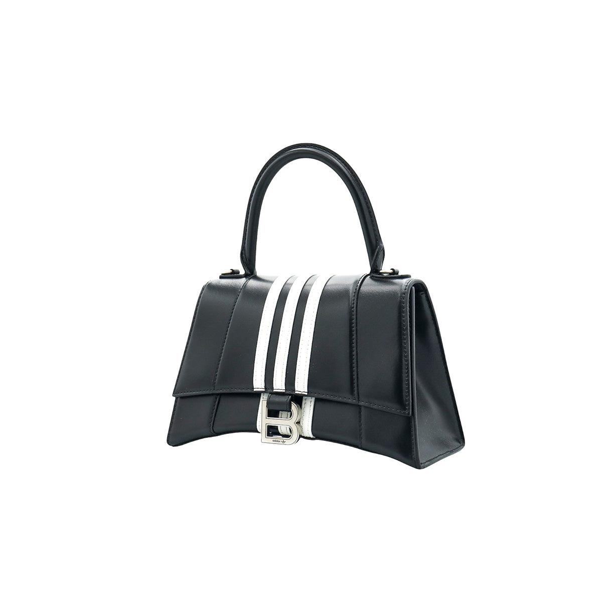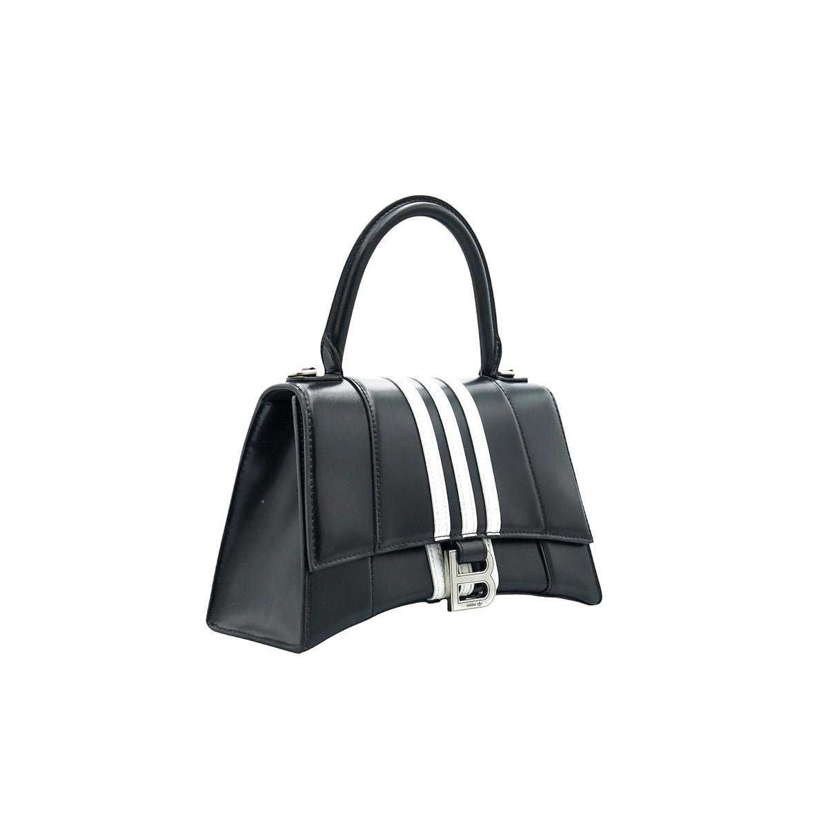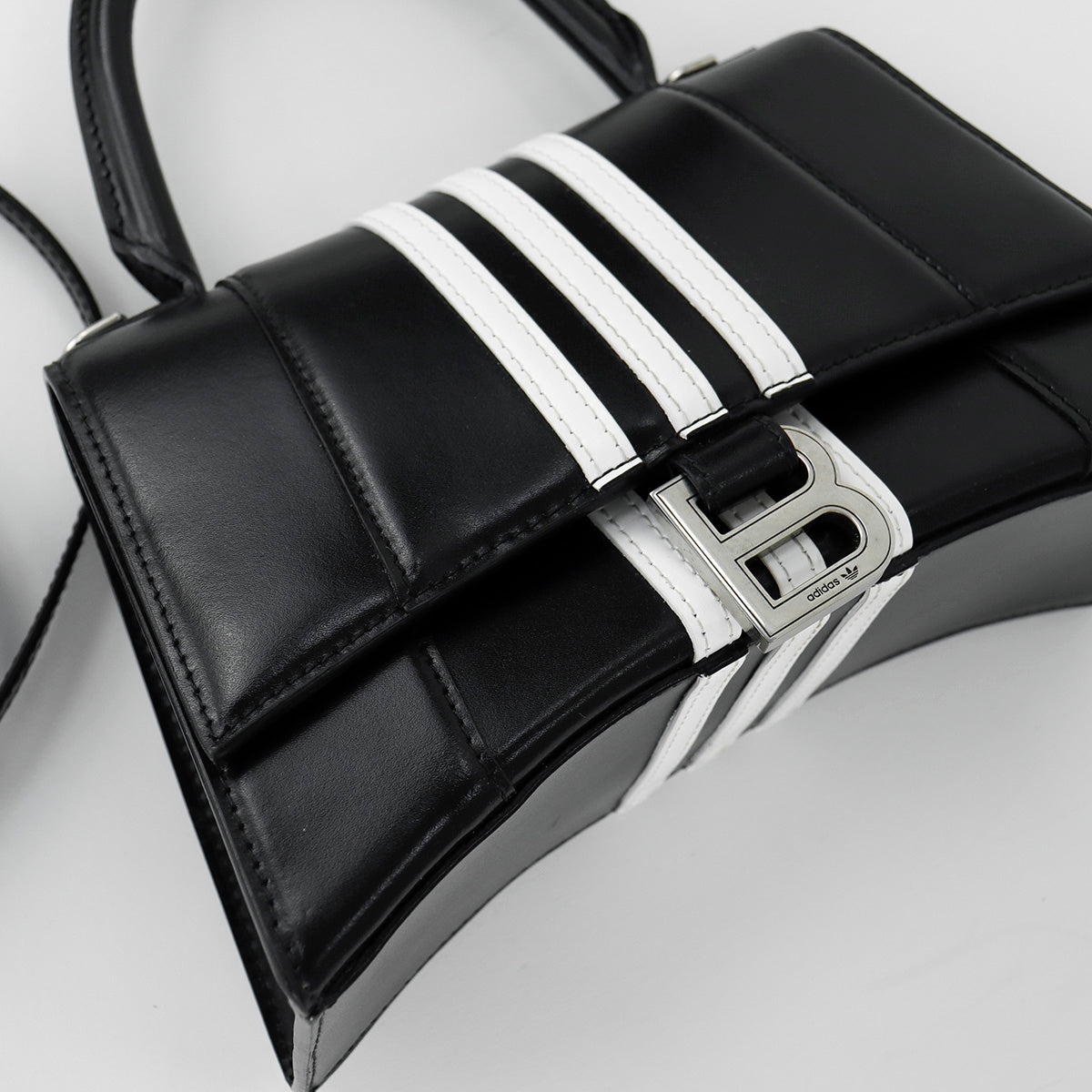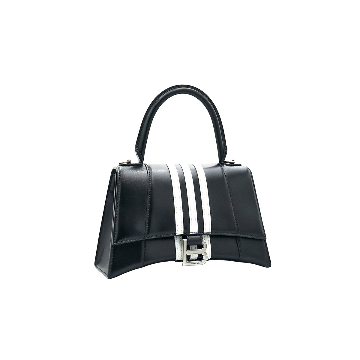 Bolso Hourglass en colaboración Balenciaga X Adidas edición limitada, confeccionado en piel color negro con las 3 franjas distintivas de la marca en solapa y parte trasera, con 1 asa rígida y correa para llevar al hombro, cierre magnético en la solapa con la B y herrajes en color plata avejentado, con leves manchas de maquillaje al interior.