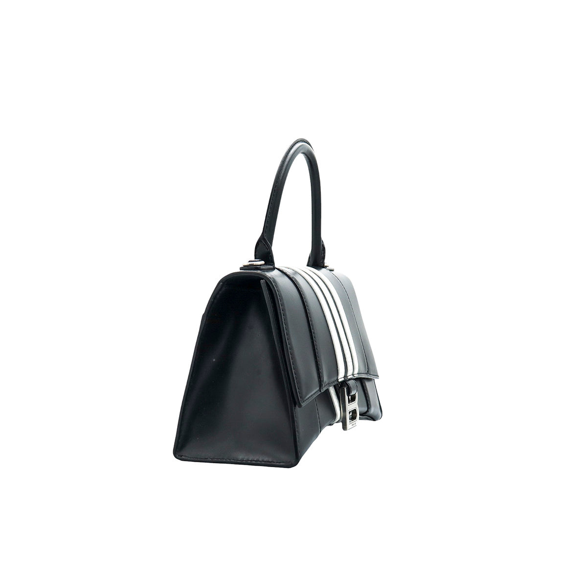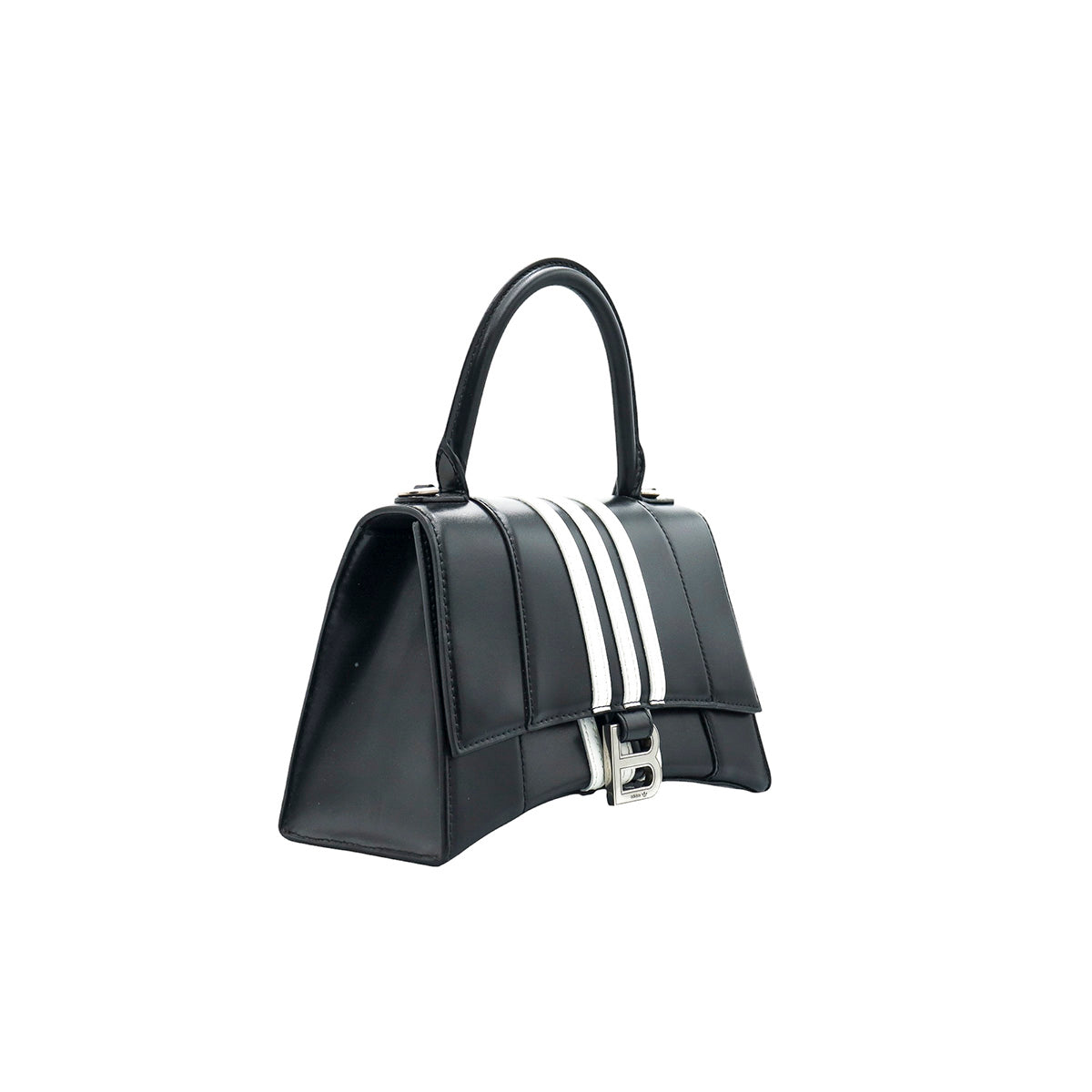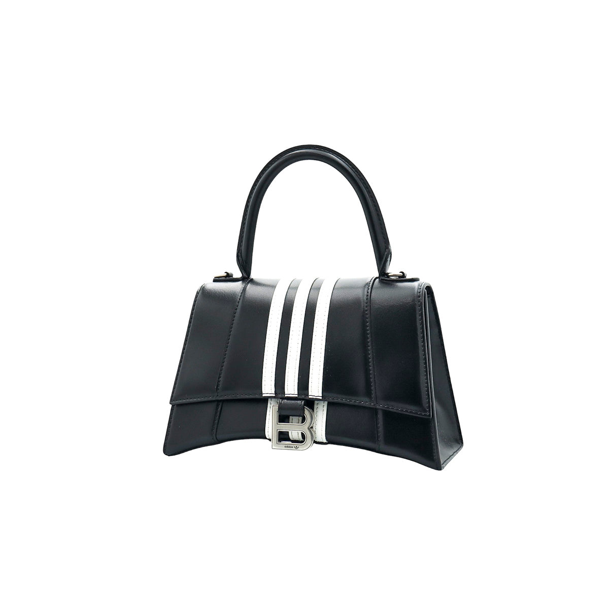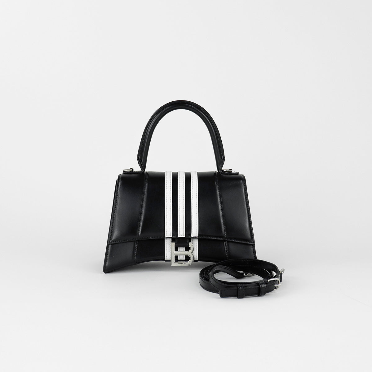 Bolso Hourglass en colaboración Balenciaga X Adidas edición limitada, confeccionado en piel color negro con las 3 franjas distintivas de la marca en solapa y parte trasera, con 1 asa rígida y correa para llevar al hombro, cierre magnético en la solapa con la B y herrajes en color plata avejentado, con leves manchas de maquillaje al interior.