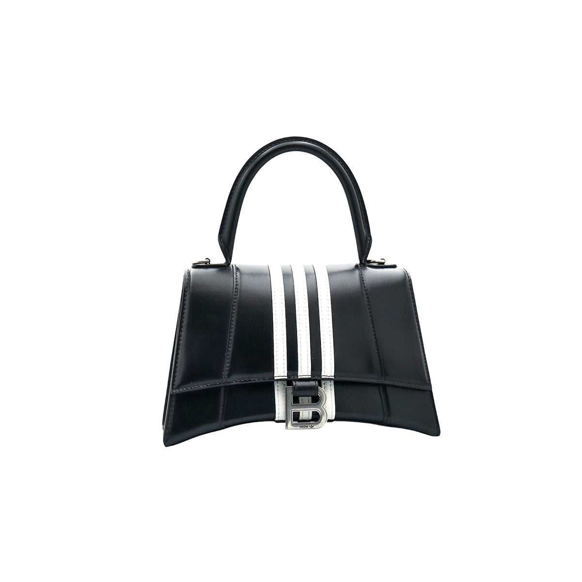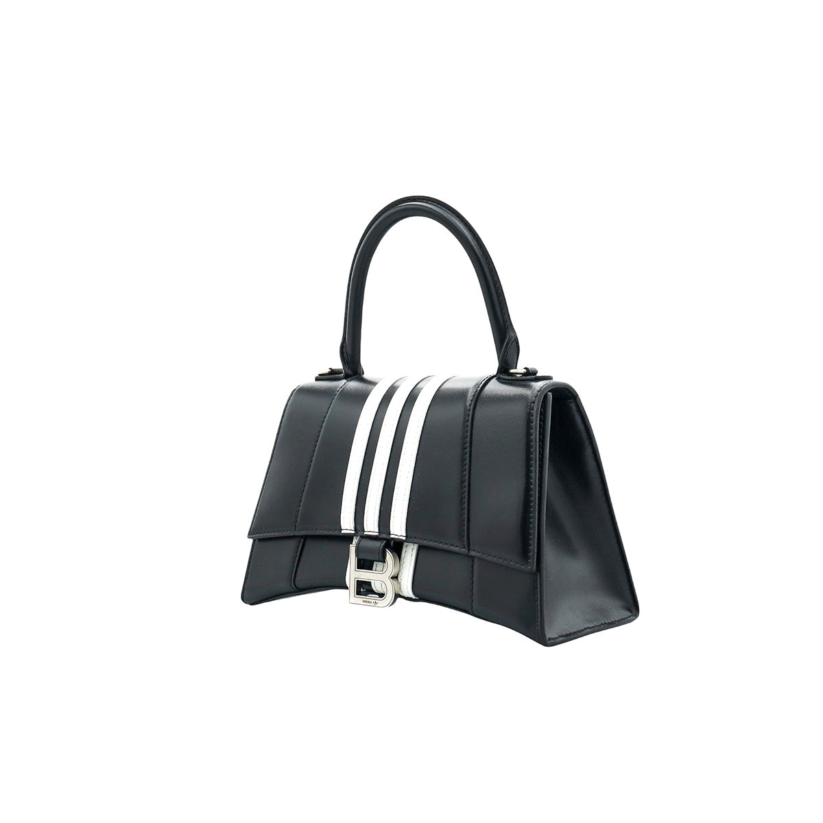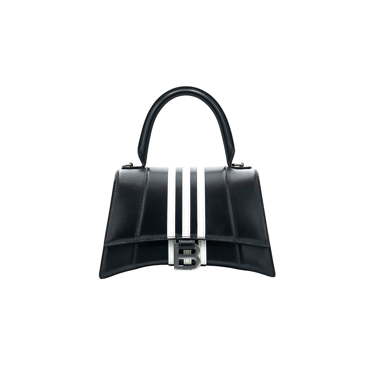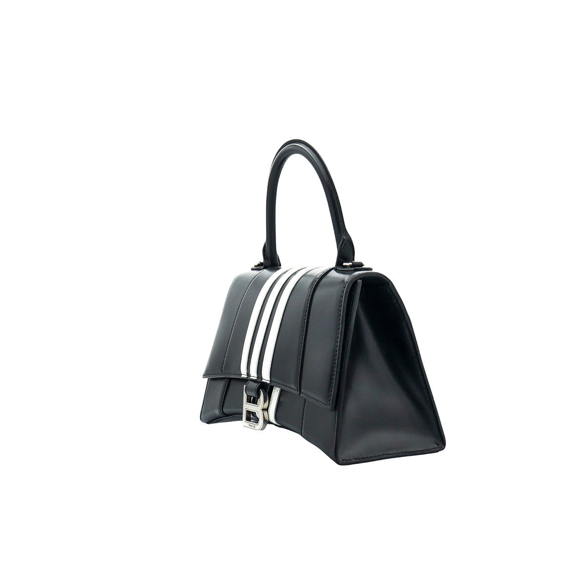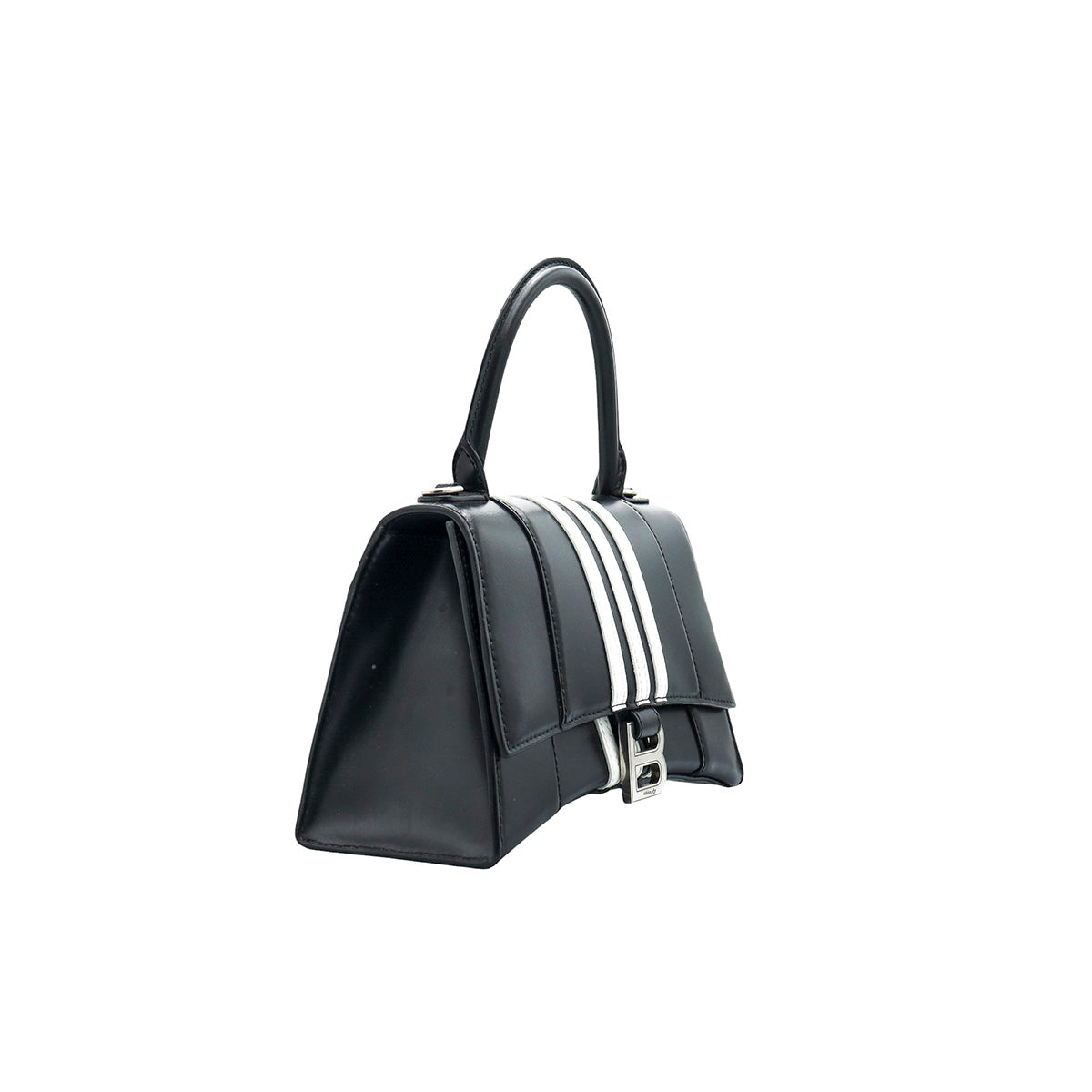 Bolso Hourglass en colaboración Balenciaga X Adidas edición limitada, confeccionado en piel color negro con las 3 franjas distintivas de la marca en solapa y parte trasera, con 1 asa rígida y correa para llevar al hombro, cierre magnético en la solapa con la B y herrajes en color plata avejentado, con leves manchas de maquillaje al interior.