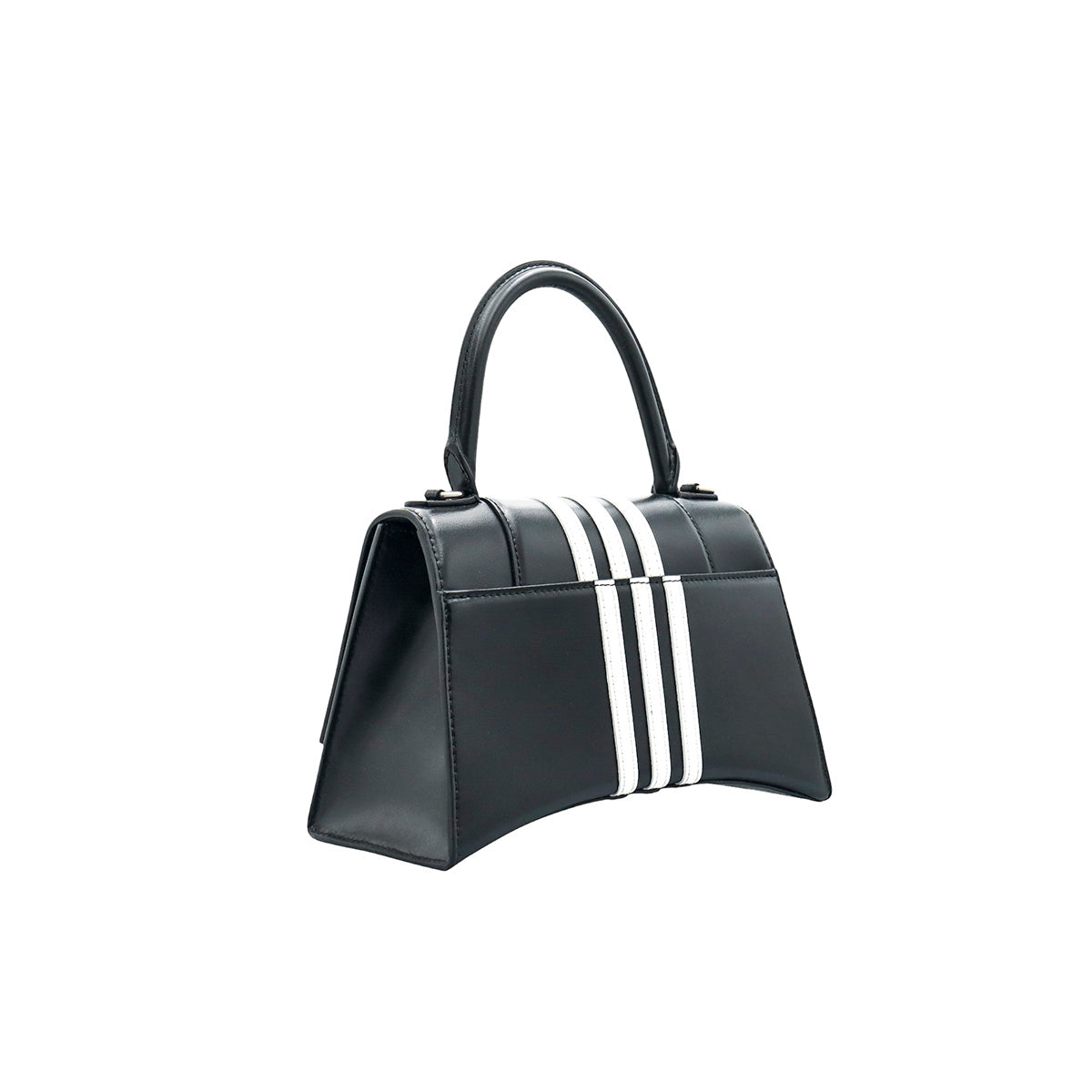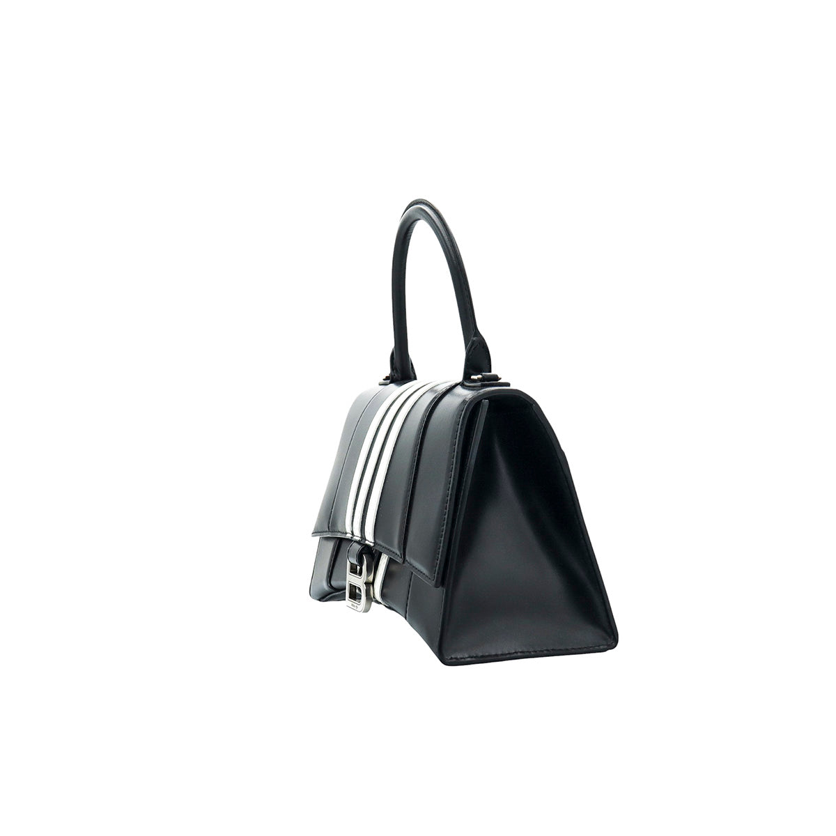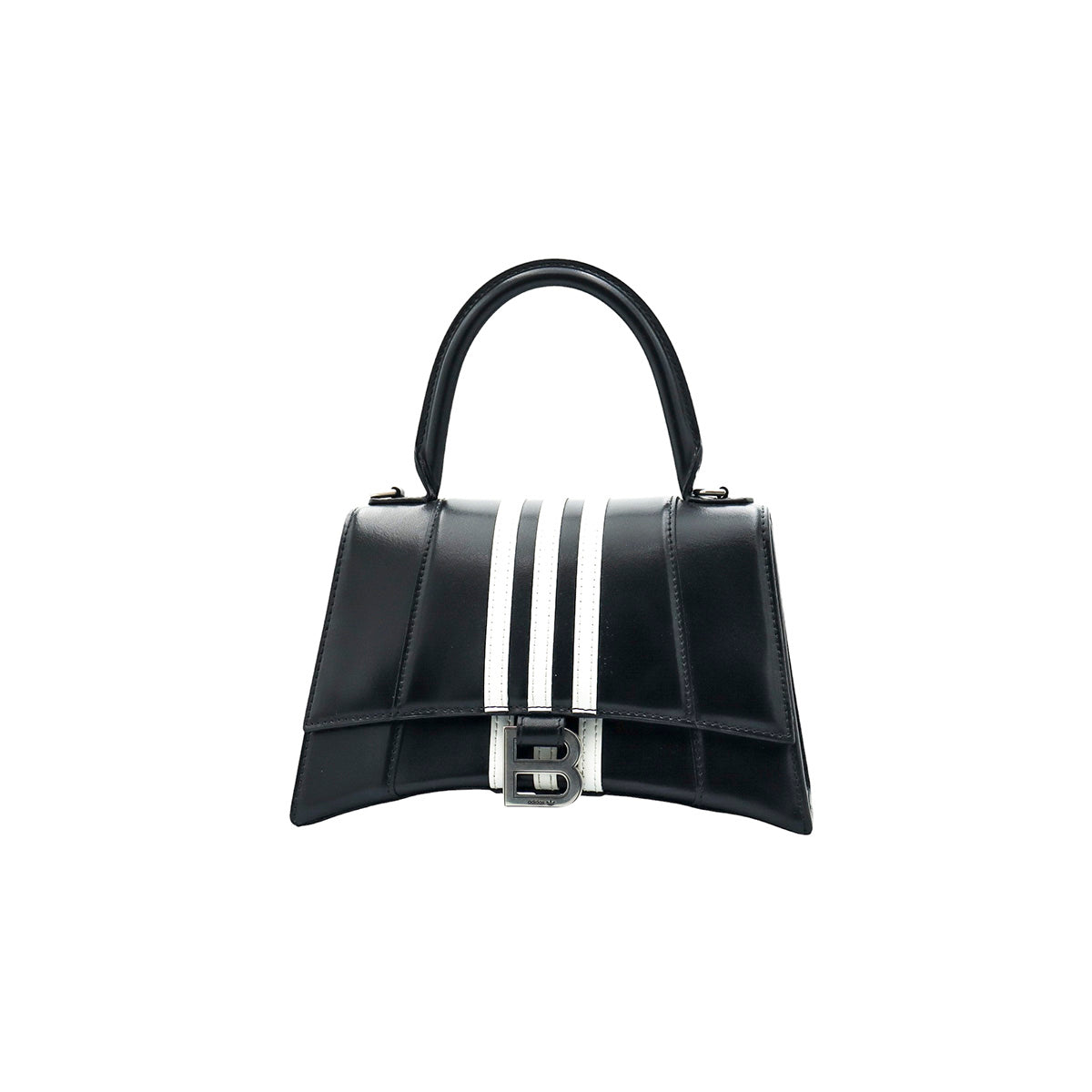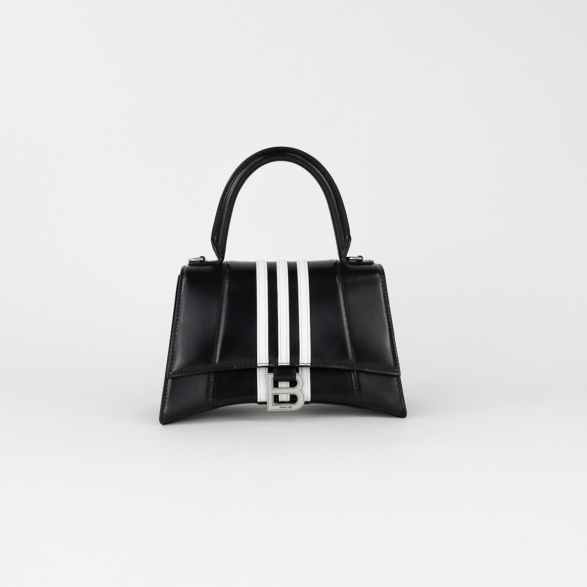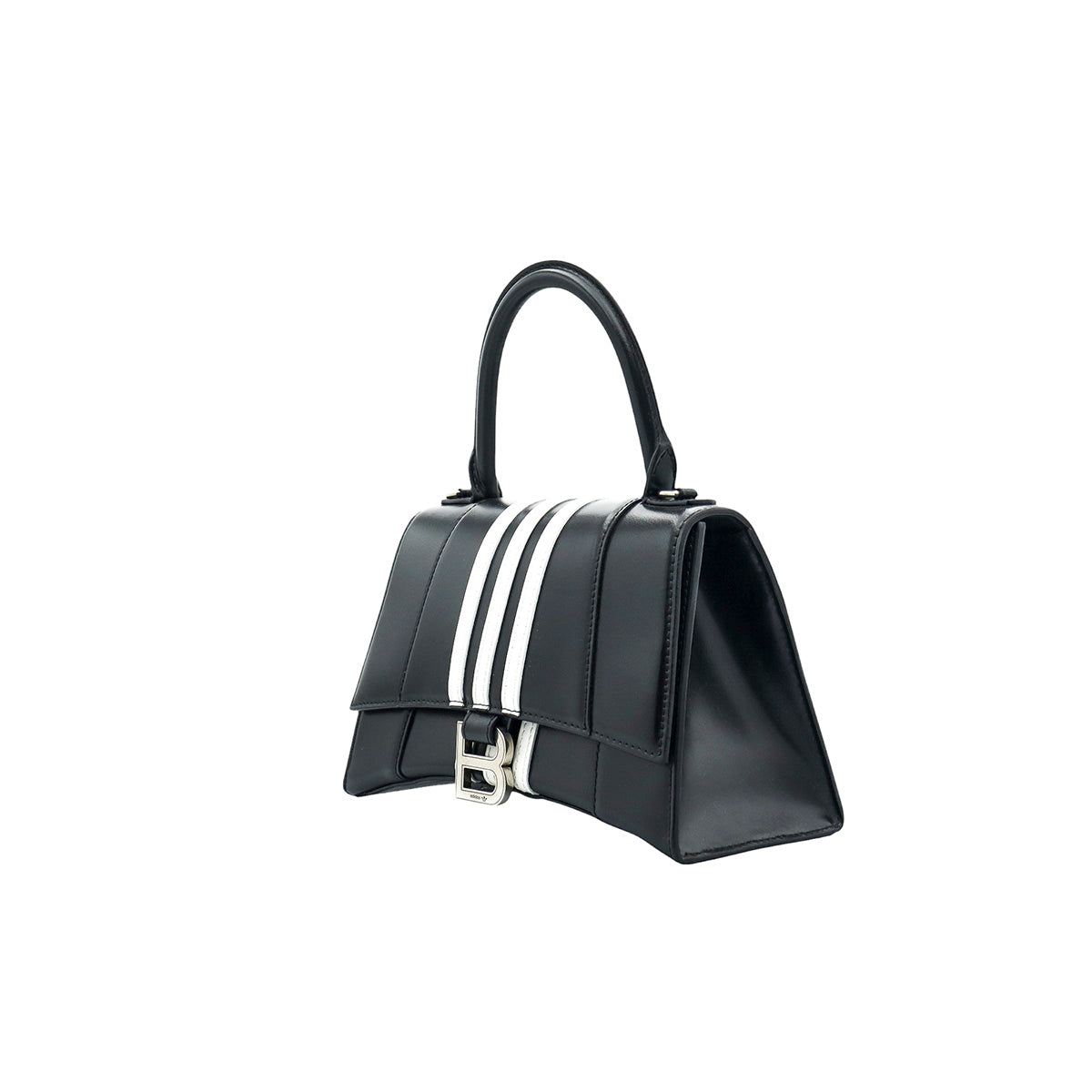 Bolso Hourglass en colaboración Balenciaga X Adidas edición limitada, confeccionado en piel color negro con las 3 franjas distintivas de la marca en solapa y parte trasera, con 1 asa rígida y correa para llevar al hombro, cierre magnético en la solapa con la B y herrajes en color plata avejentado, con leves manchas de maquillaje al interior.