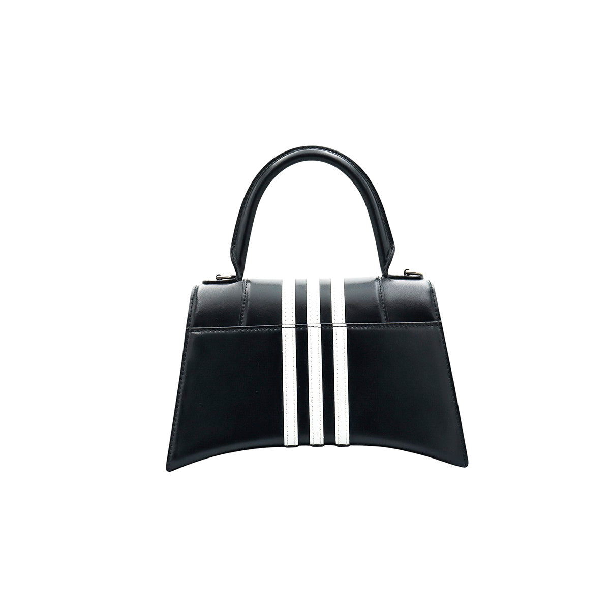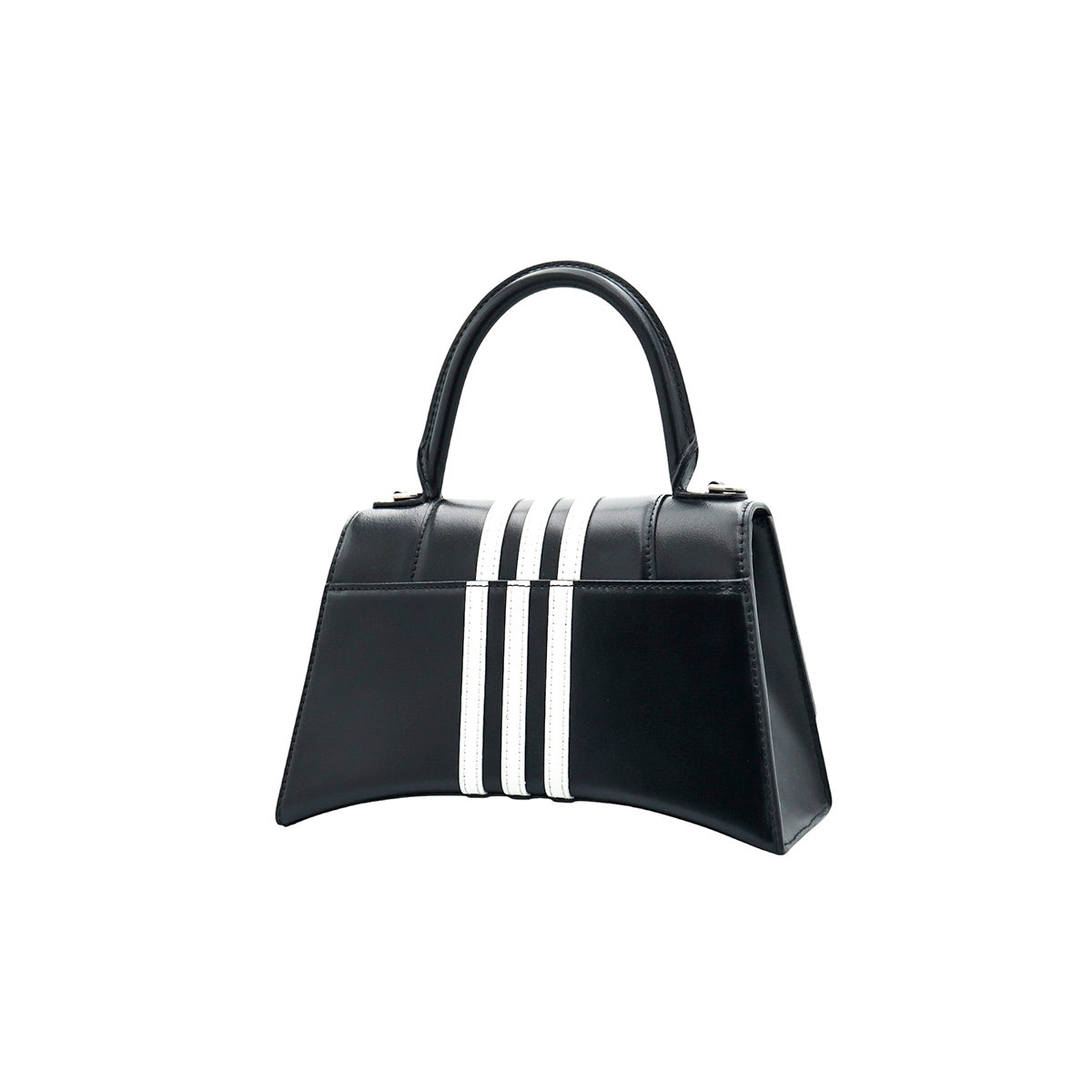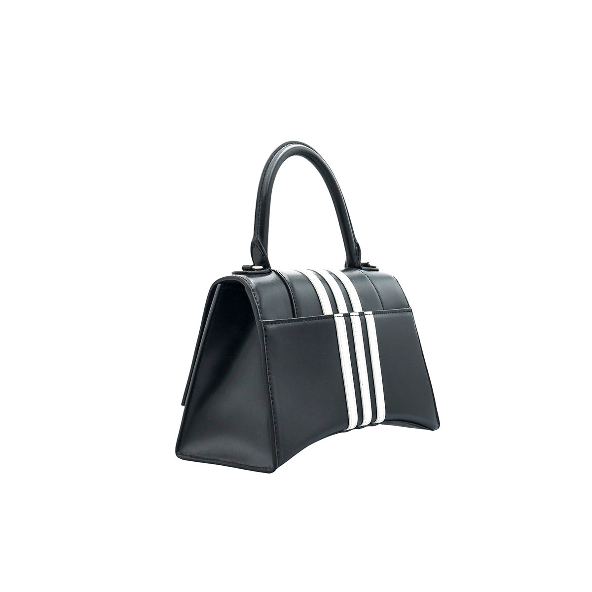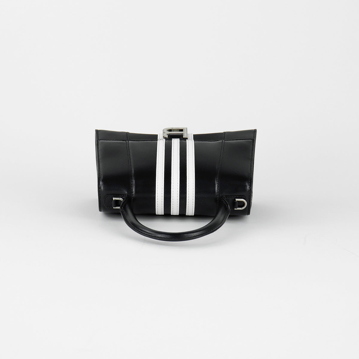 Bolso Hourglass en colaboración Balenciaga X Adidas edición limitada, confeccionado en piel color negro con las 3 franjas distintivas de la marca en solapa y parte trasera, con 1 asa rígida y correa para llevar al hombro, cierre magnético en la solapa con la B y herrajes en color plata avejentado, con leves manchas de maquillaje al interior.