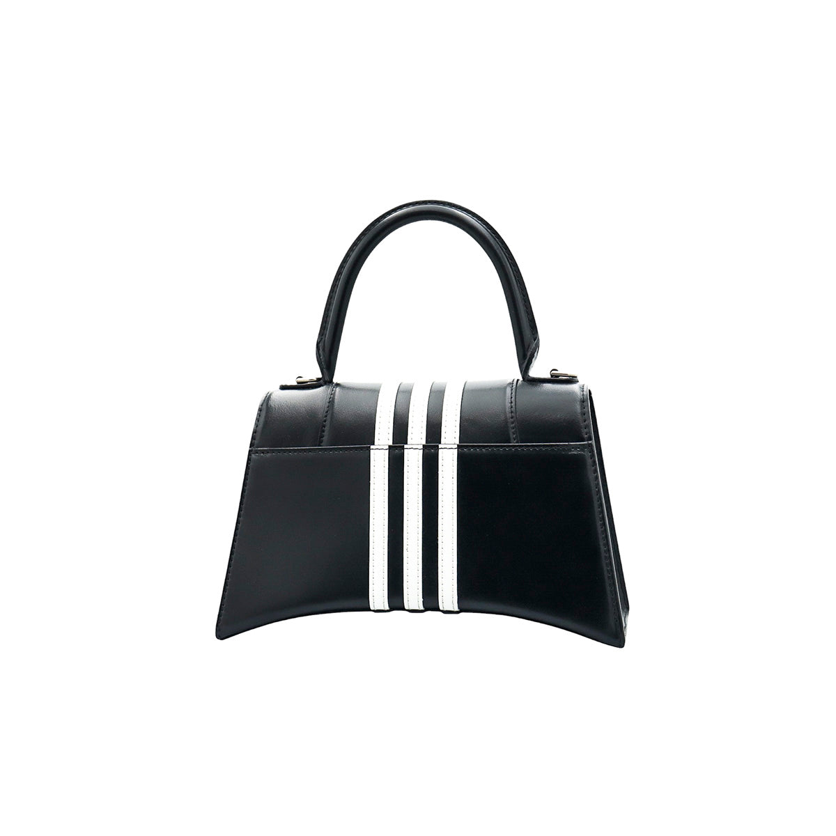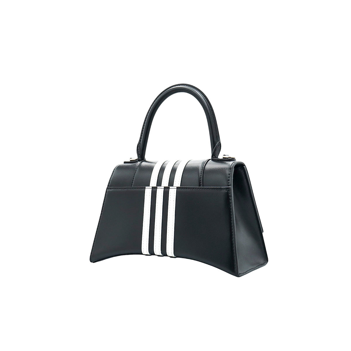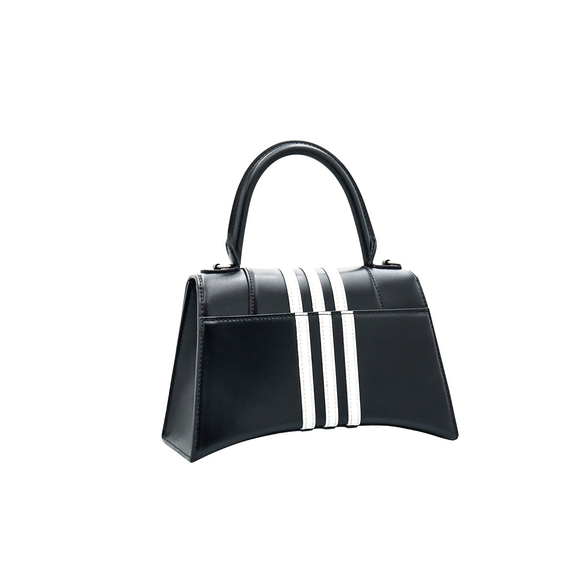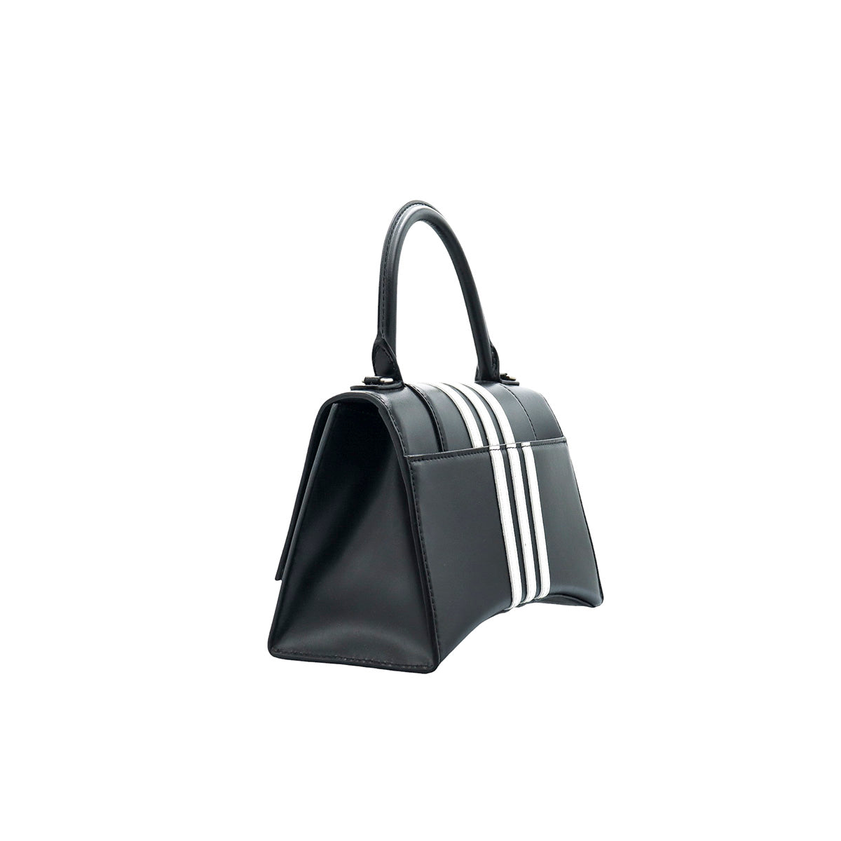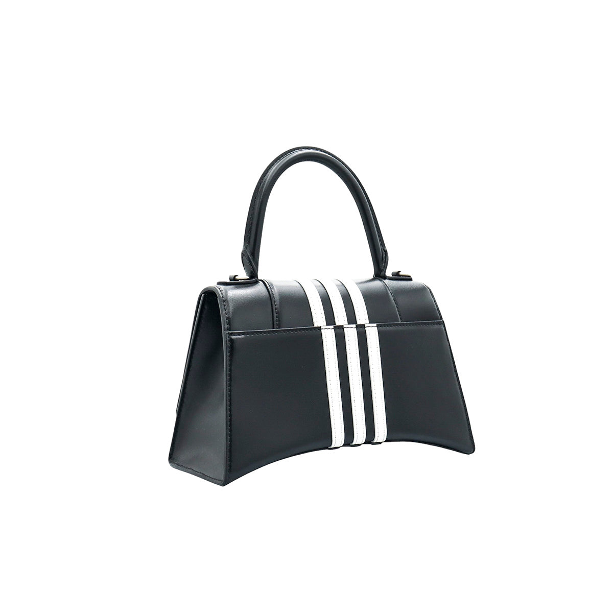 Bolso Hourglass en colaboración Balenciaga X Adidas edición limitada, confeccionado en piel color negro con las 3 franjas distintivas de la marca en solapa y parte trasera, con 1 asa rígida y correa para llevar al hombro, cierre magnético en la solapa con la B y herrajes en color plata avejentado, con leves manchas de maquillaje al interior.