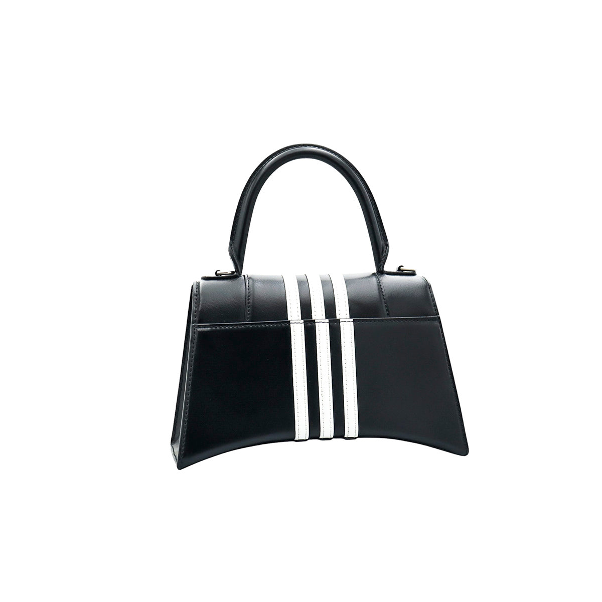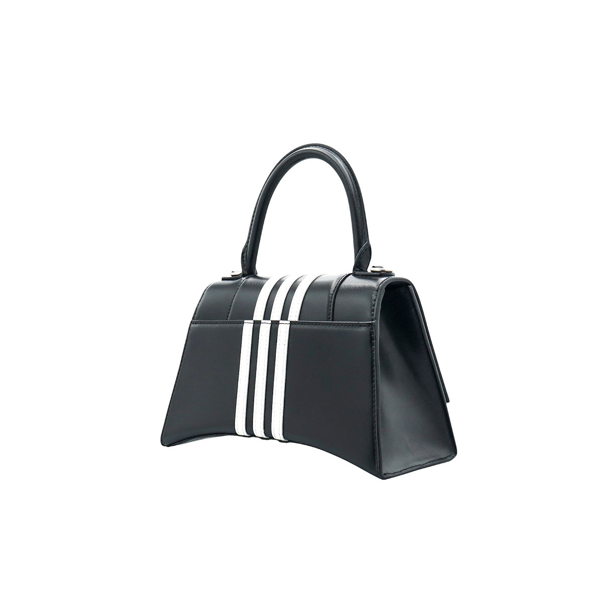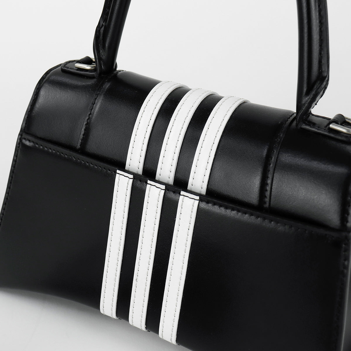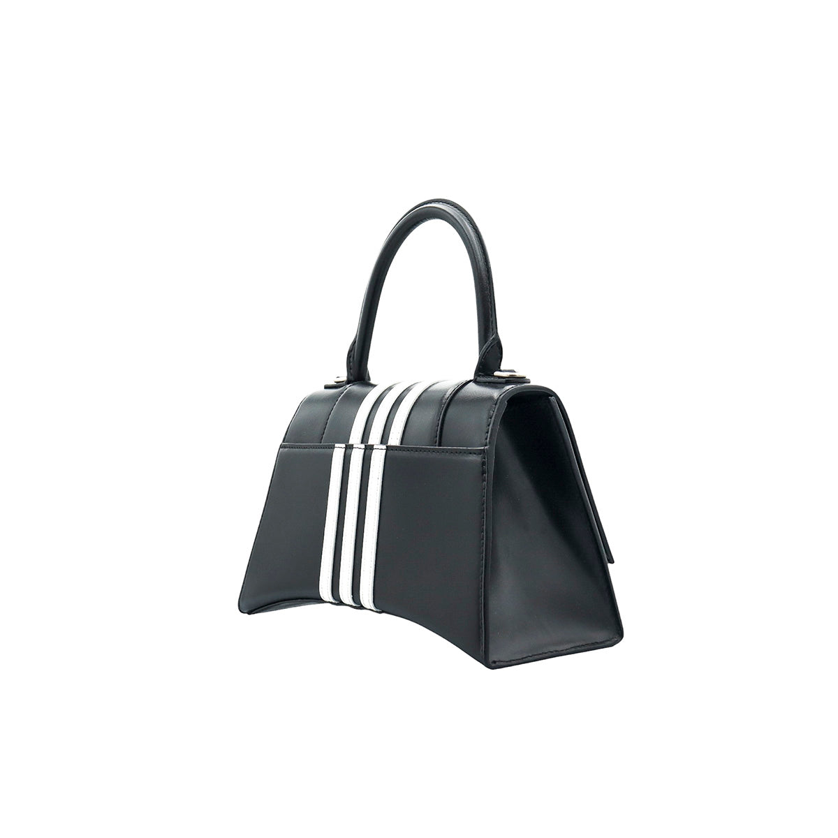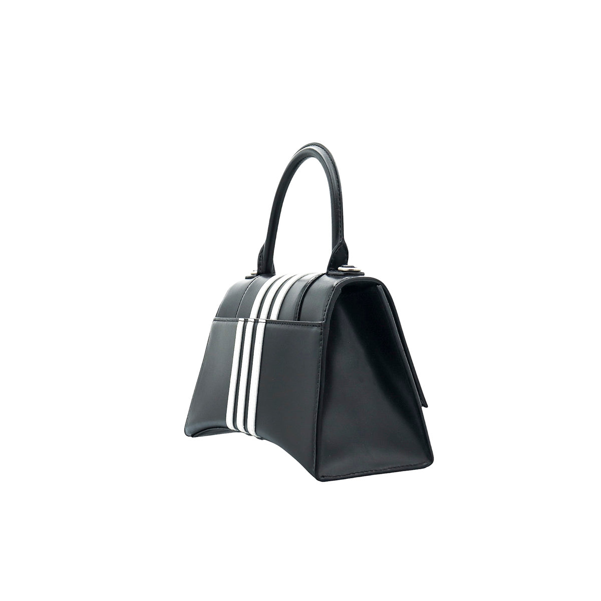 Bolso Hourglass en colaboración Balenciaga X Adidas edición limitada, confeccionado en piel color negro con las 3 franjas distintivas de la marca en solapa y parte trasera, con 1 asa rígida y correa para llevar al hombro, cierre magnético en la solapa con la B y herrajes en color plata avejentado, con leves manchas de maquillaje al interior.
