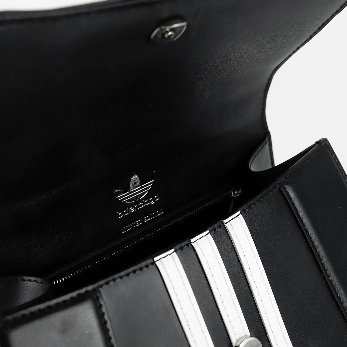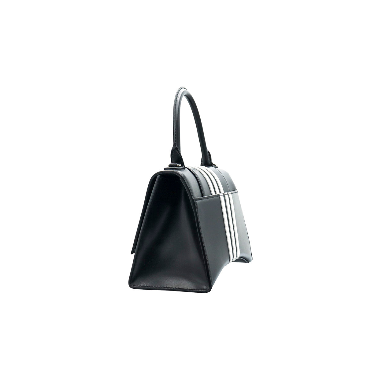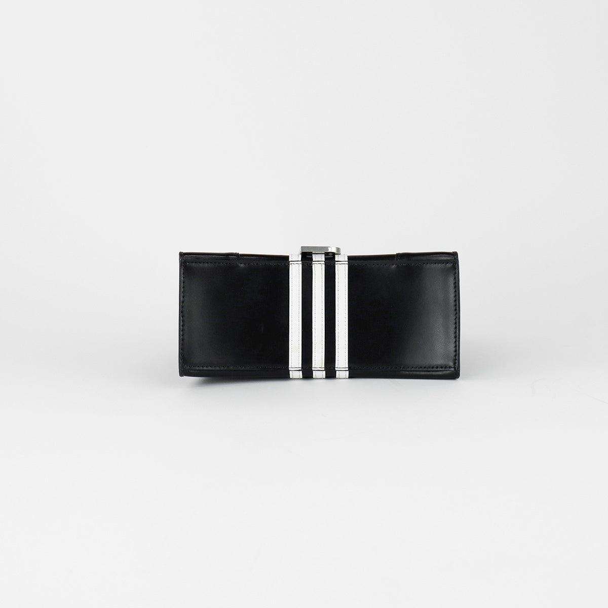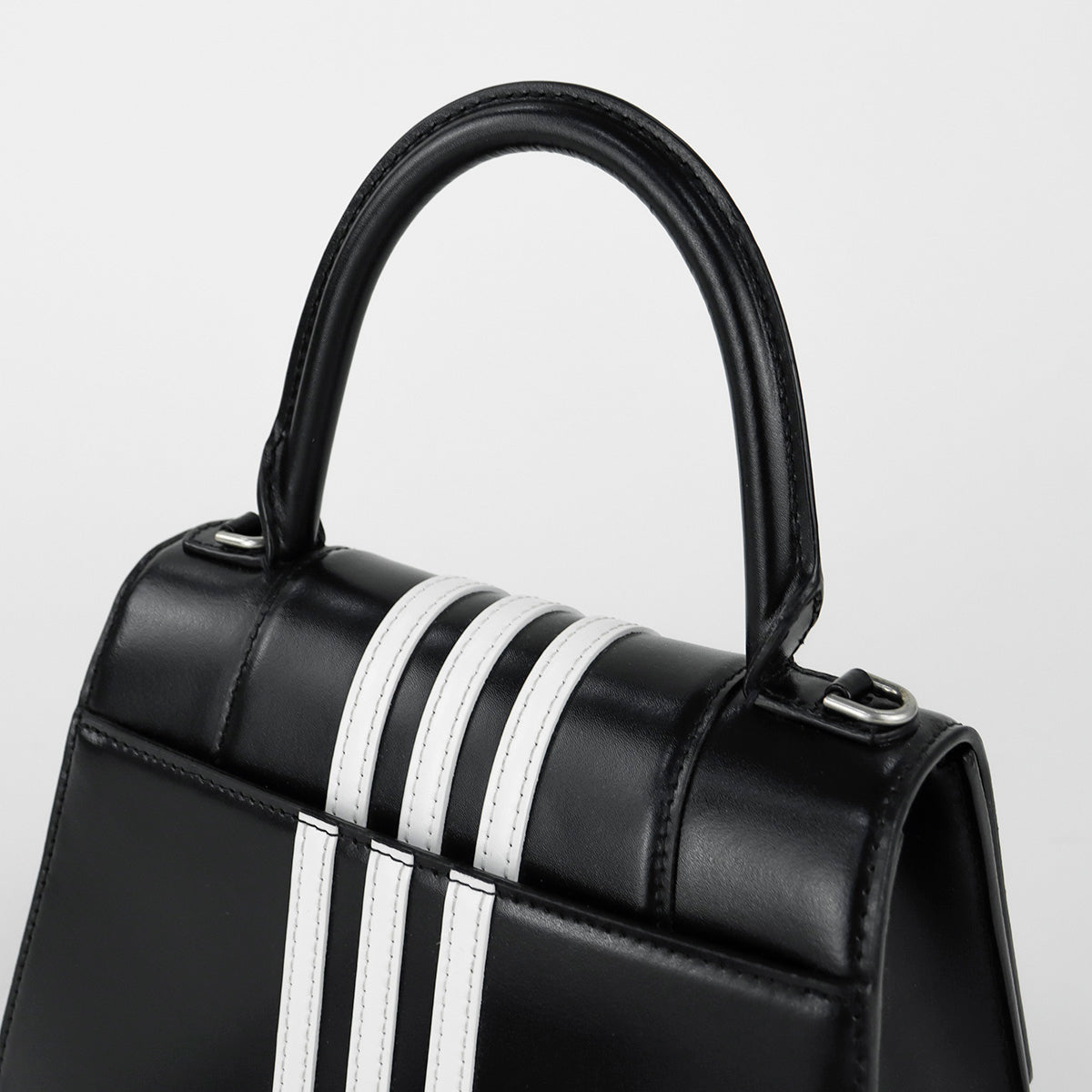 Bolso Hourglass en colaboración Balenciaga X Adidas edición limitada, confeccionado en piel color negro con las 3 franjas distintivas de la marca en solapa y parte trasera, con 1 asa rígida y correa para llevar al hombro, cierre magnético en la solapa con la B y herrajes en color plata avejentado, con leves manchas de maquillaje al interior.