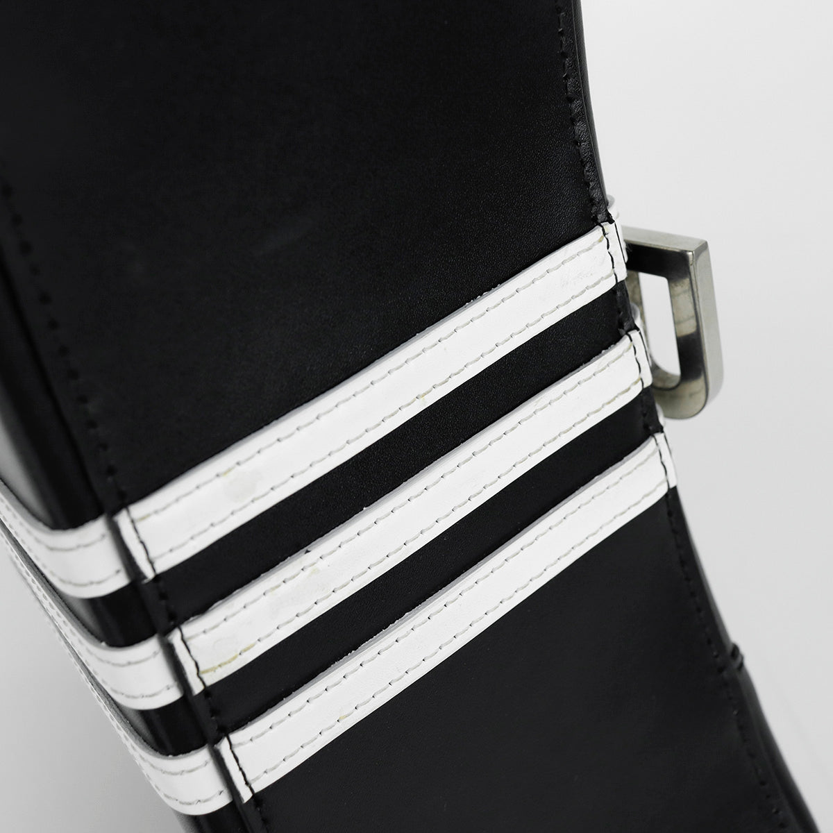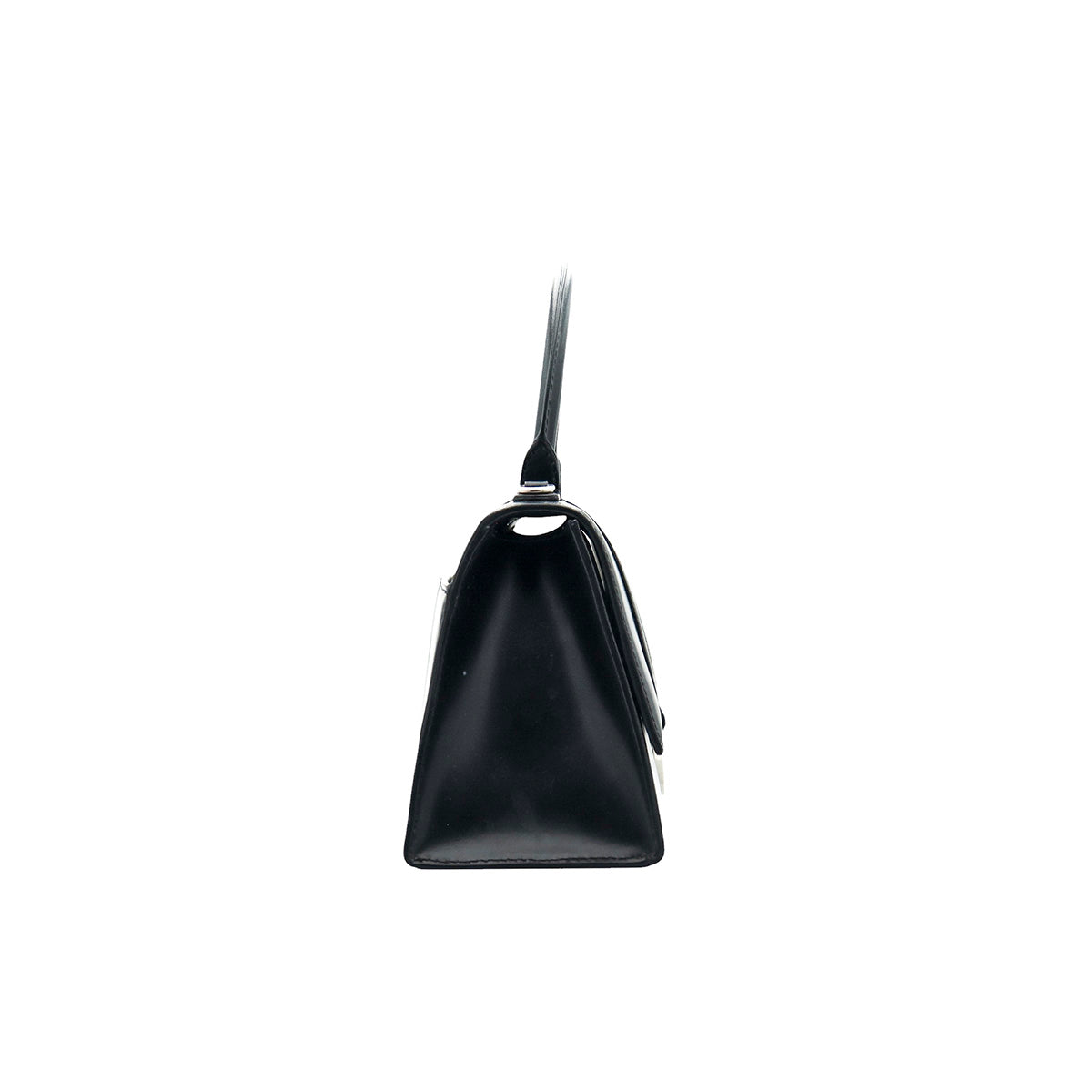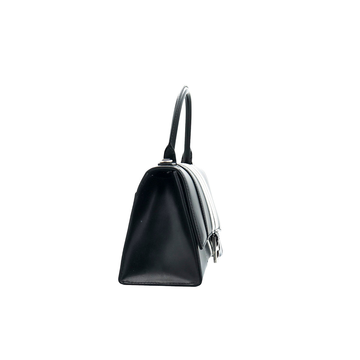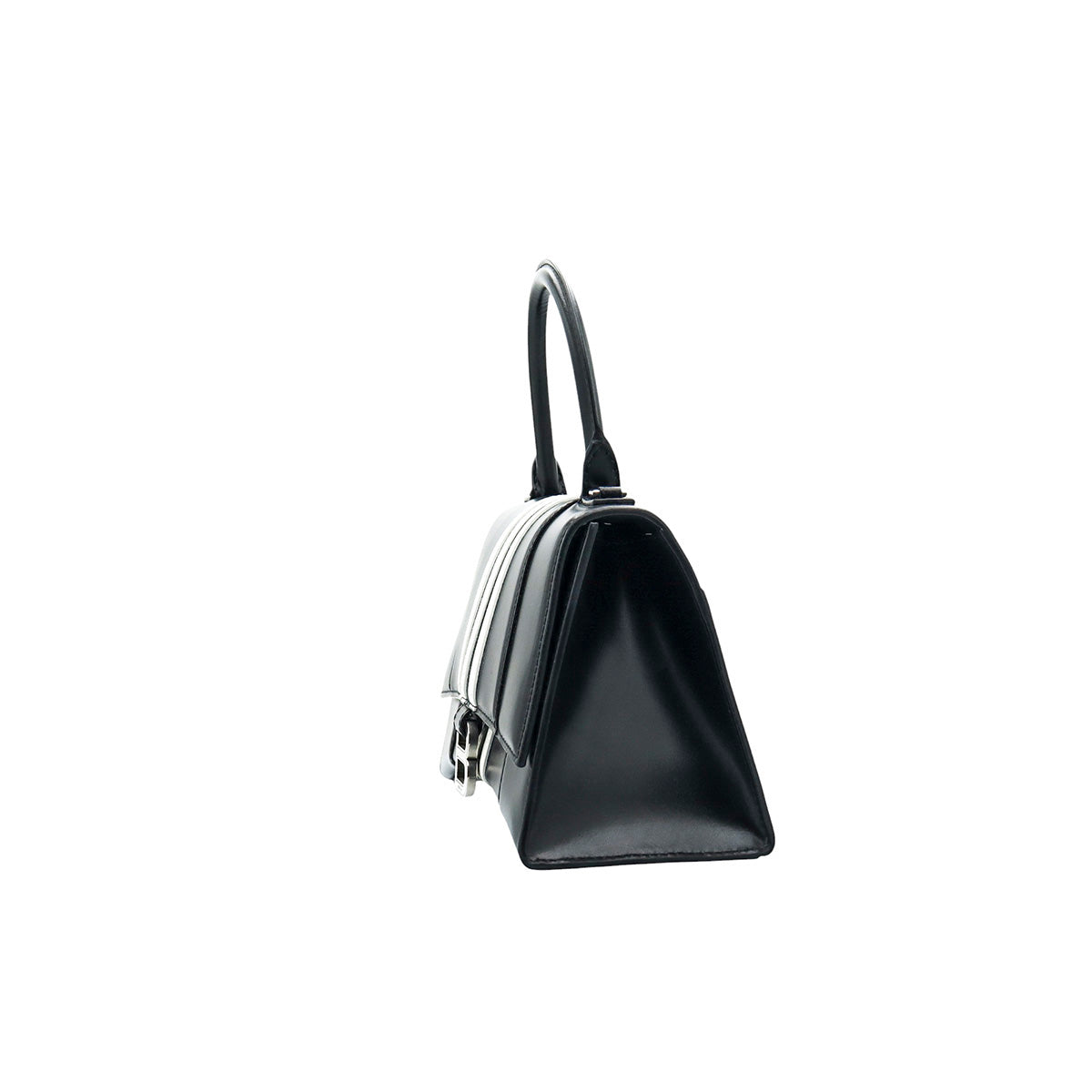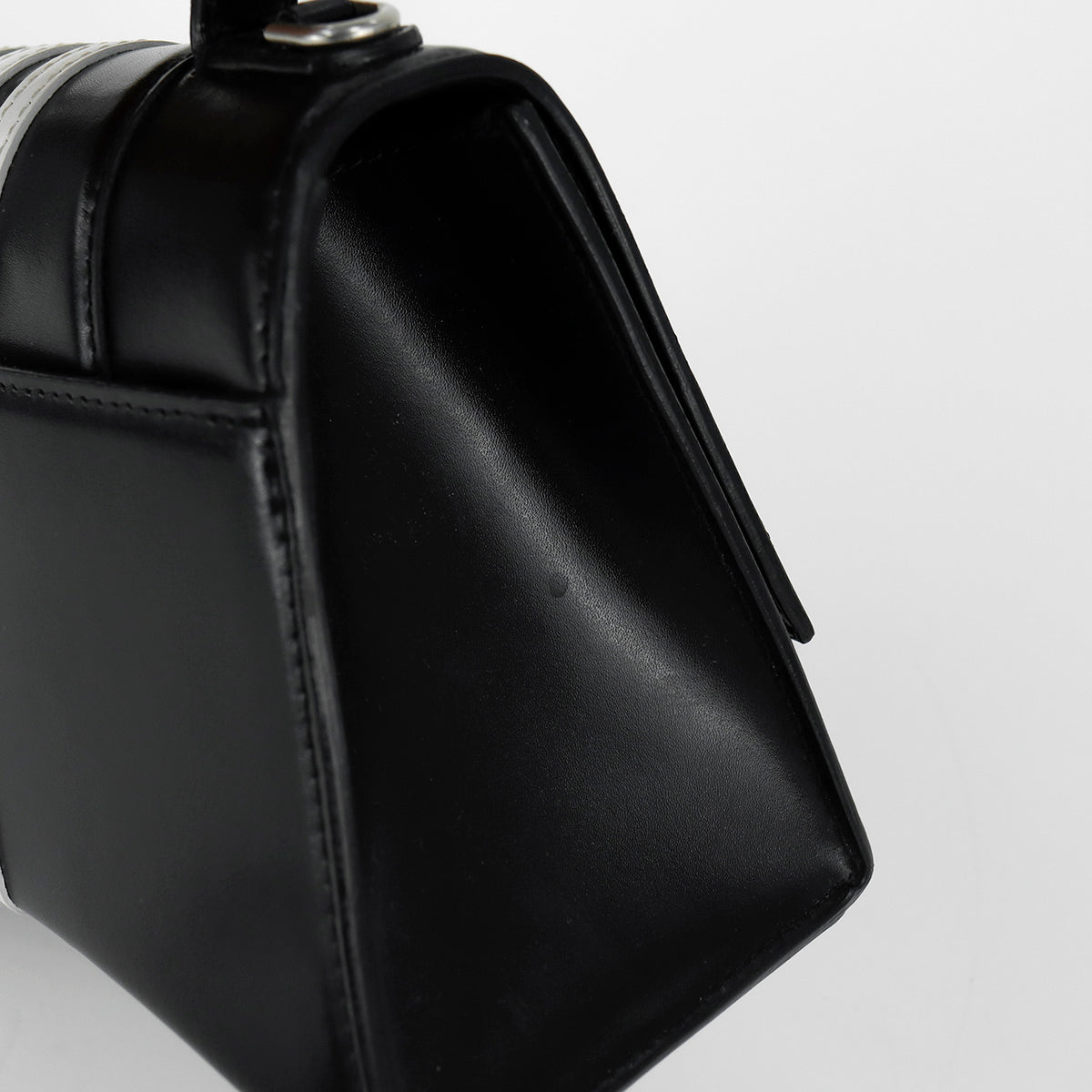Bolso Hourglass en colaboración Balenciaga X Adidas edición limitada, confeccionado en piel color negro con las 3 franjas distintivas de la marca en solapa y parte trasera, con 1 asa rígida y correa para llevar al hombro, cierre magnético en la solapa con la B y herrajes en color plata avejentado, con leves manchas de maquillaje al interior.