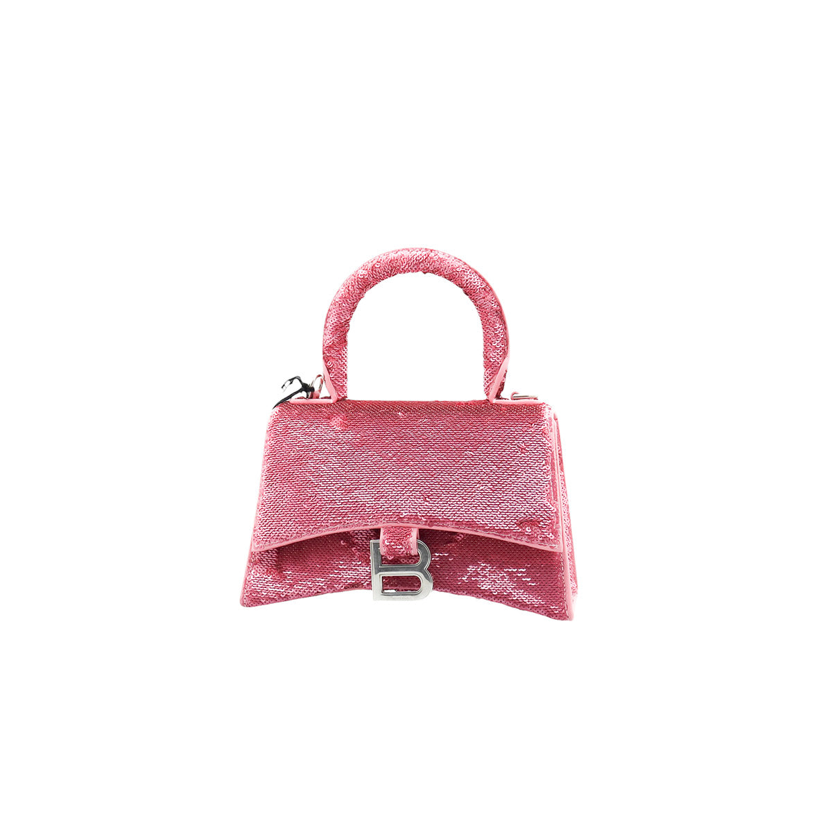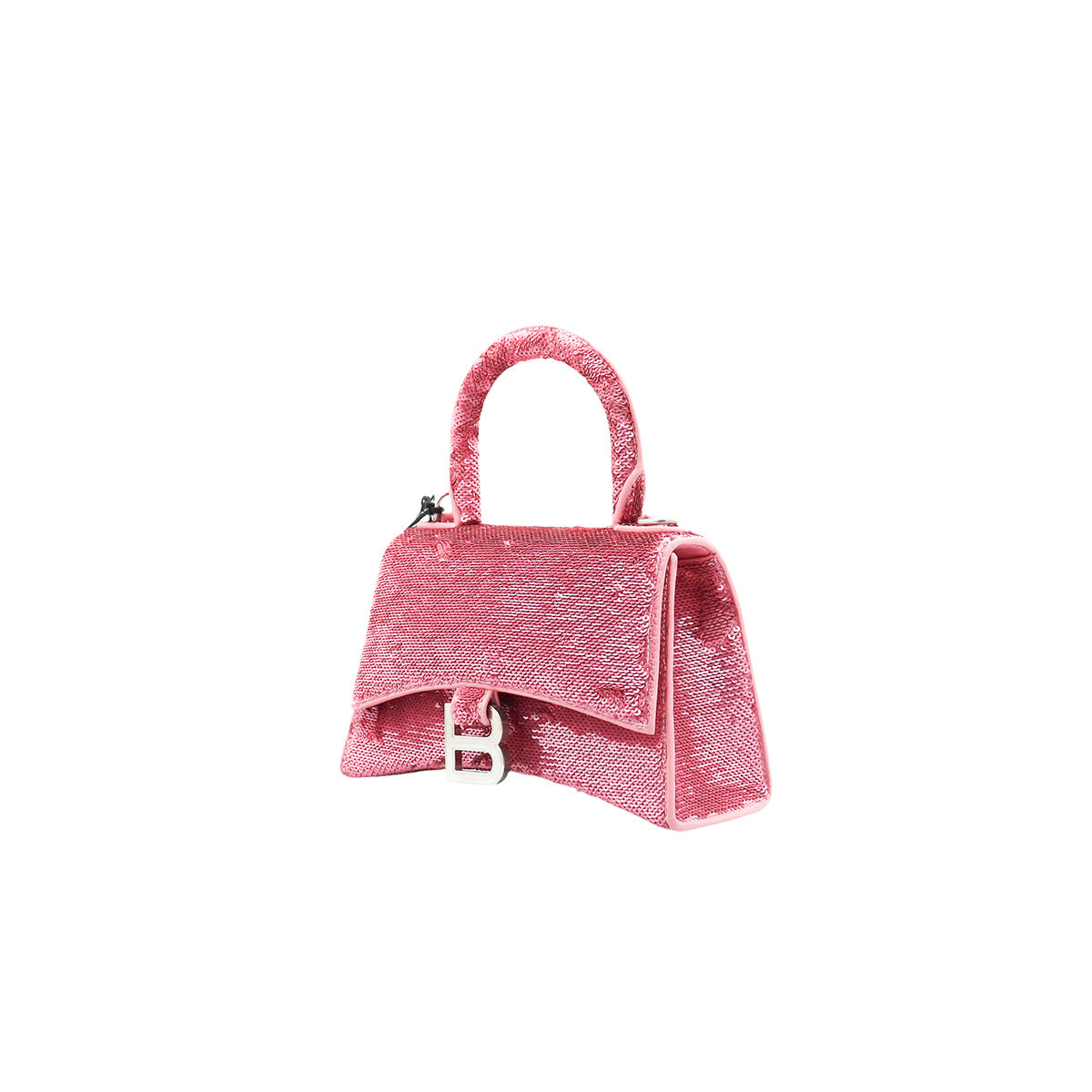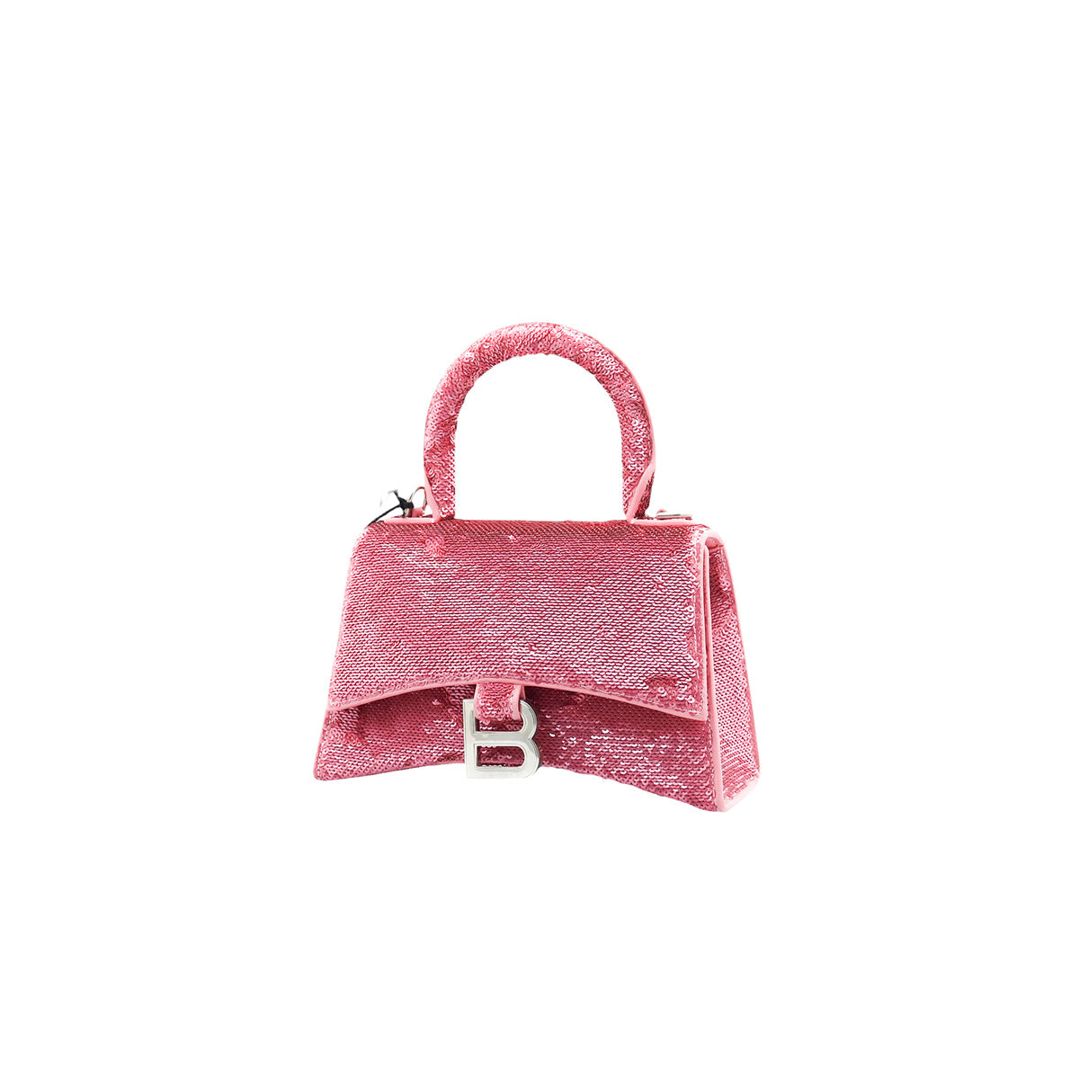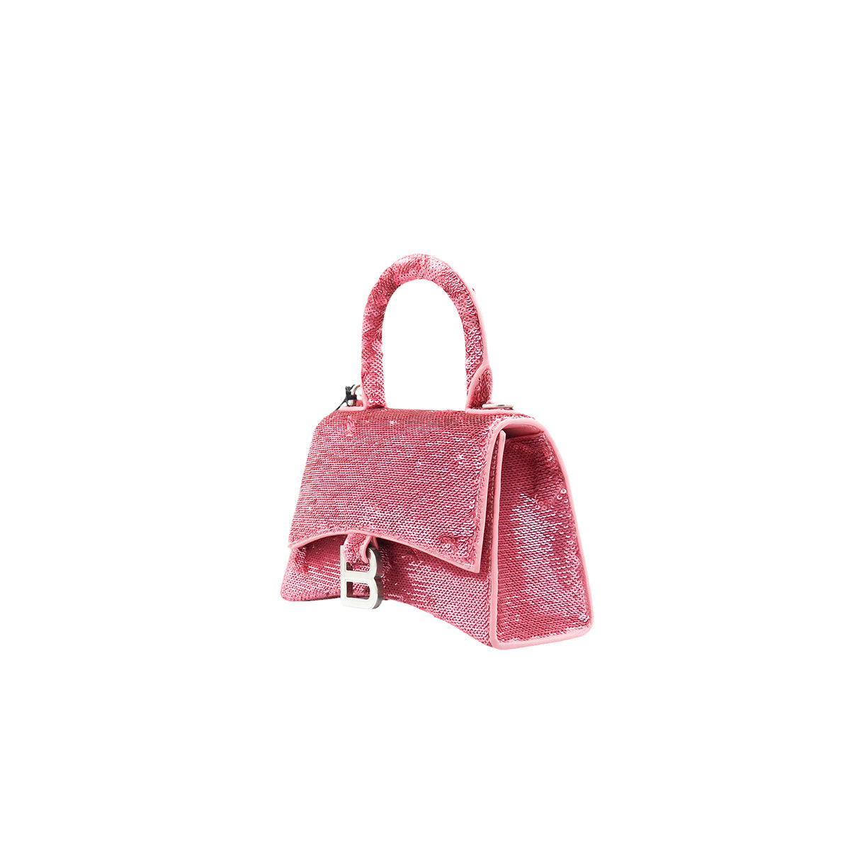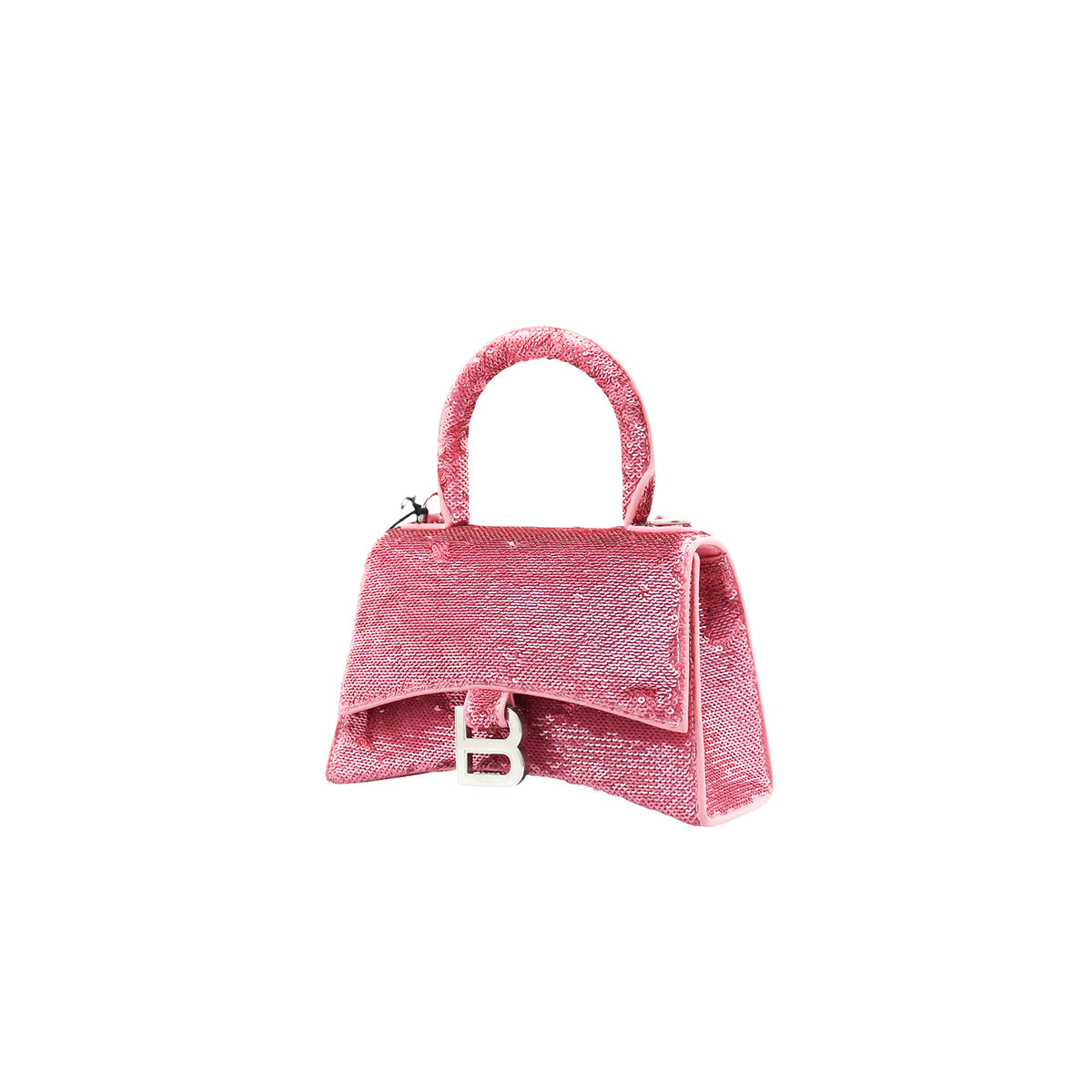 Bolso Balenciaga Hourglass Paillette XS, confeccionado en piel color rosa forrado con lentejuelas, con 1 asa rígida y correa para llevar al hombro, cierre magnético en la solapa con la B y herrajes en color plata , con forro interno en piel, un poco sucia al interior.