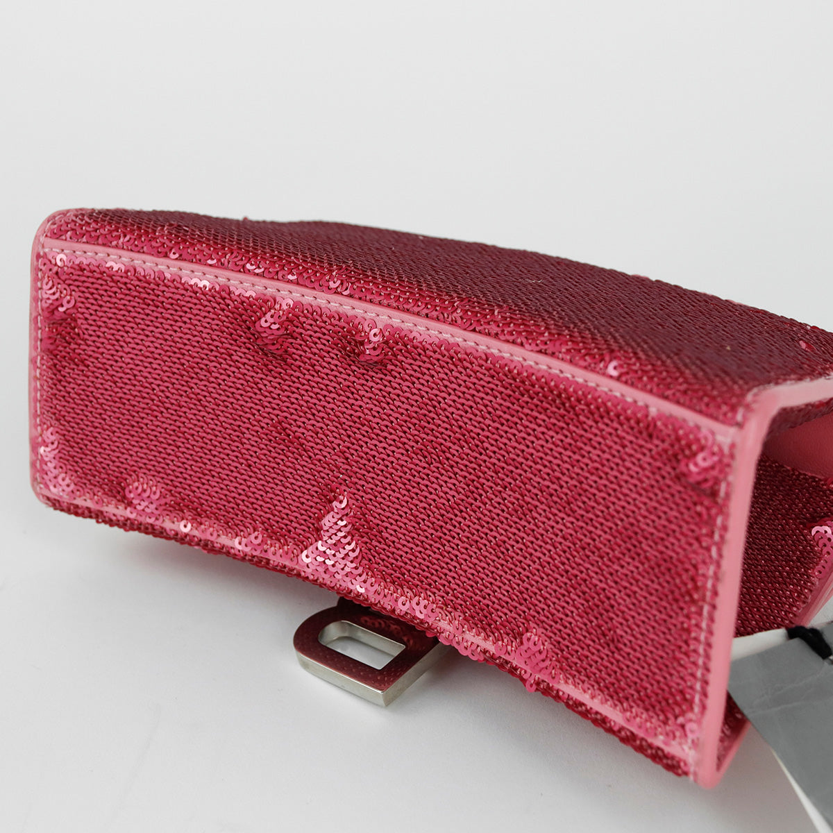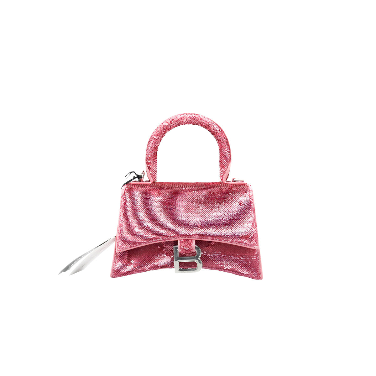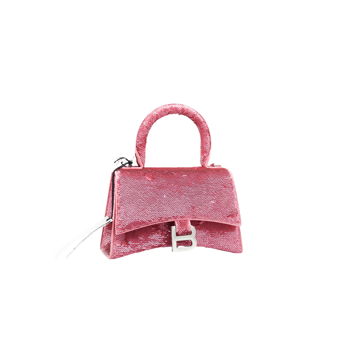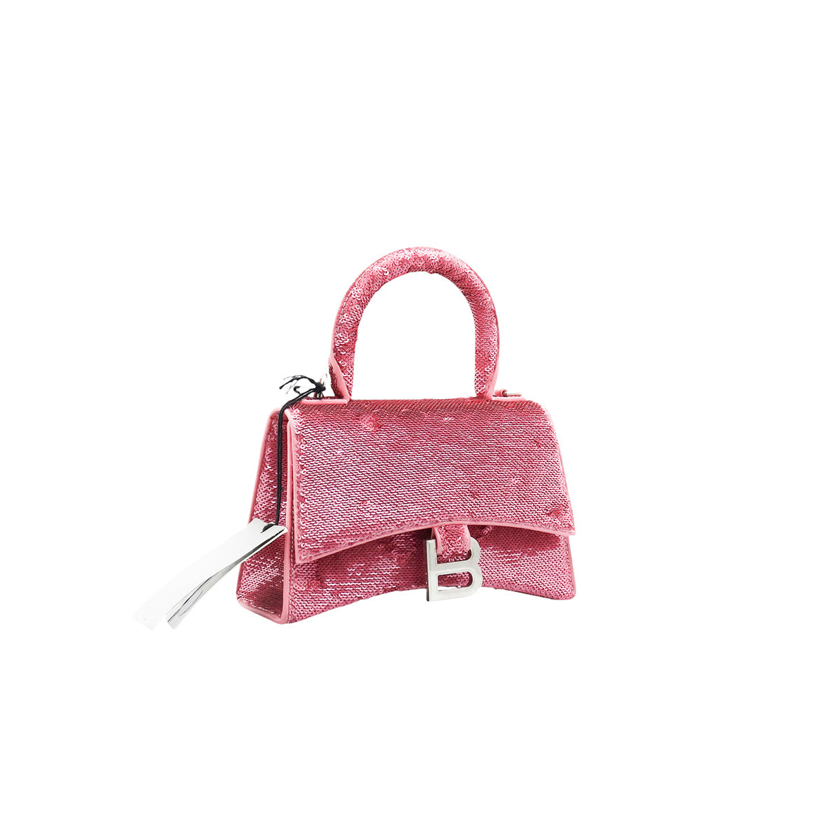 Bolso Balenciaga Hourglass Paillette XS, confeccionado en piel color rosa forrado con lentejuelas, con 1 asa rígida y correa para llevar al hombro, cierre magnético en la solapa con la B y herrajes en color plata , con forro interno en piel, un poco sucia al interior.