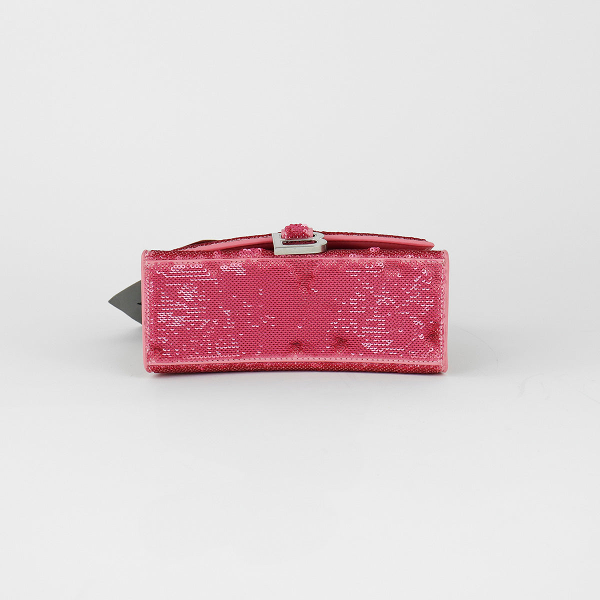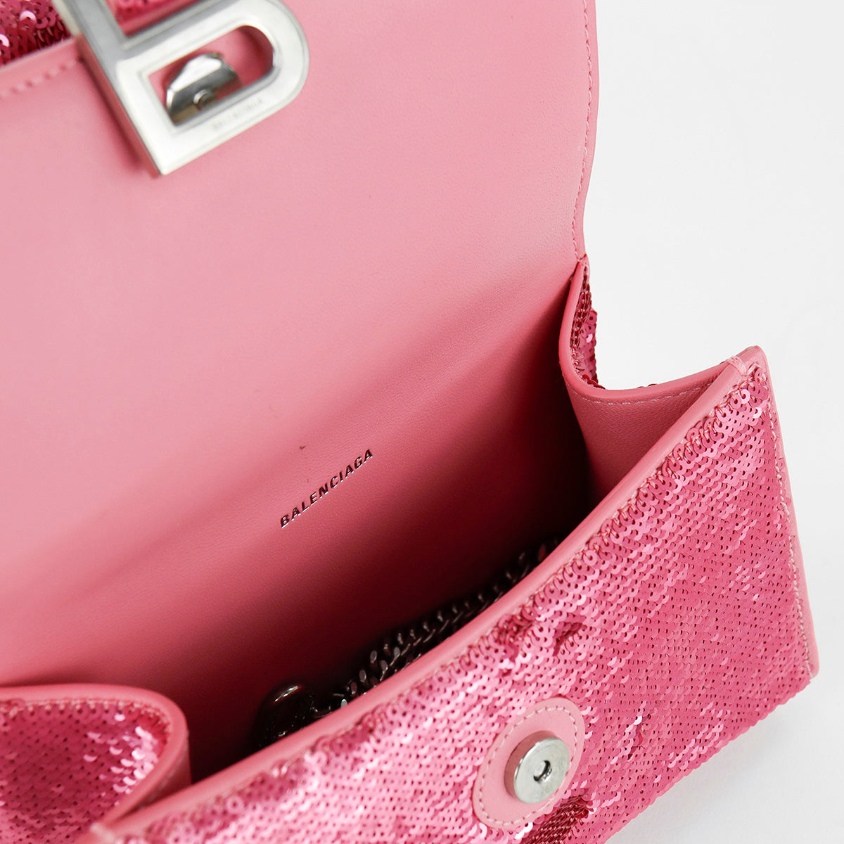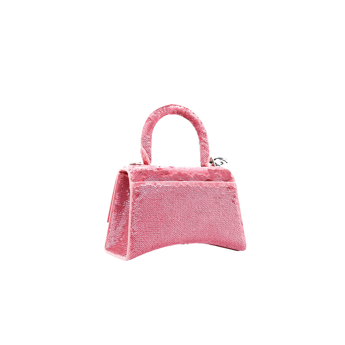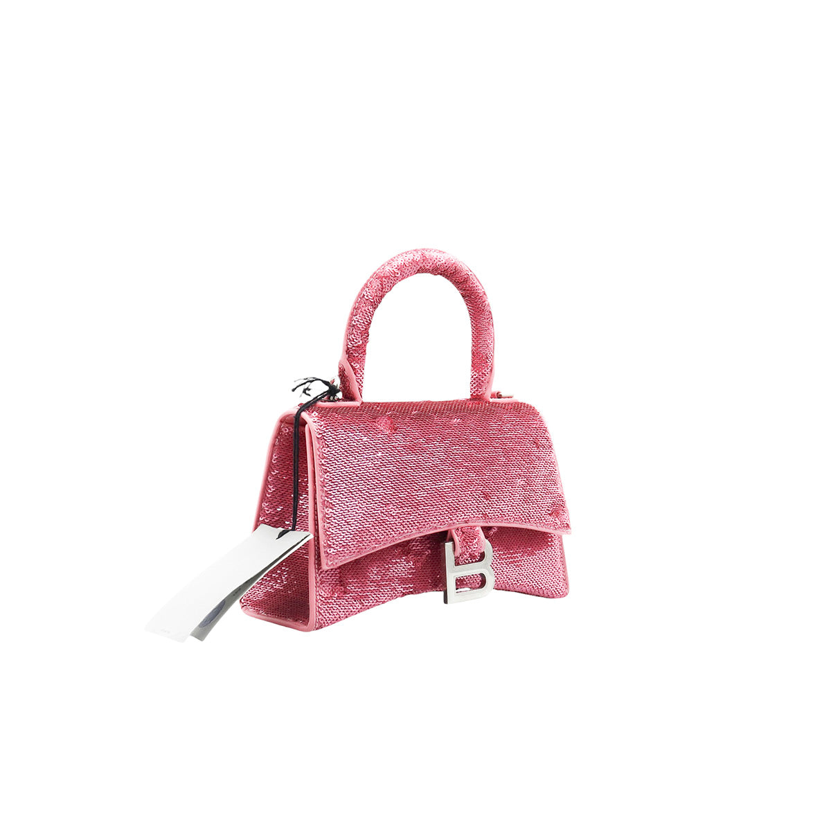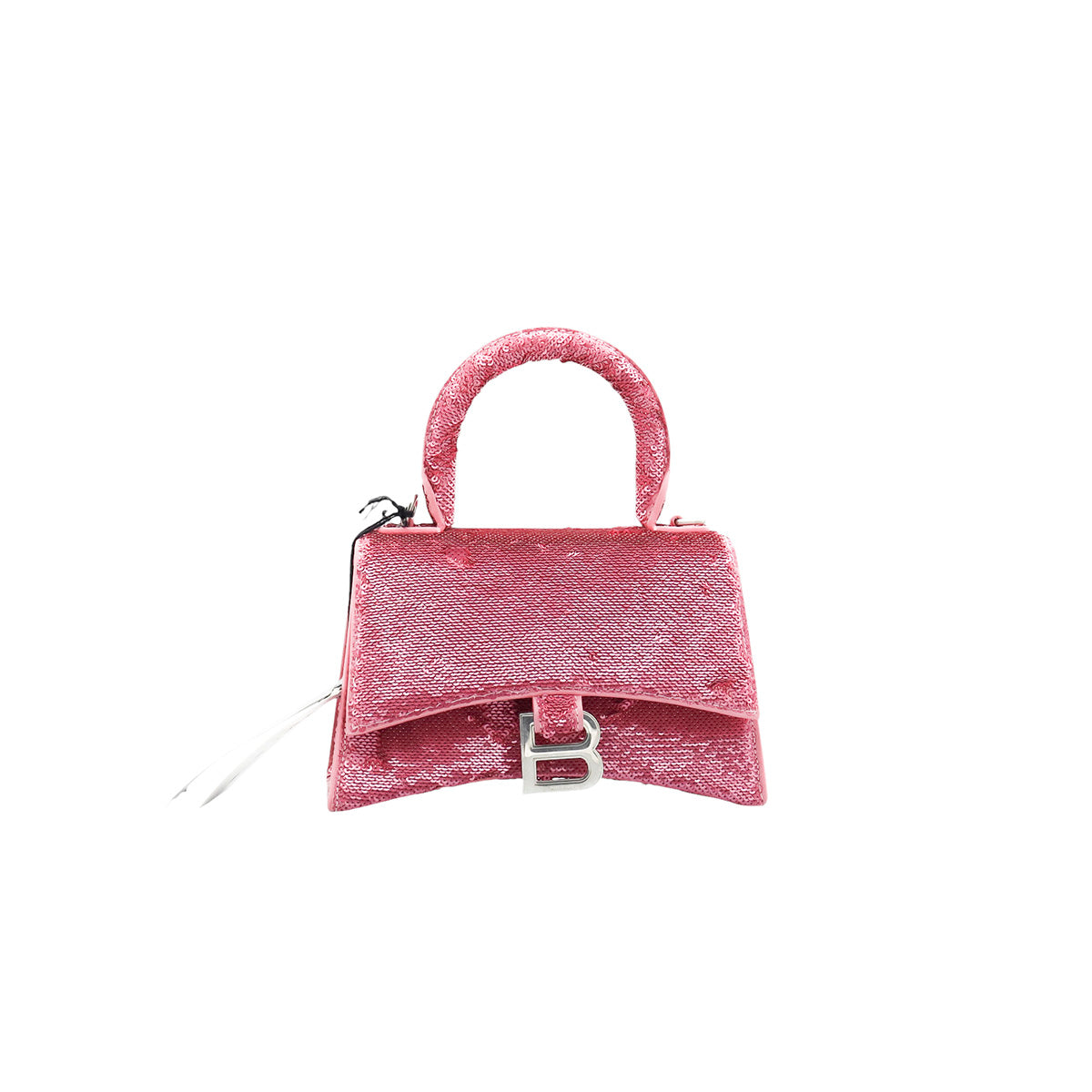 Bolso Balenciaga Hourglass Paillette XS, confeccionado en piel color rosa forrado con lentejuelas, con 1 asa rígida y correa para llevar al hombro, cierre magnético en la solapa con la B y herrajes en color plata , con forro interno en piel, un poco sucia al interior.