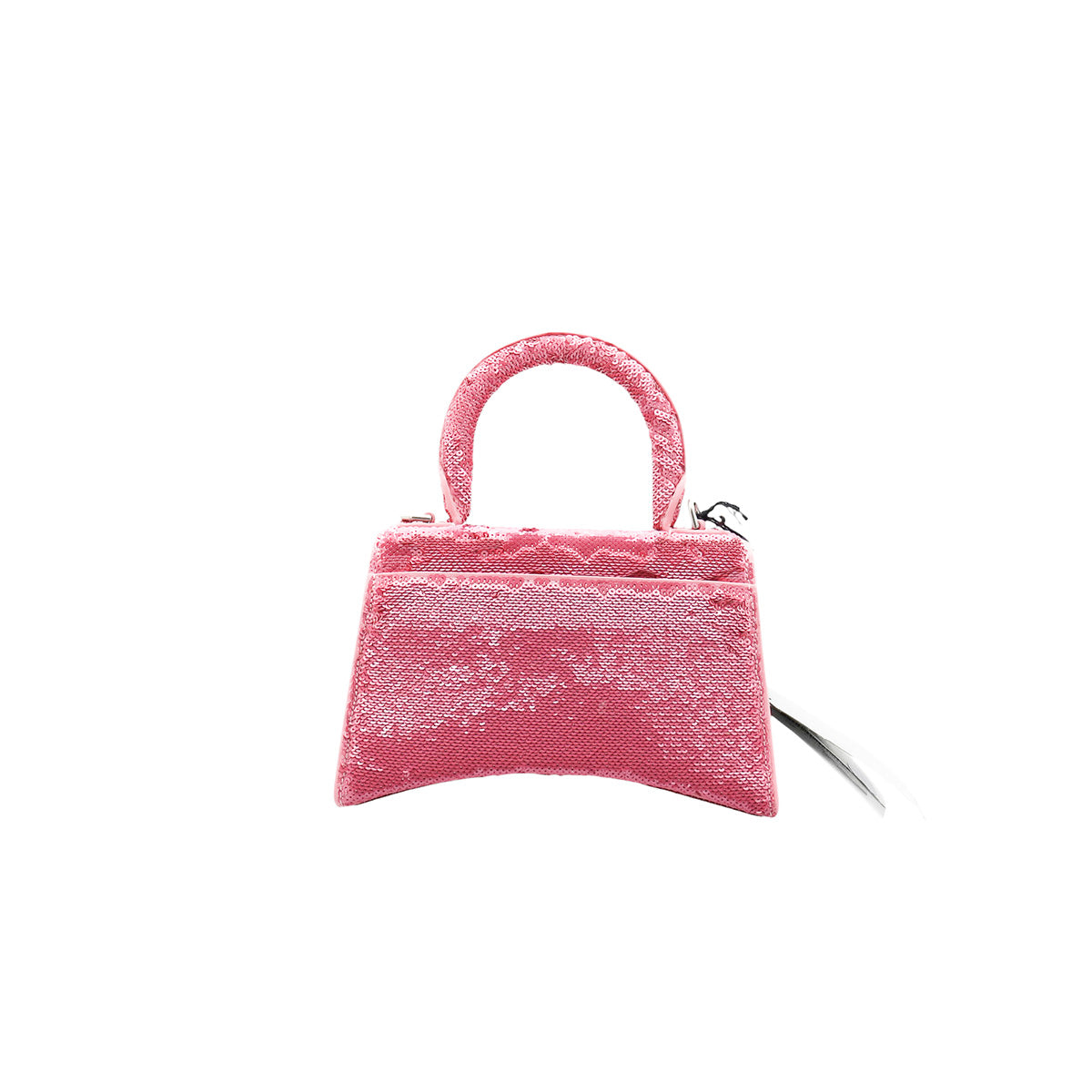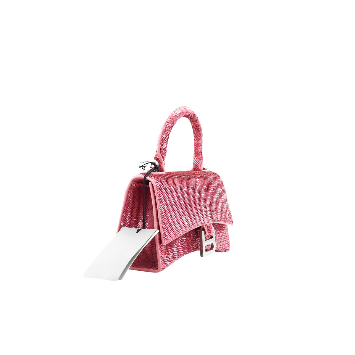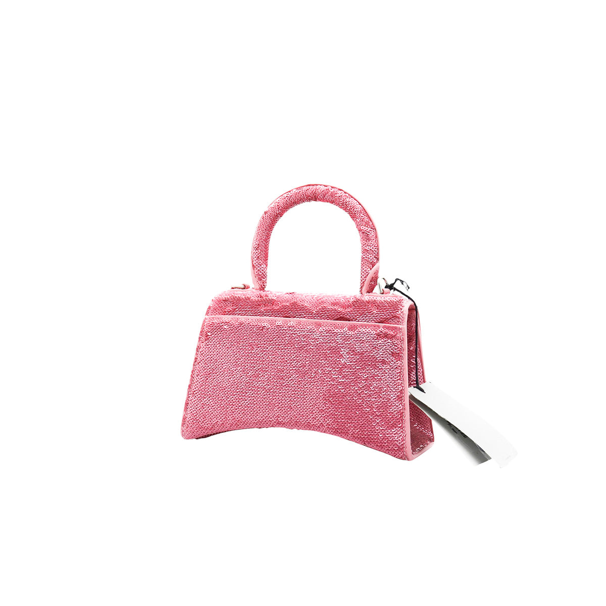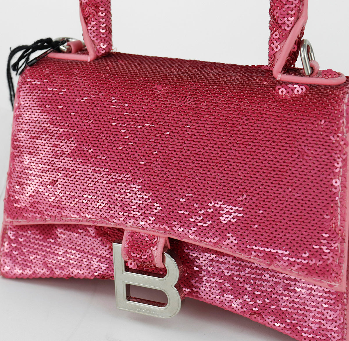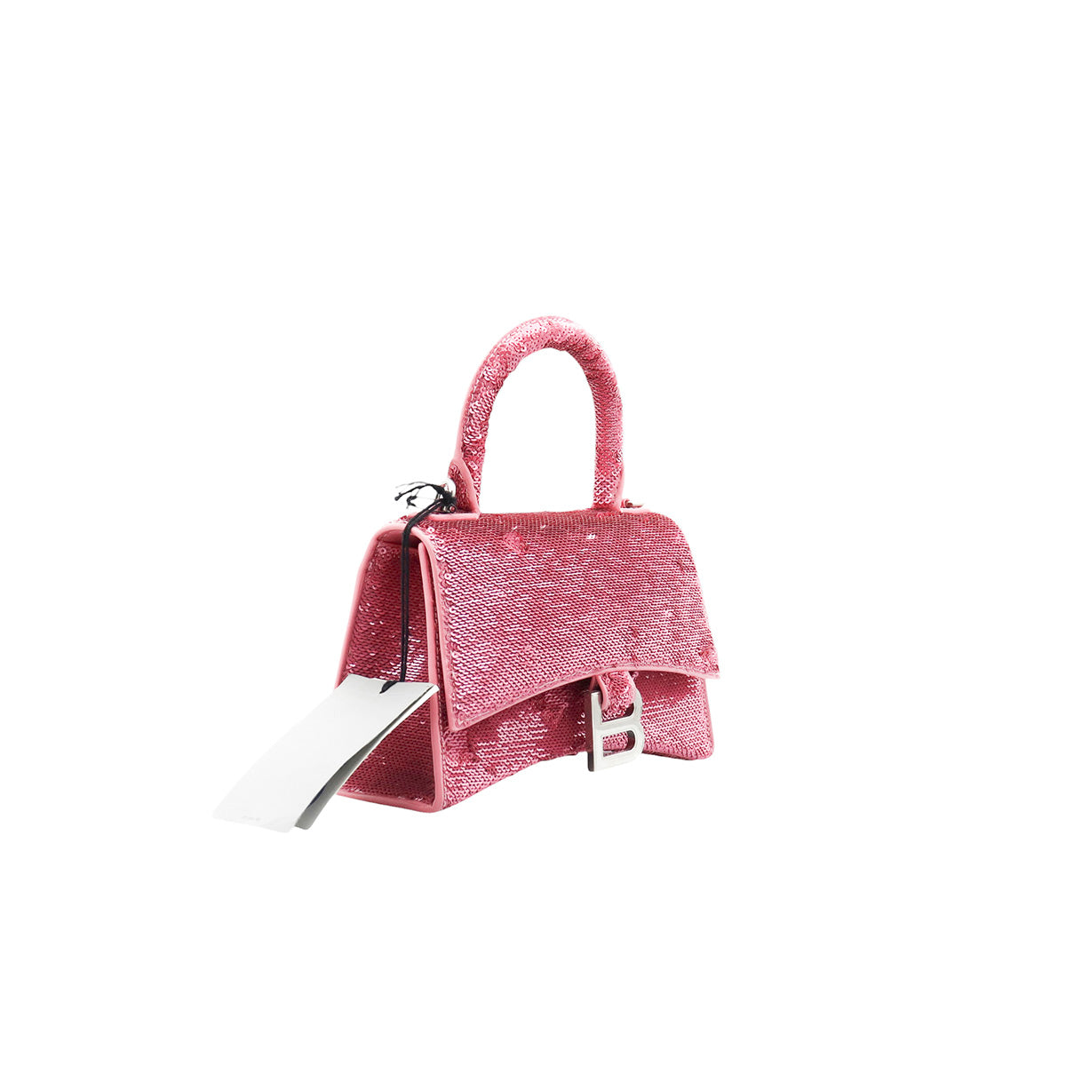 Bolso Balenciaga Hourglass Paillette XS, confeccionado en piel color rosa forrado con lentejuelas, con 1 asa rígida y correa para llevar al hombro, cierre magnético en la solapa con la B y herrajes en color plata , con forro interno en piel, un poco sucia al interior.