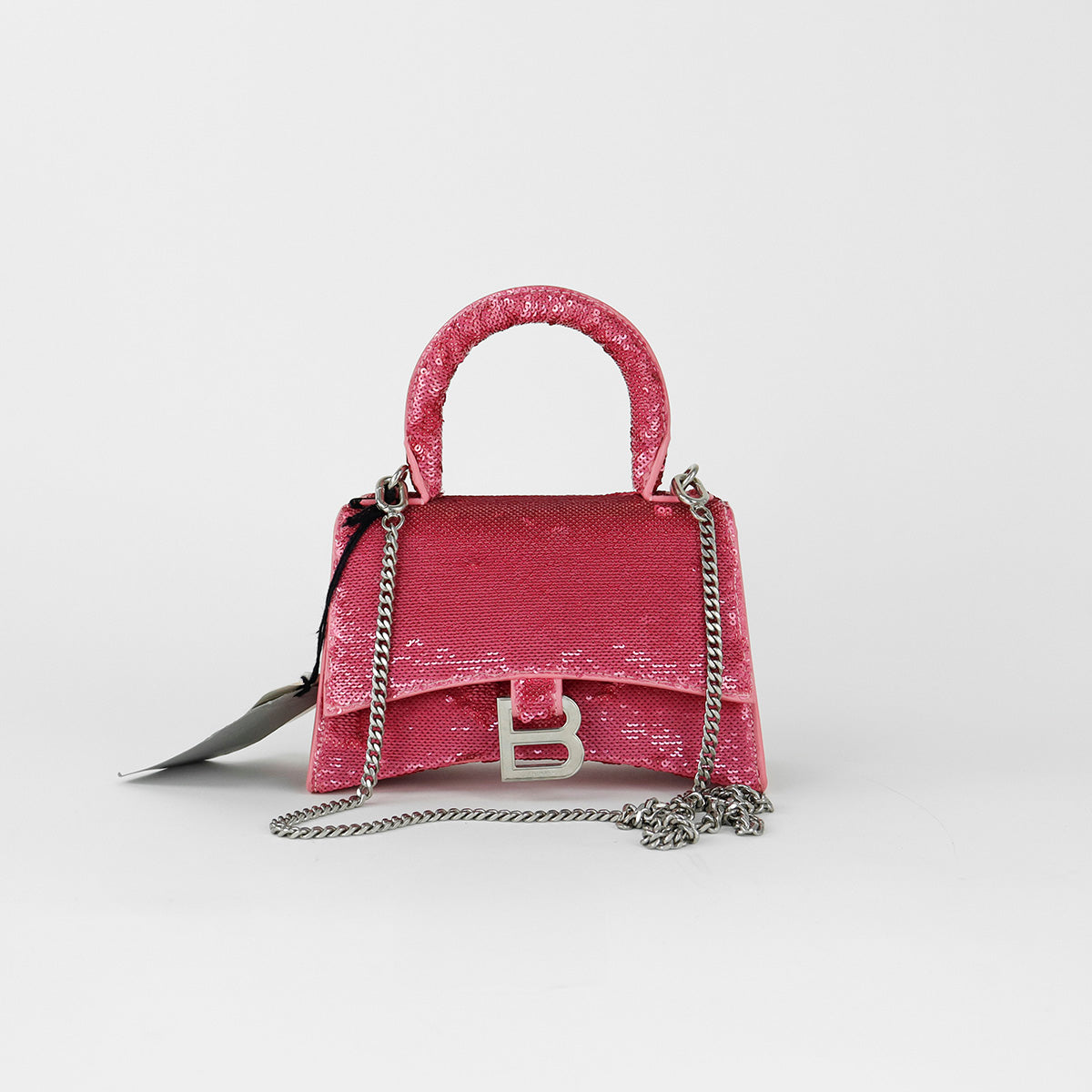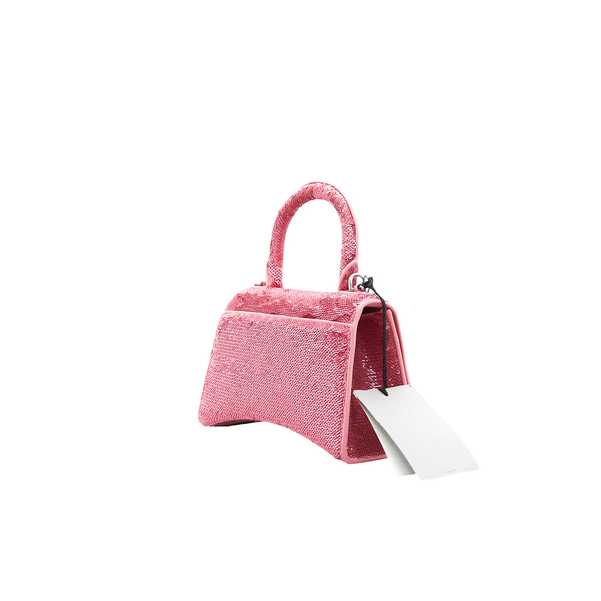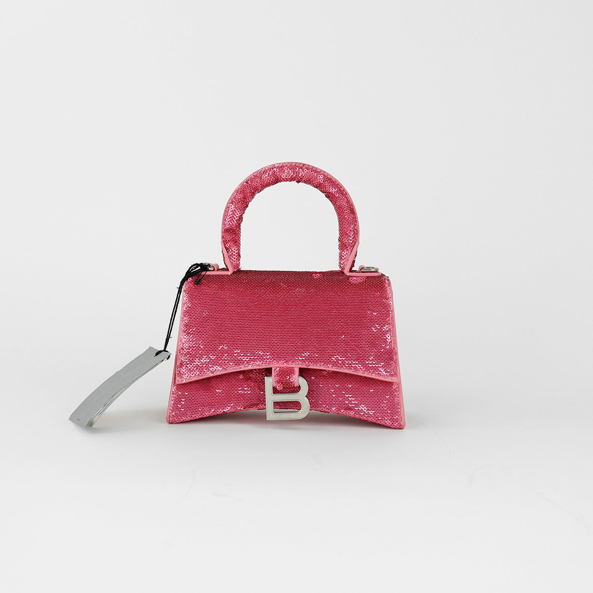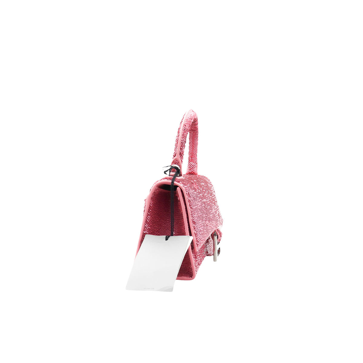 Bolso Balenciaga Hourglass Paillette XS, confeccionado en piel color rosa forrado con lentejuelas, con 1 asa rígida y correa para llevar al hombro, cierre magnético en la solapa con la B y herrajes en color plata , con forro interno en piel, un poco sucia al interior.