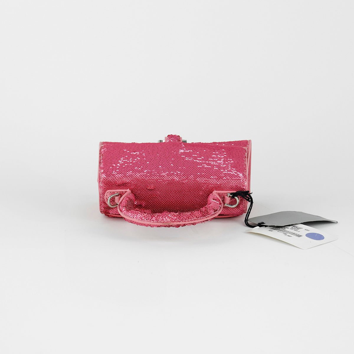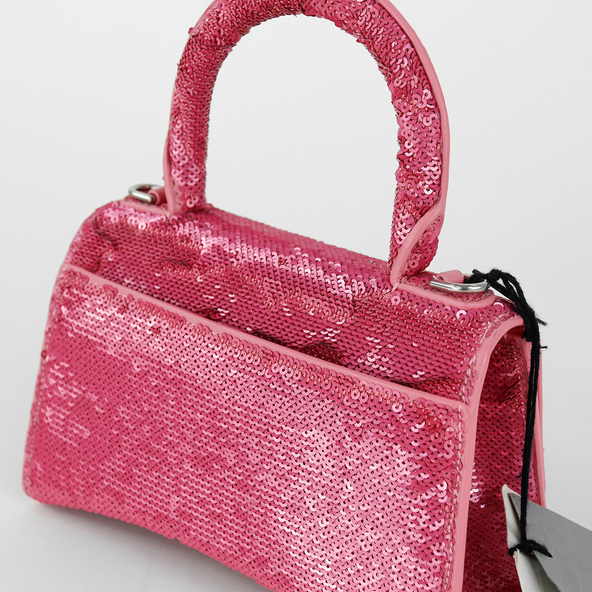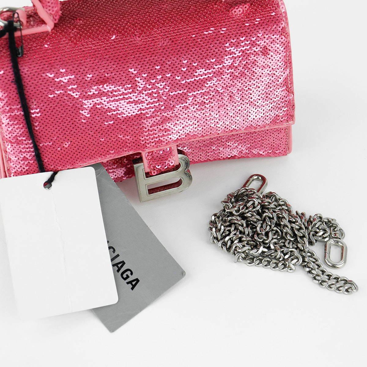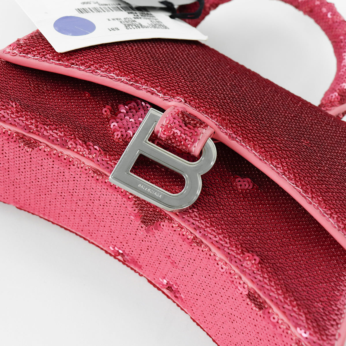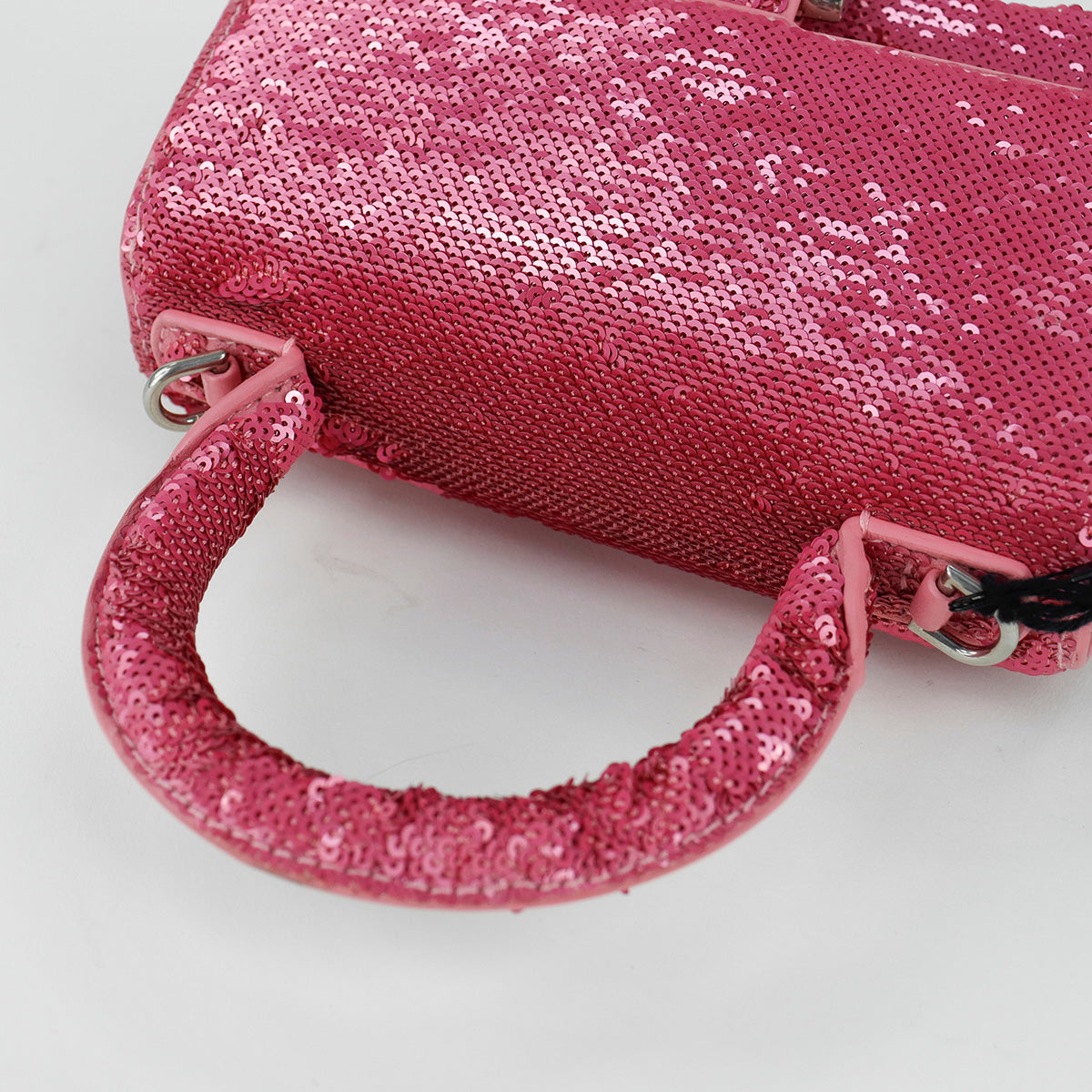 Bolso Balenciaga Hourglass Paillette XS, confeccionado en piel color rosa forrado con lentejuelas, con 1 asa rígida y correa para llevar al hombro, cierre magnético en la solapa con la B y herrajes en color plata , con forro interno en piel, un poco sucia al interior.