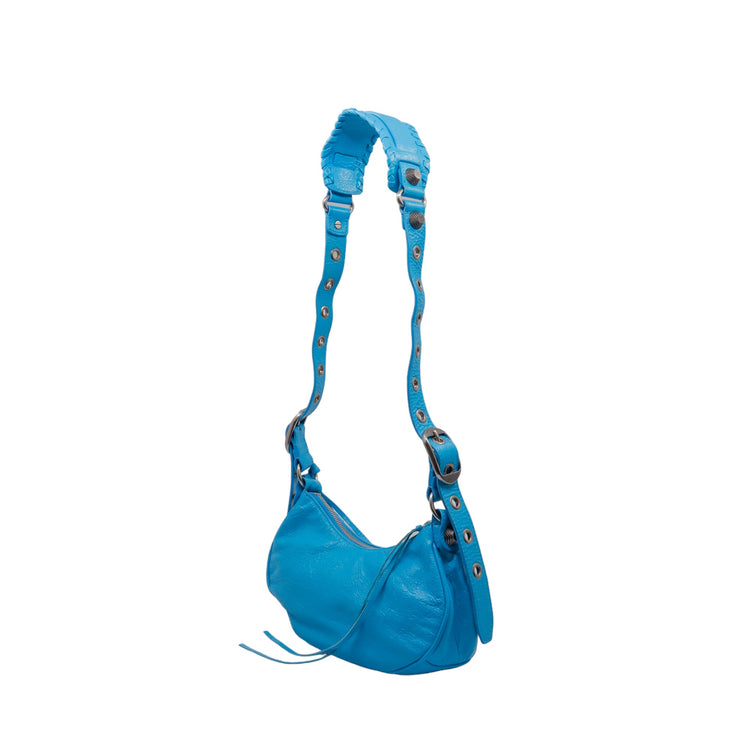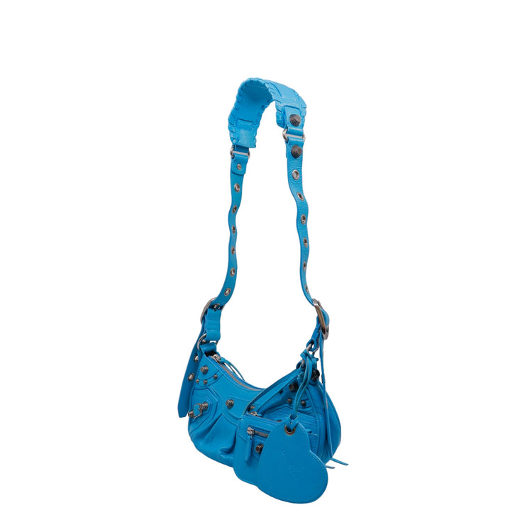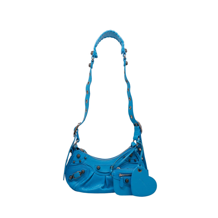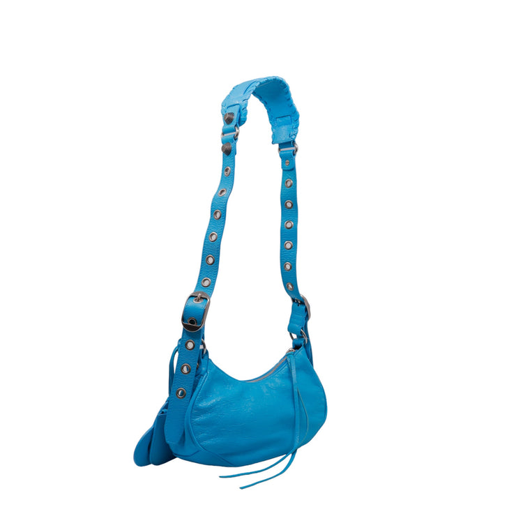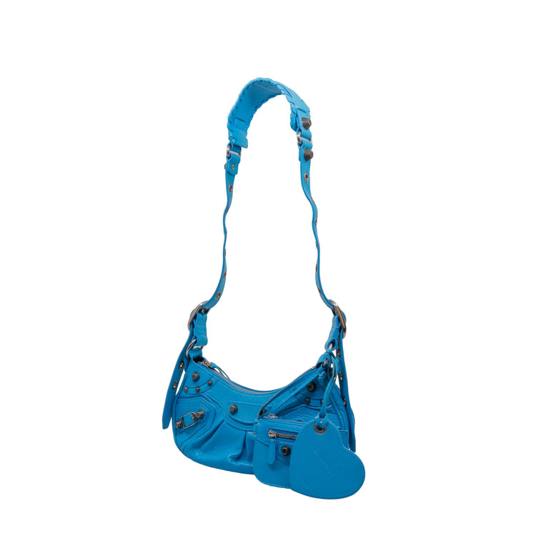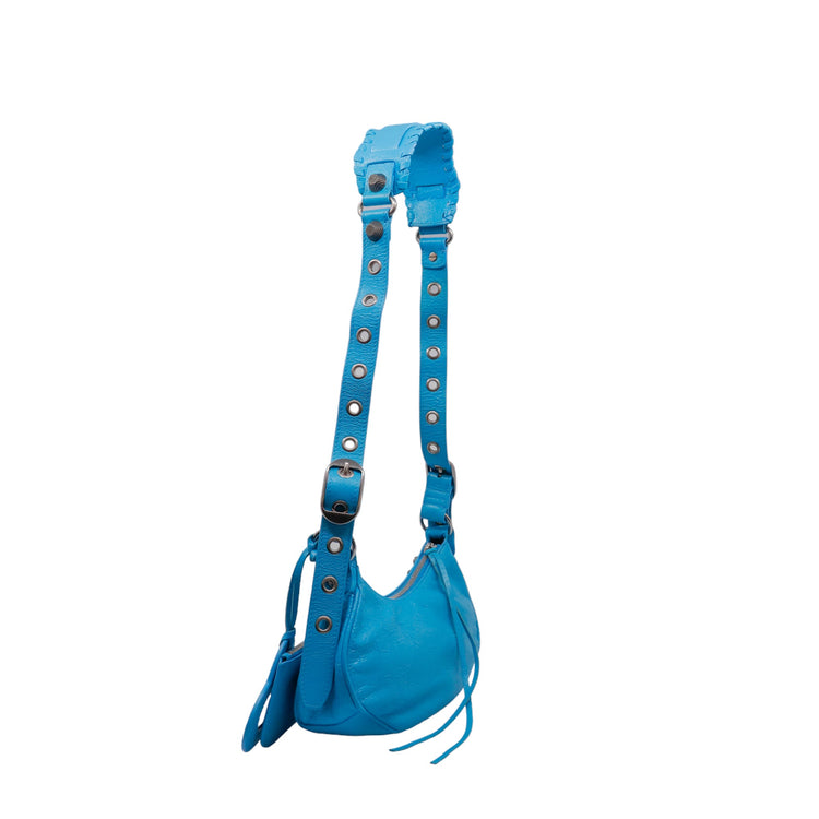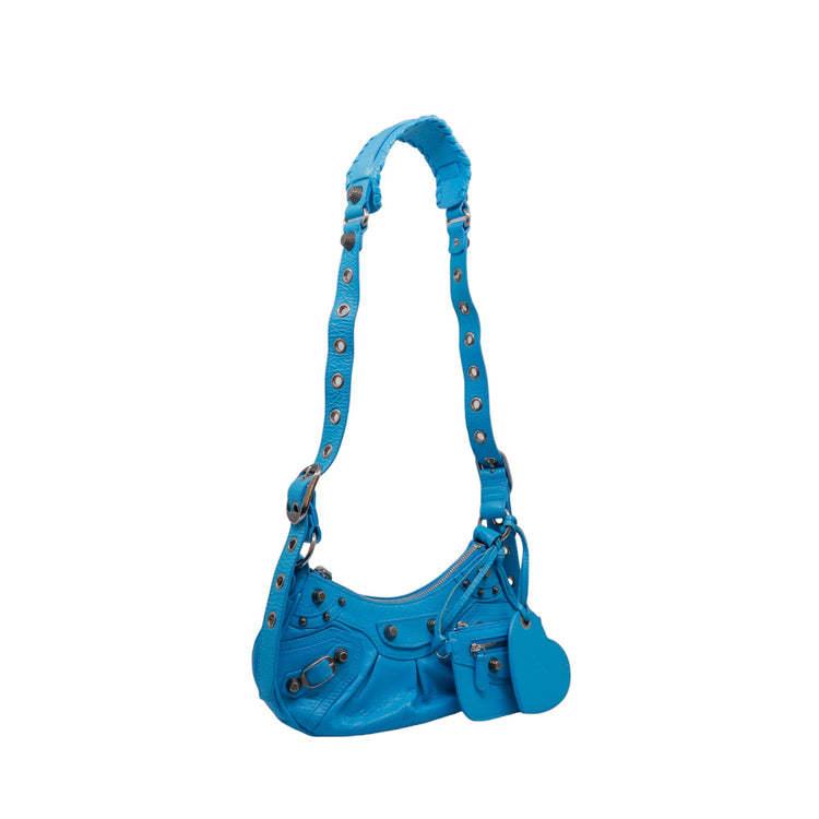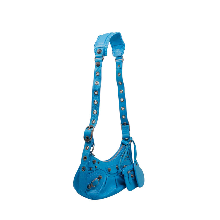Bolso Balenciaga de la línea Le Cagole XS, confeccionado en piel rígida color azul, forro textil negro, con estoperoles y herrajes en color plata, asa ajustable y espejo.