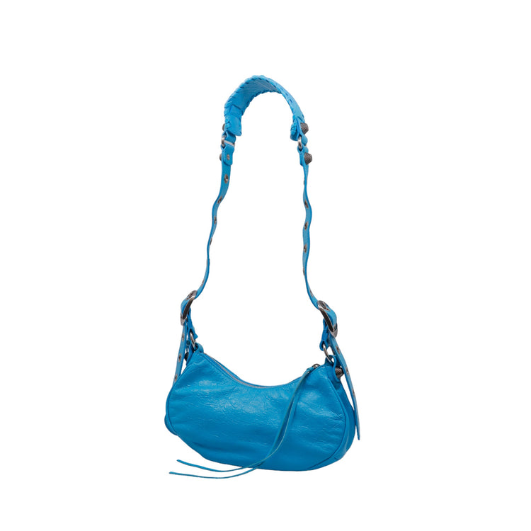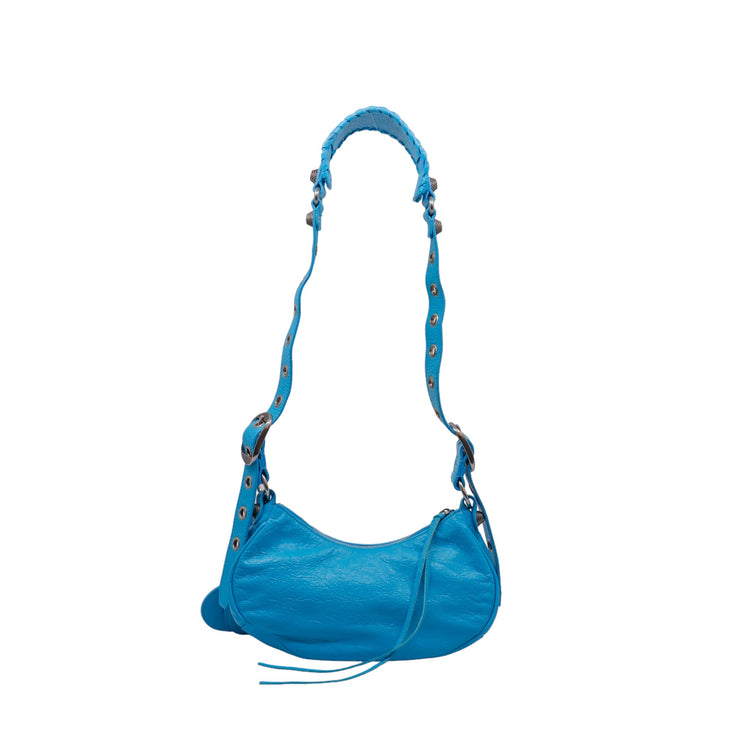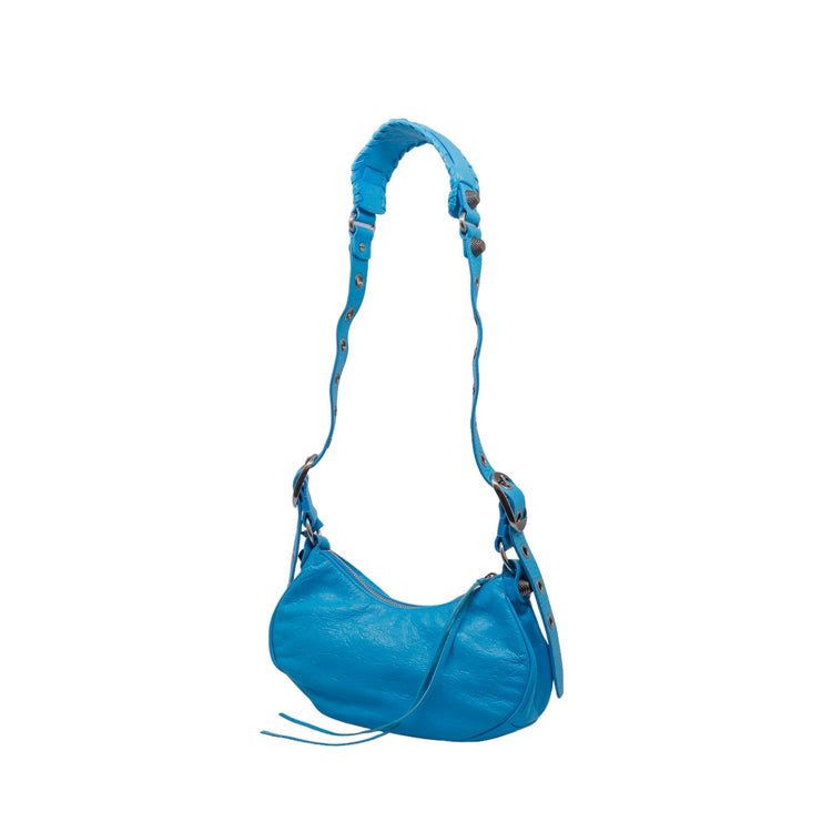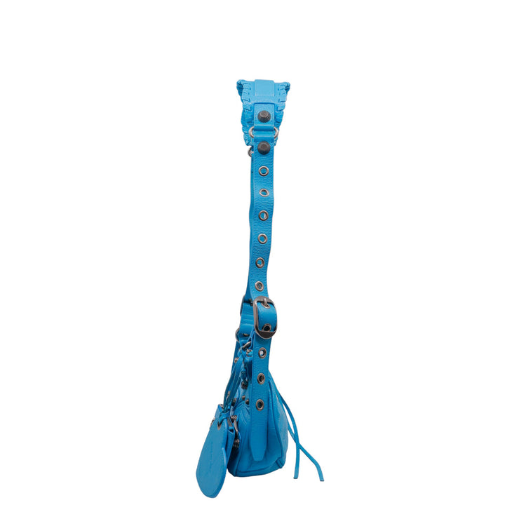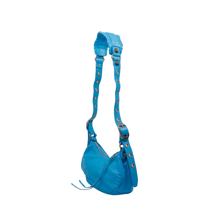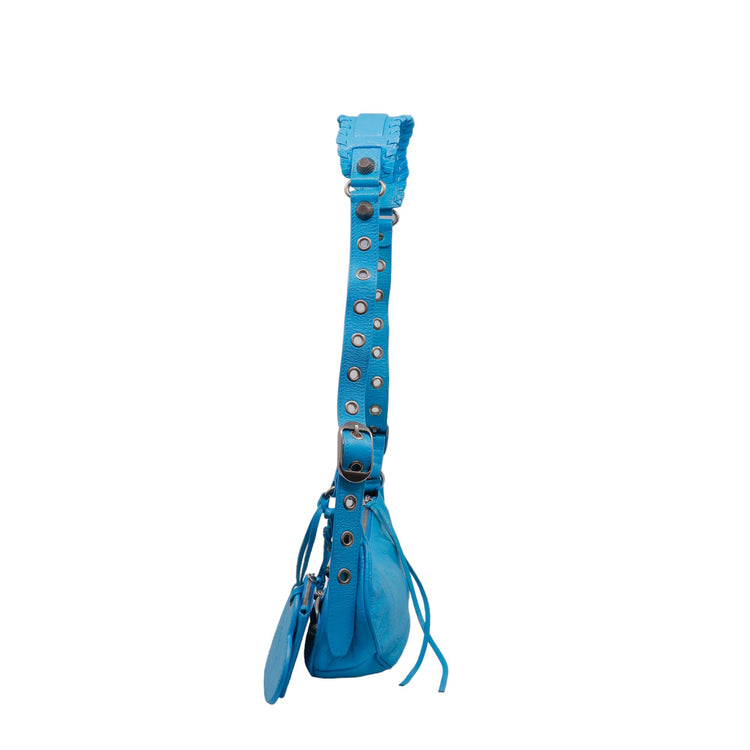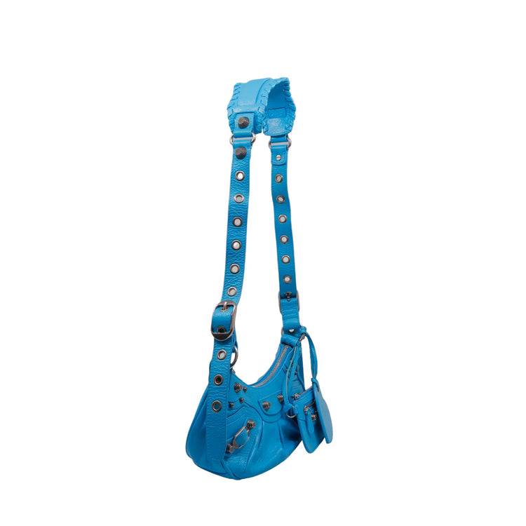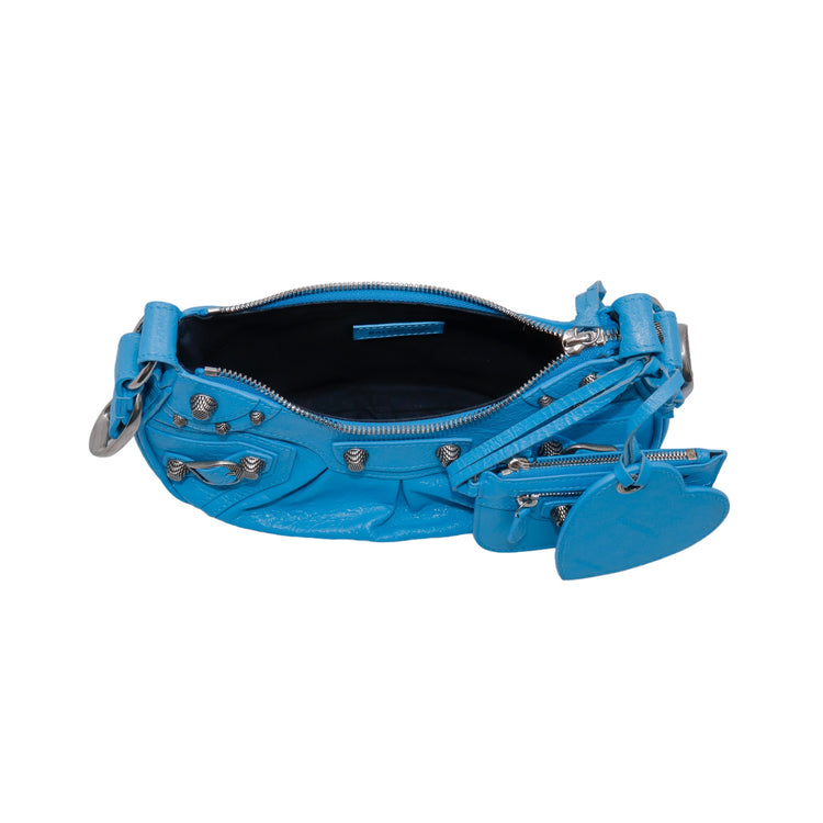 Bolso Balenciaga de la línea Le Cagole XS, confeccionado en piel rígida color azul, forro textil negro, con estoperoles y herrajes en color plata, asa ajustable y espejo.