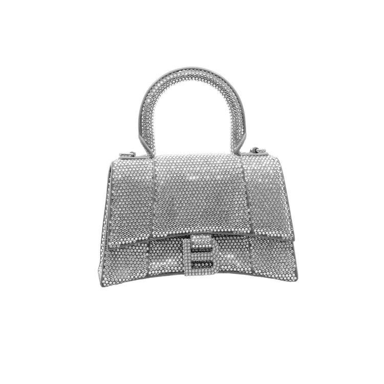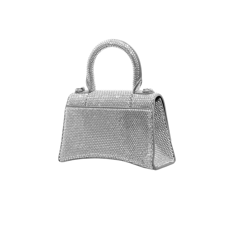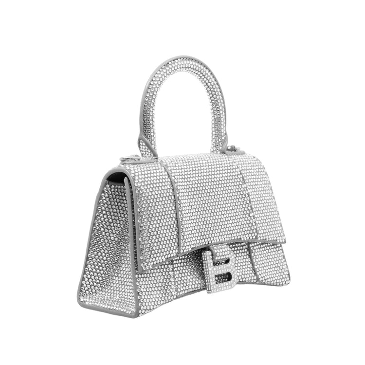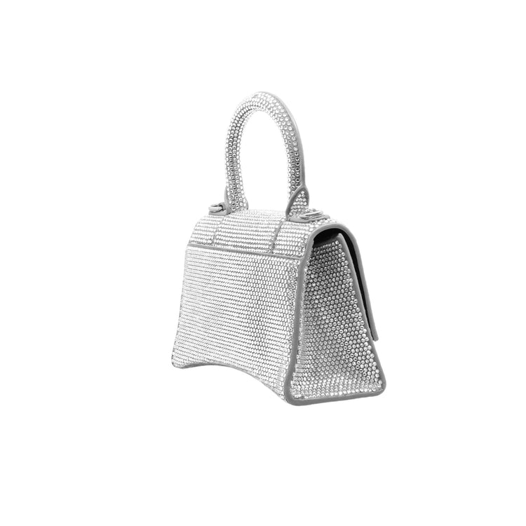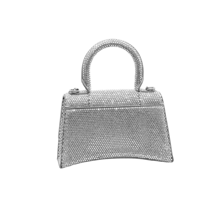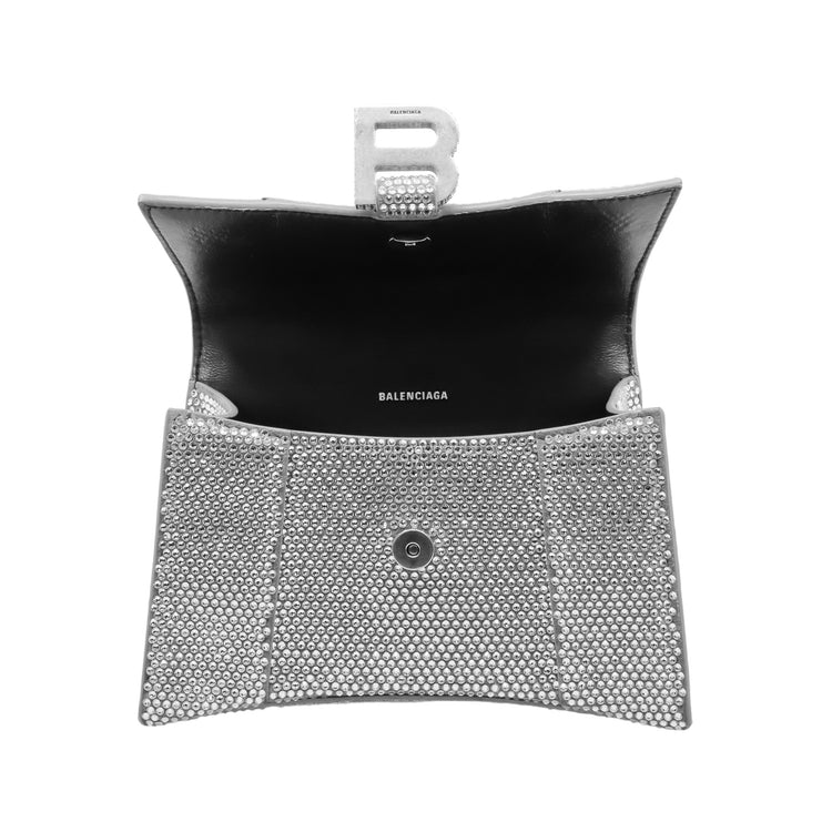 Bolso Balenciaga Hourglass Mini Crystal, confeccionado en piel de becerro y ante en color gris con pequeños cristales plateados en toda la superficie, cuenta con 1 asa rígida y strap de piel con cristales en los mismos colores, interior en piel color negro, con pequeñas manchas, herrajes en color plateado.