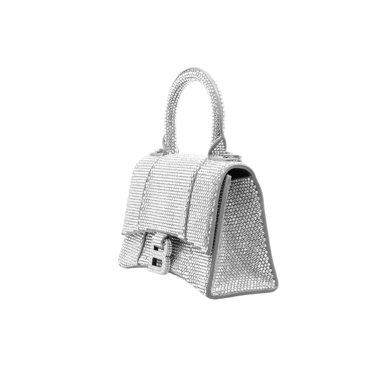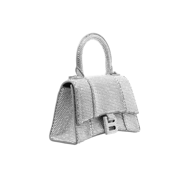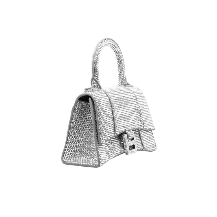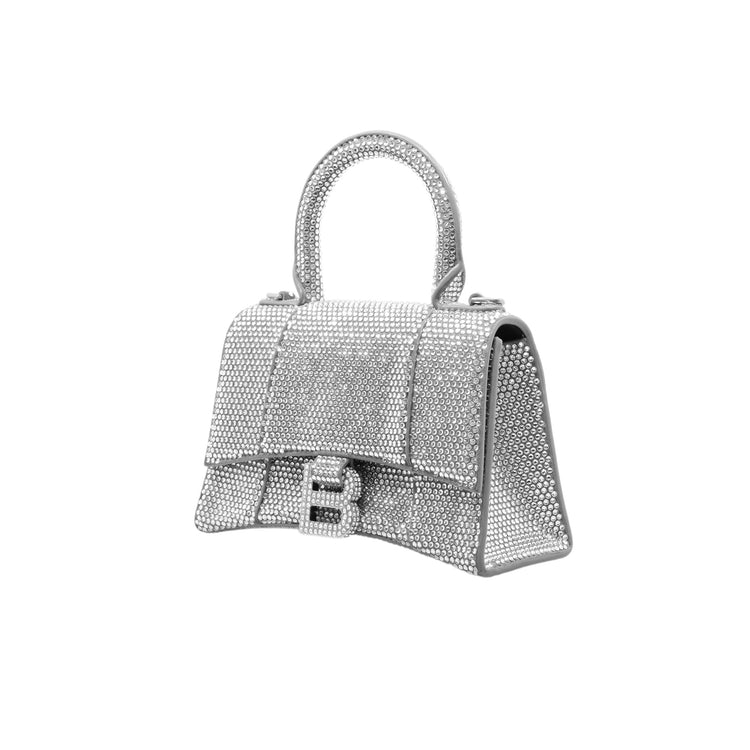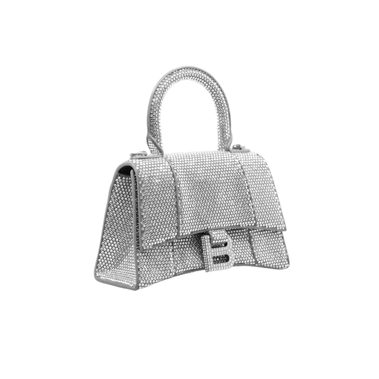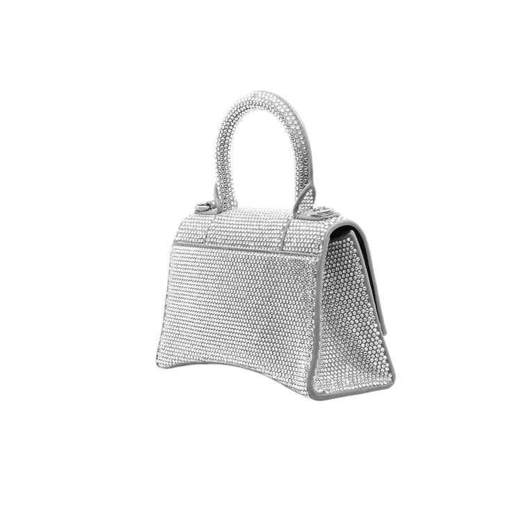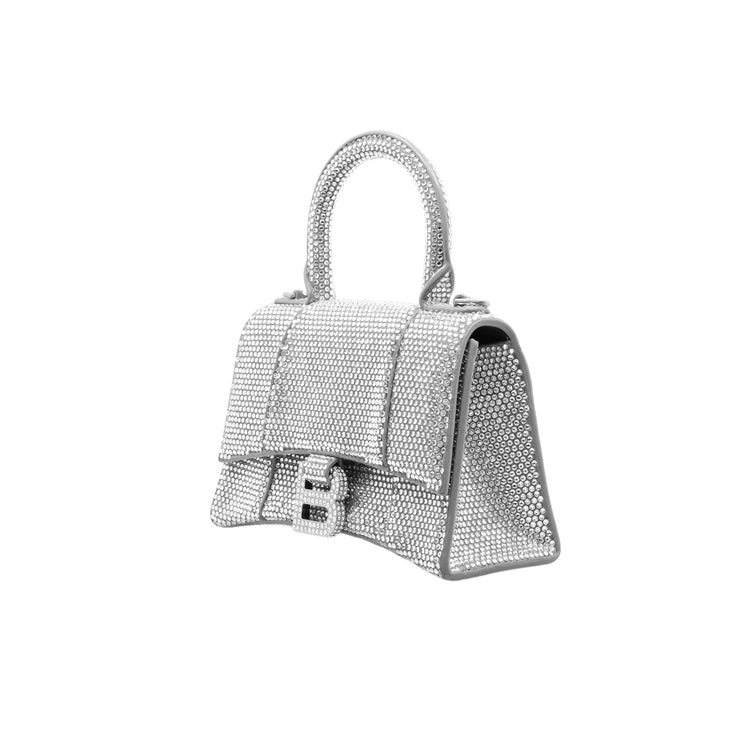 Bolso Balenciaga Hourglass Mini Crystal, confeccionado en piel de becerro y ante en color gris con pequeños cristales plateados en toda la superficie, cuenta con 1 asa rígida y strap de piel con cristales en los mismos colores, interior en piel color negro, con pequeñas manchas, herrajes en color plateado.