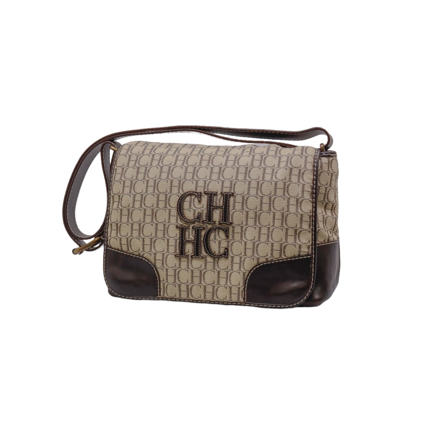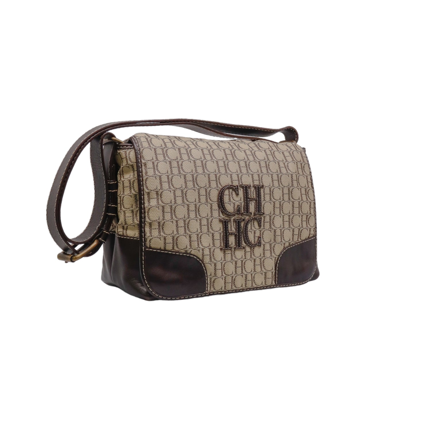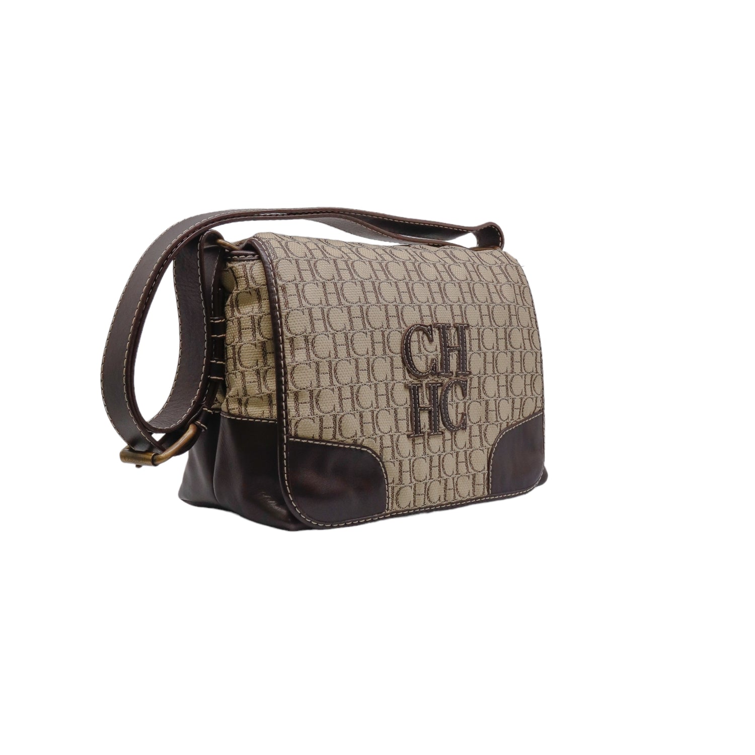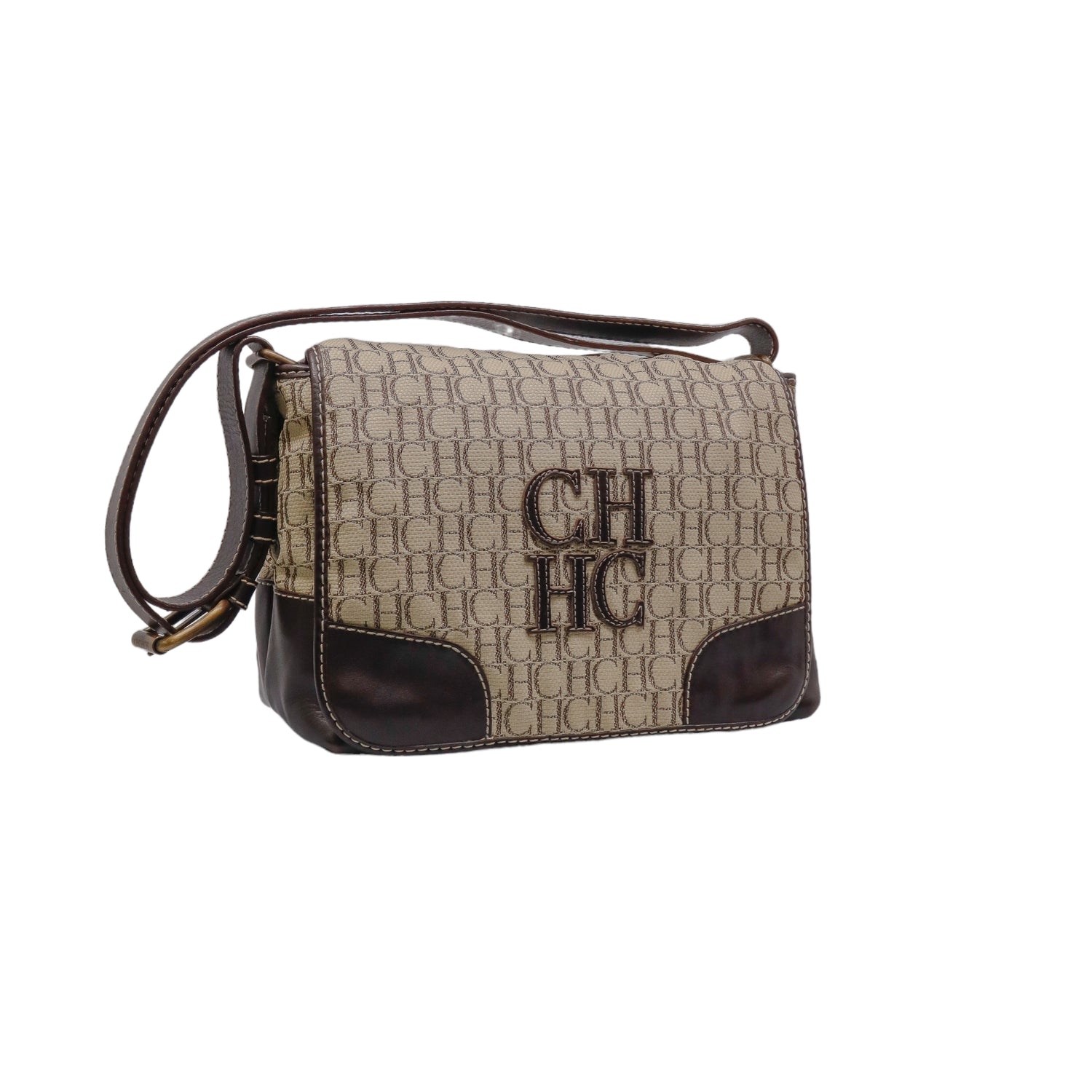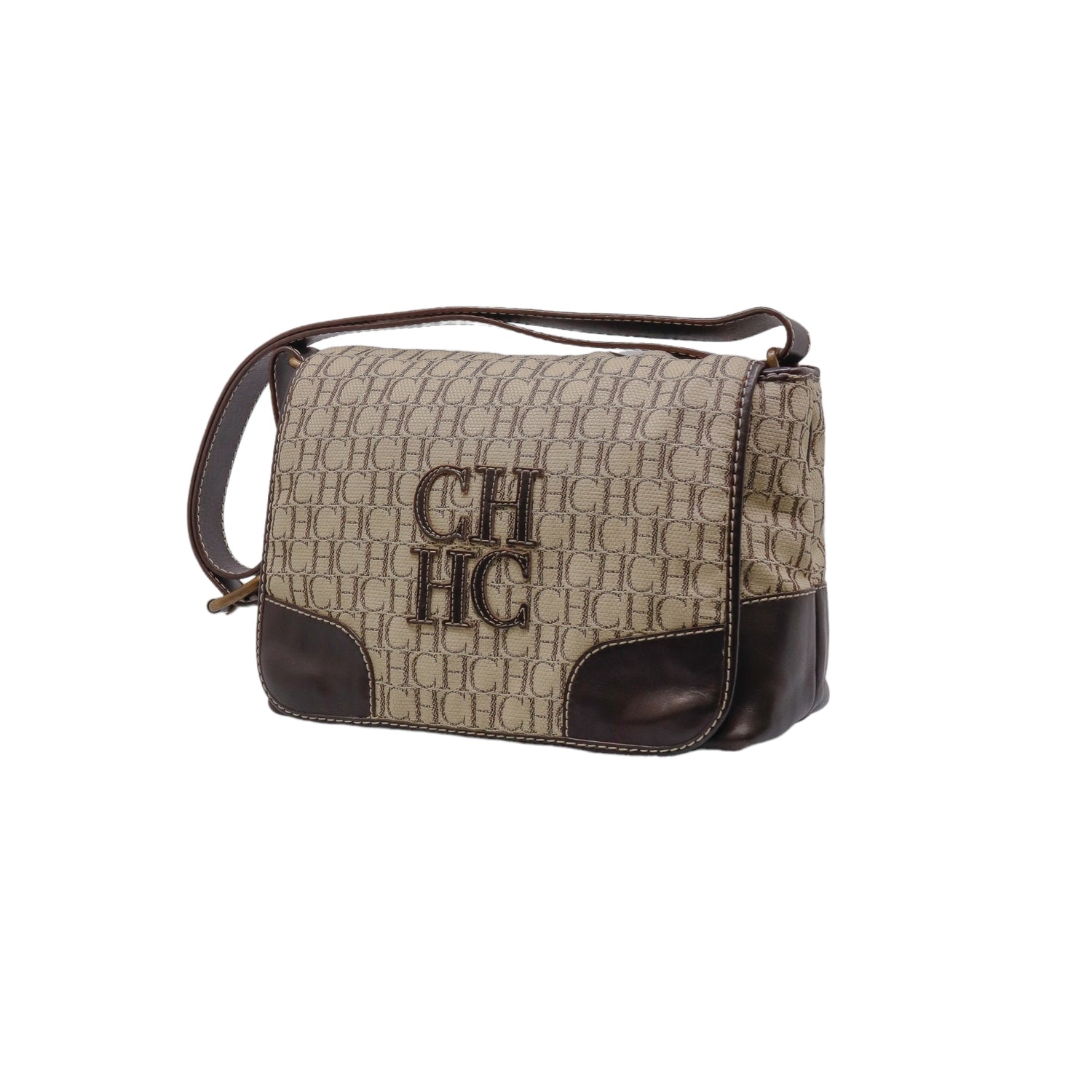Bolso Carolina Herrera de la línea Caracas, confeccionado en jacquard beige con las iniciales de la marca en la solapa, forro interno en tela, base , esquinas, solapa y bandolera de piel color café, bolsillo interior con cierre de cremallera, poco desgaste, herrajes en color bronce.