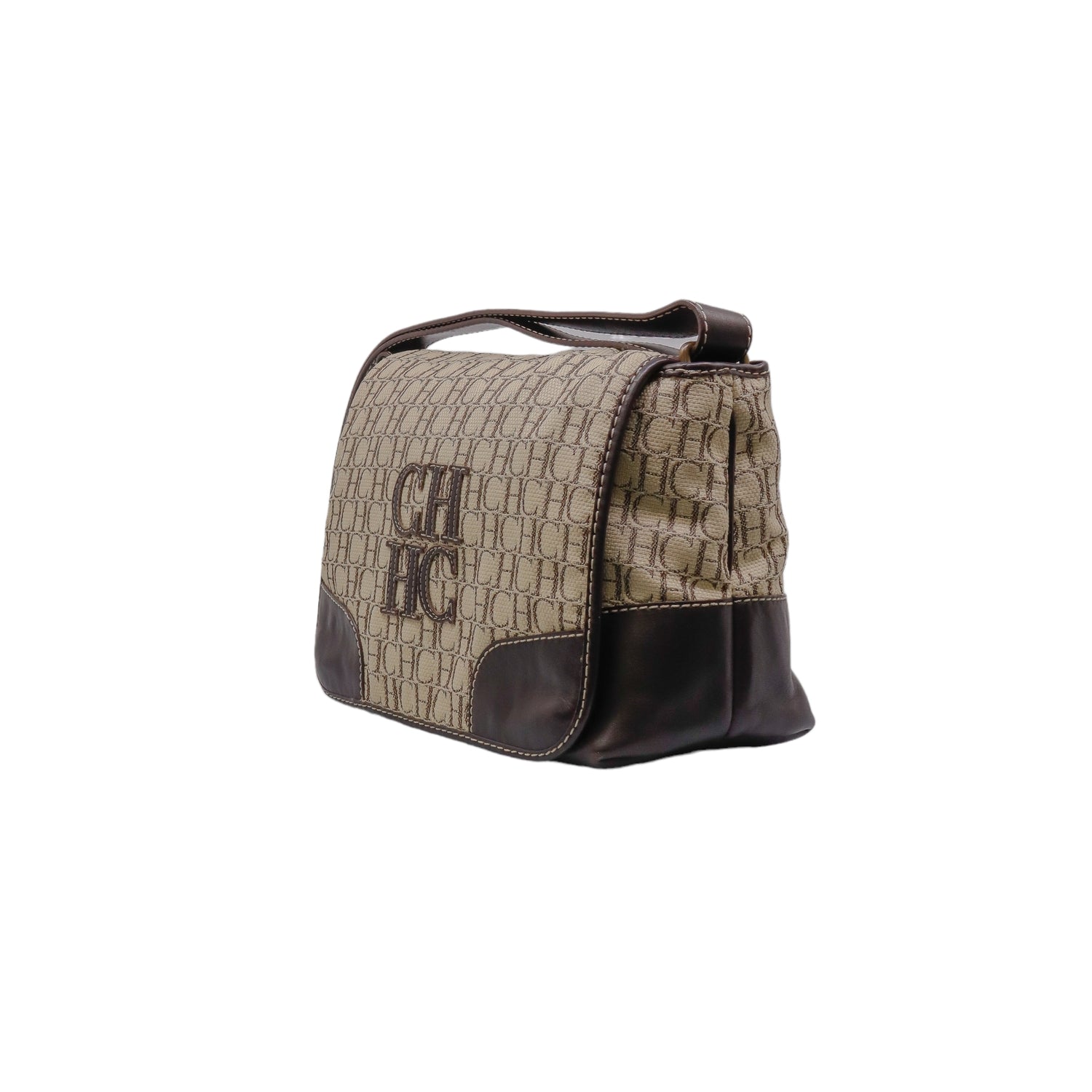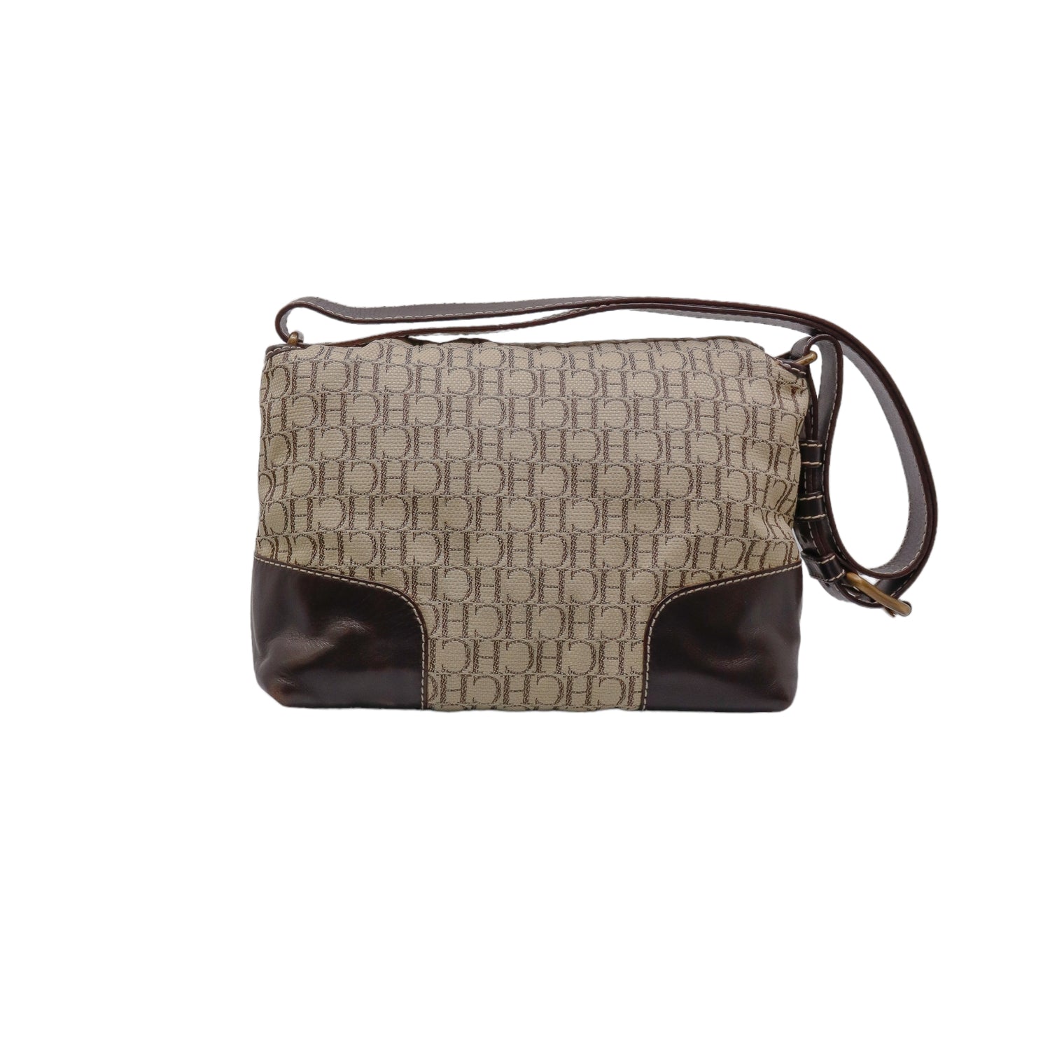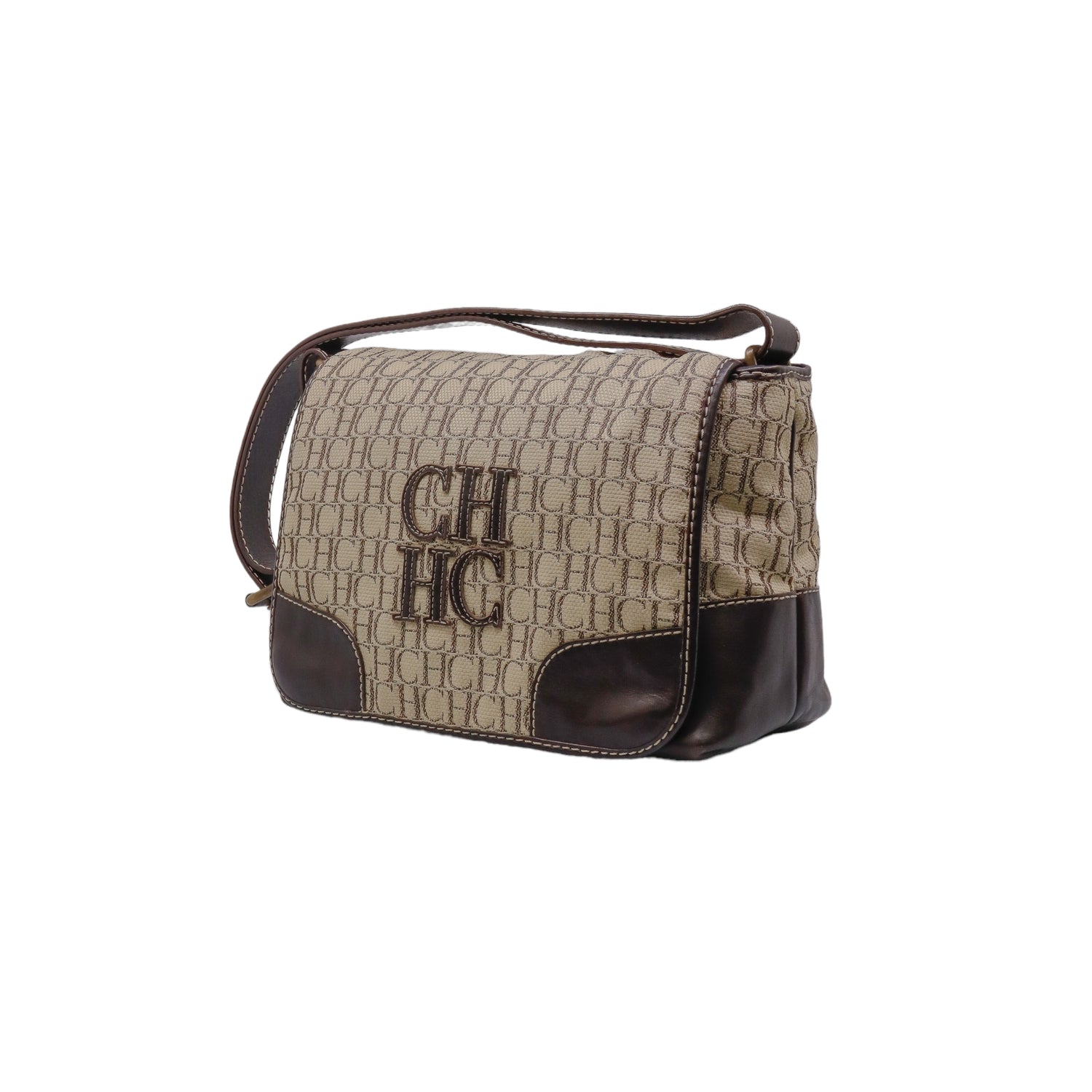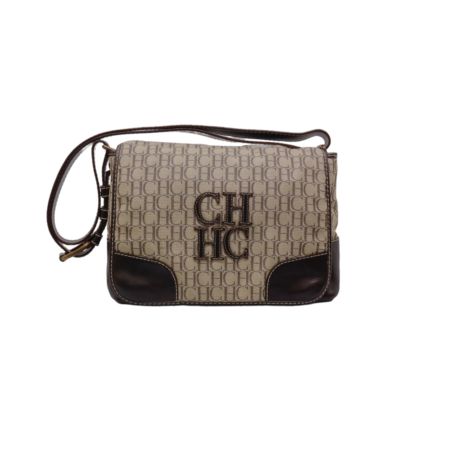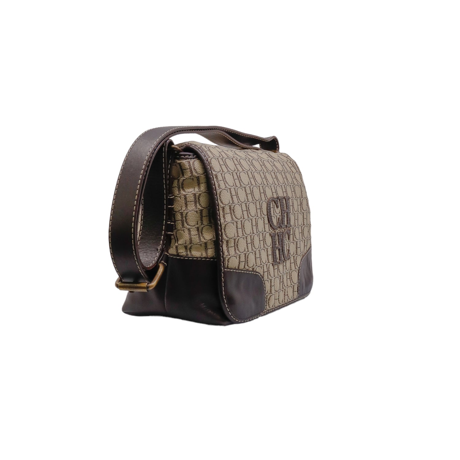 Bolso Carolina Herrera de la línea Caracas, confeccionado en jacquard beige con las iniciales de la marca en la solapa, forro interno en tela, base , esquinas, solapa y bandolera de piel color café, bolsillo interior con cierre de cremallera, poco desgaste, herrajes en color bronce.
