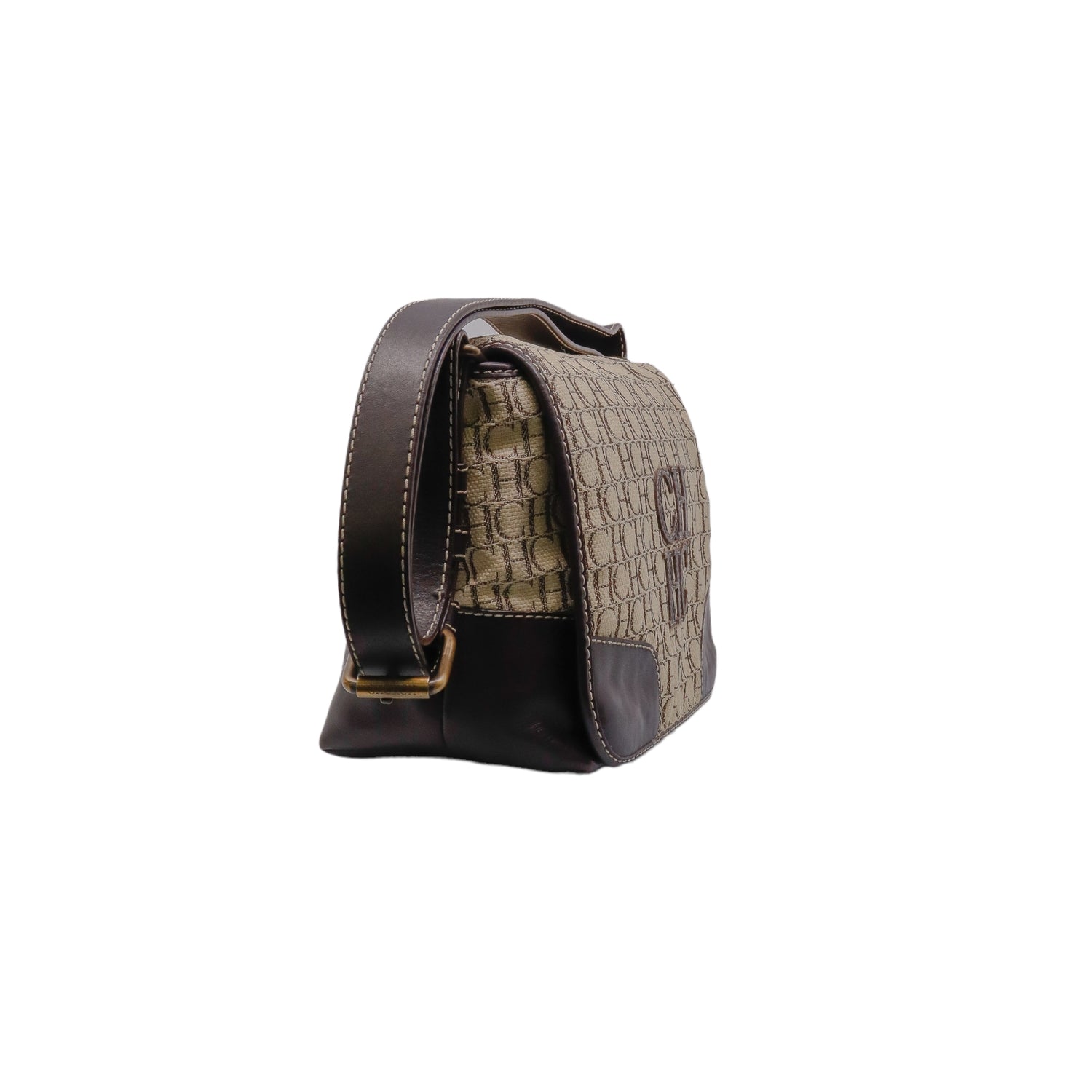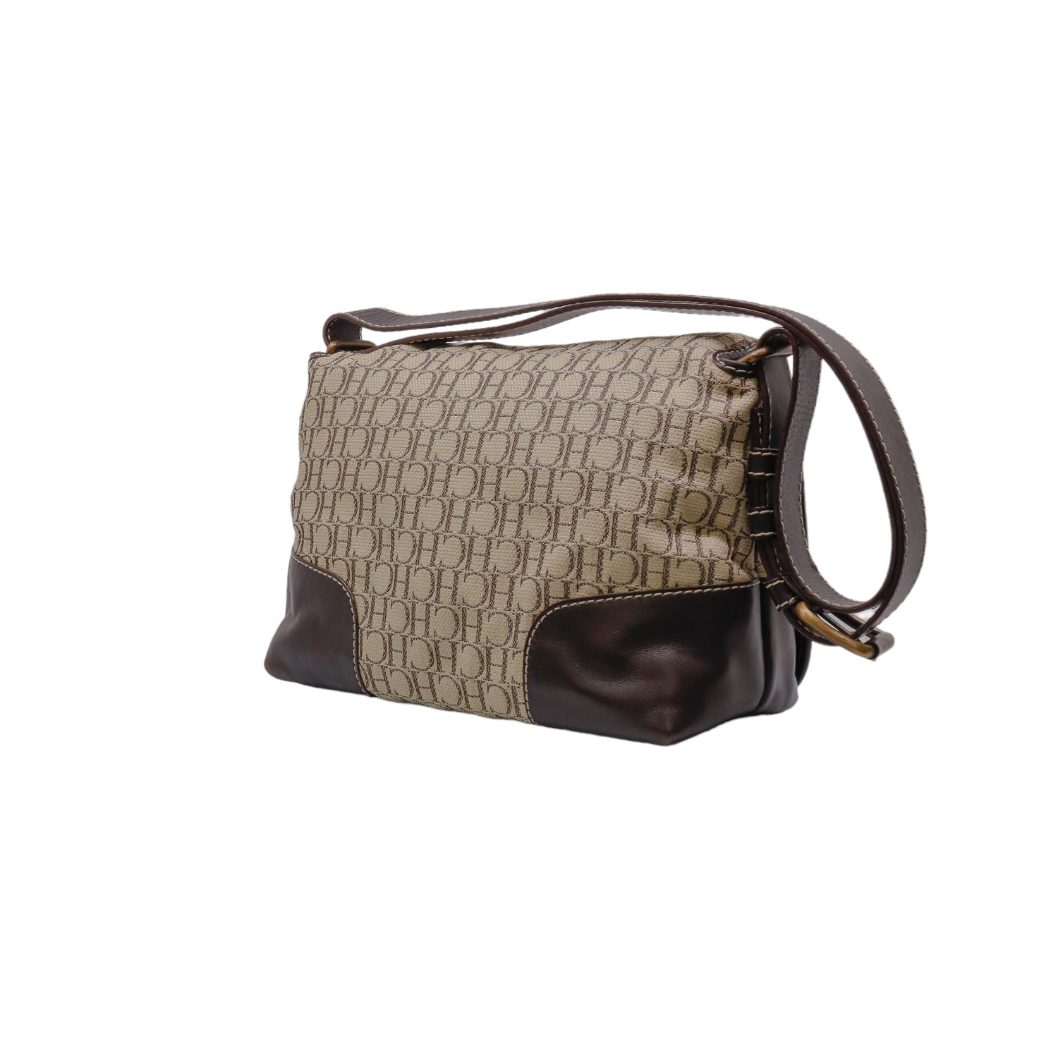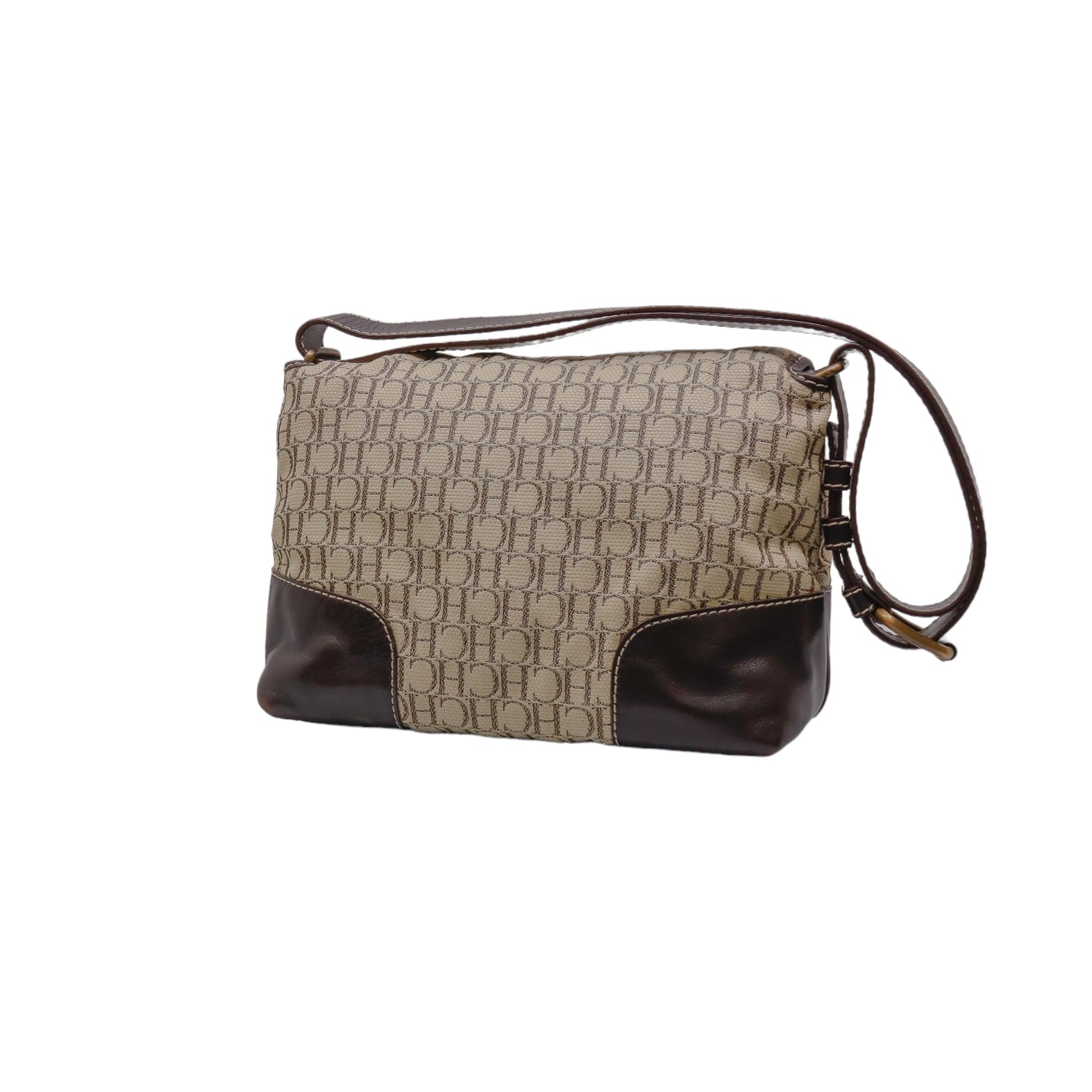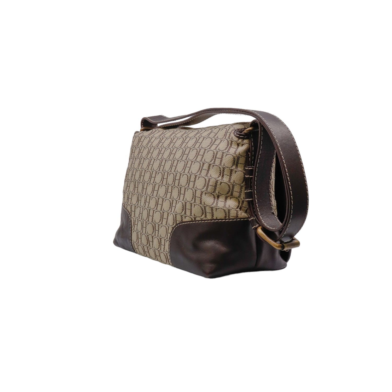 Bolso Carolina Herrera de la línea Caracas, confeccionado en jacquard beige con las iniciales de la marca en la solapa, forro interno en tela, base , esquinas, solapa y bandolera de piel color café, bolsillo interior con cierre de cremallera, poco desgaste, herrajes en color bronce.