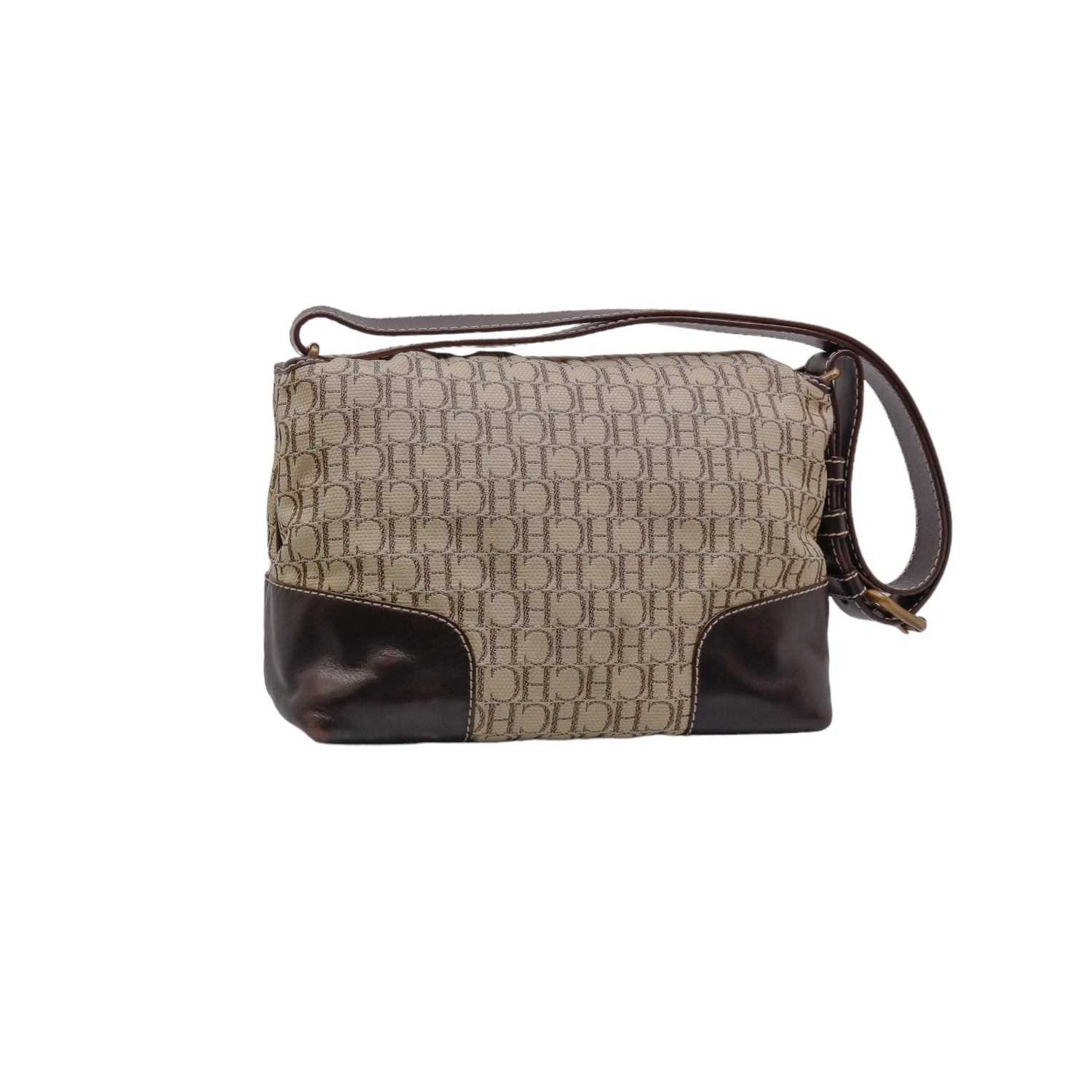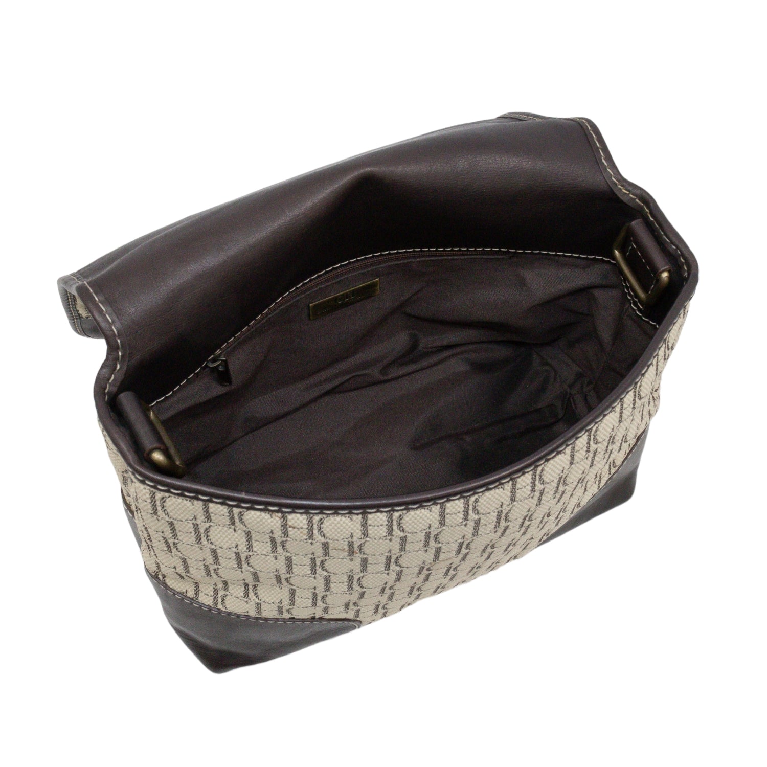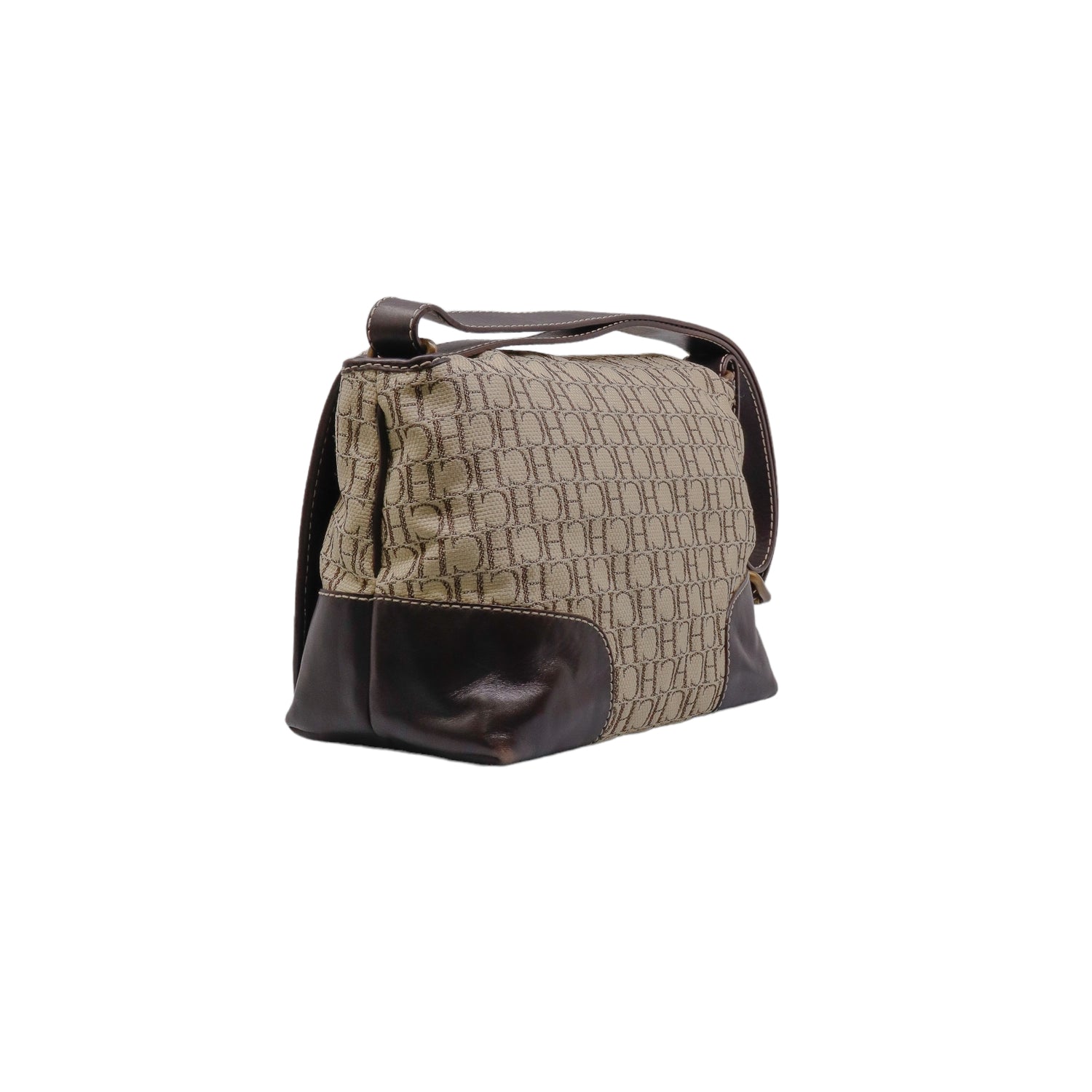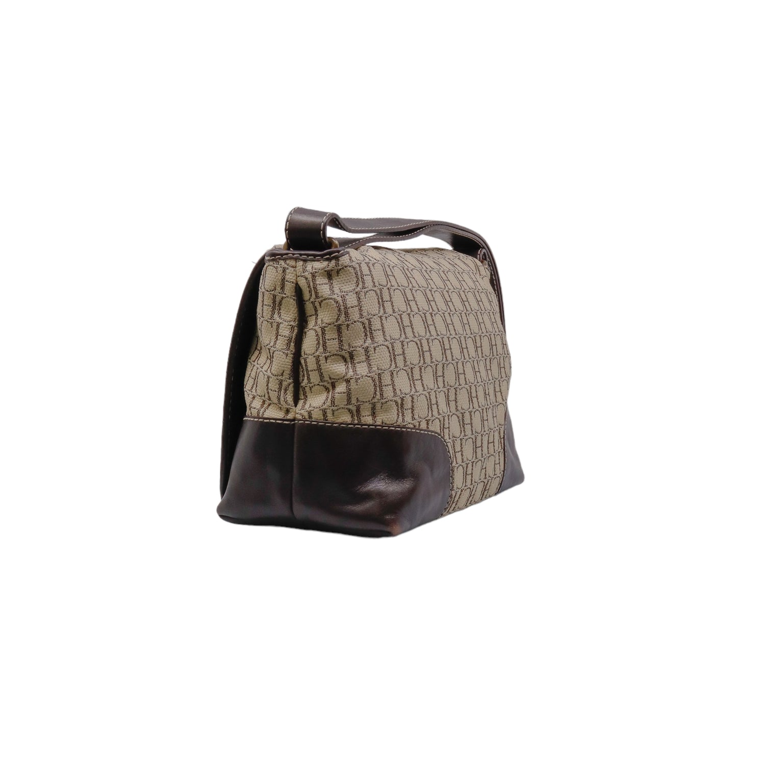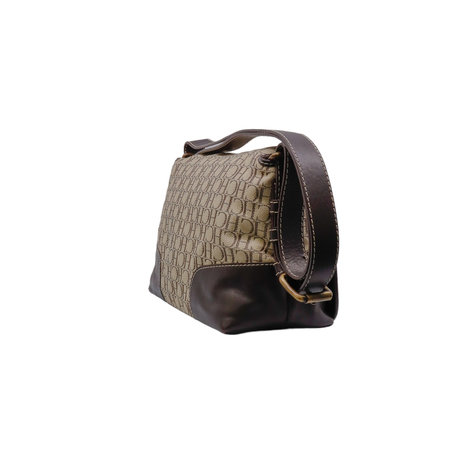 Bolso Carolina Herrera de la línea Caracas, confeccionado en jacquard beige con las iniciales de la marca en la solapa, forro interno en tela, base , esquinas, solapa y bandolera de piel color café, bolsillo interior con cierre de cremallera, poco desgaste, herrajes en color bronce.