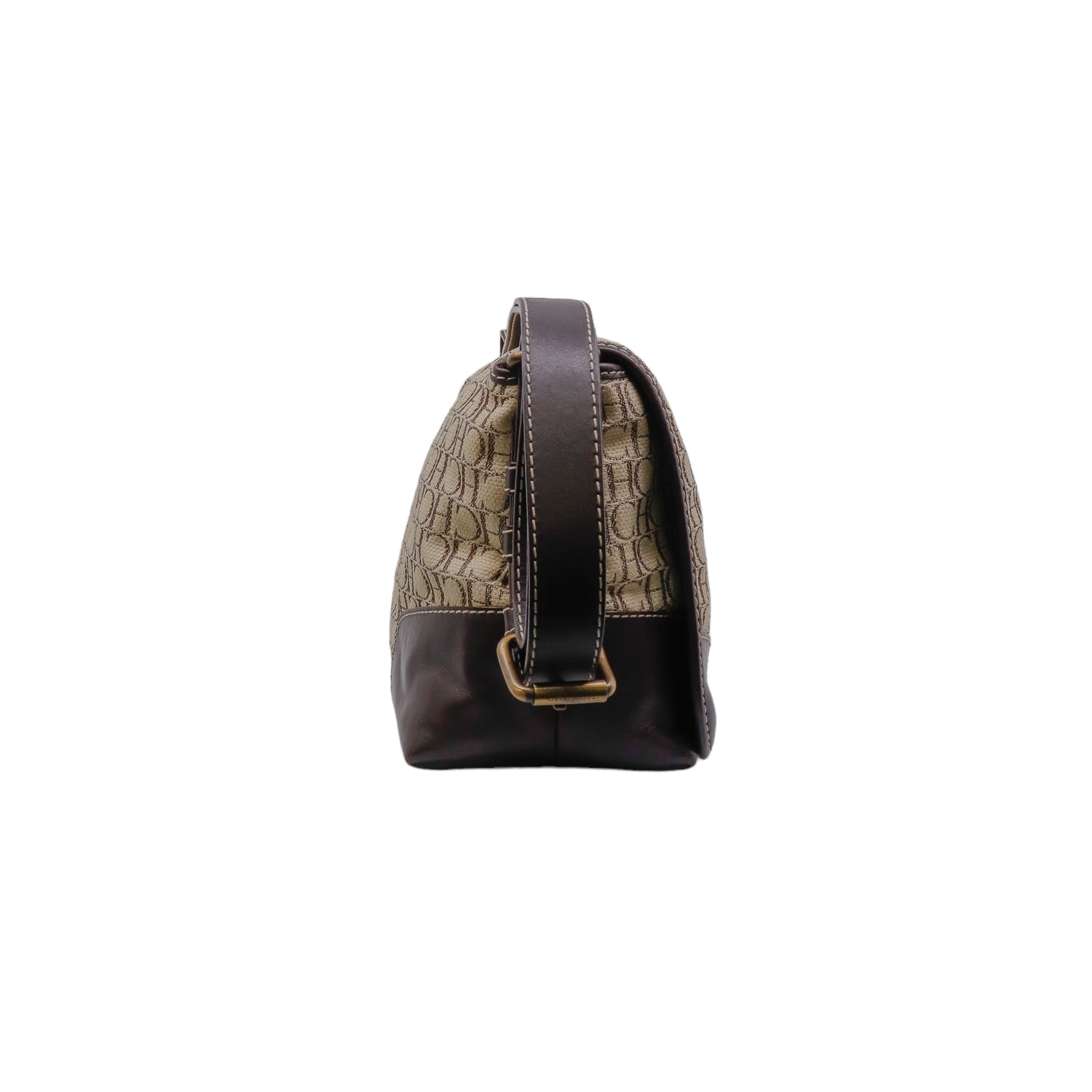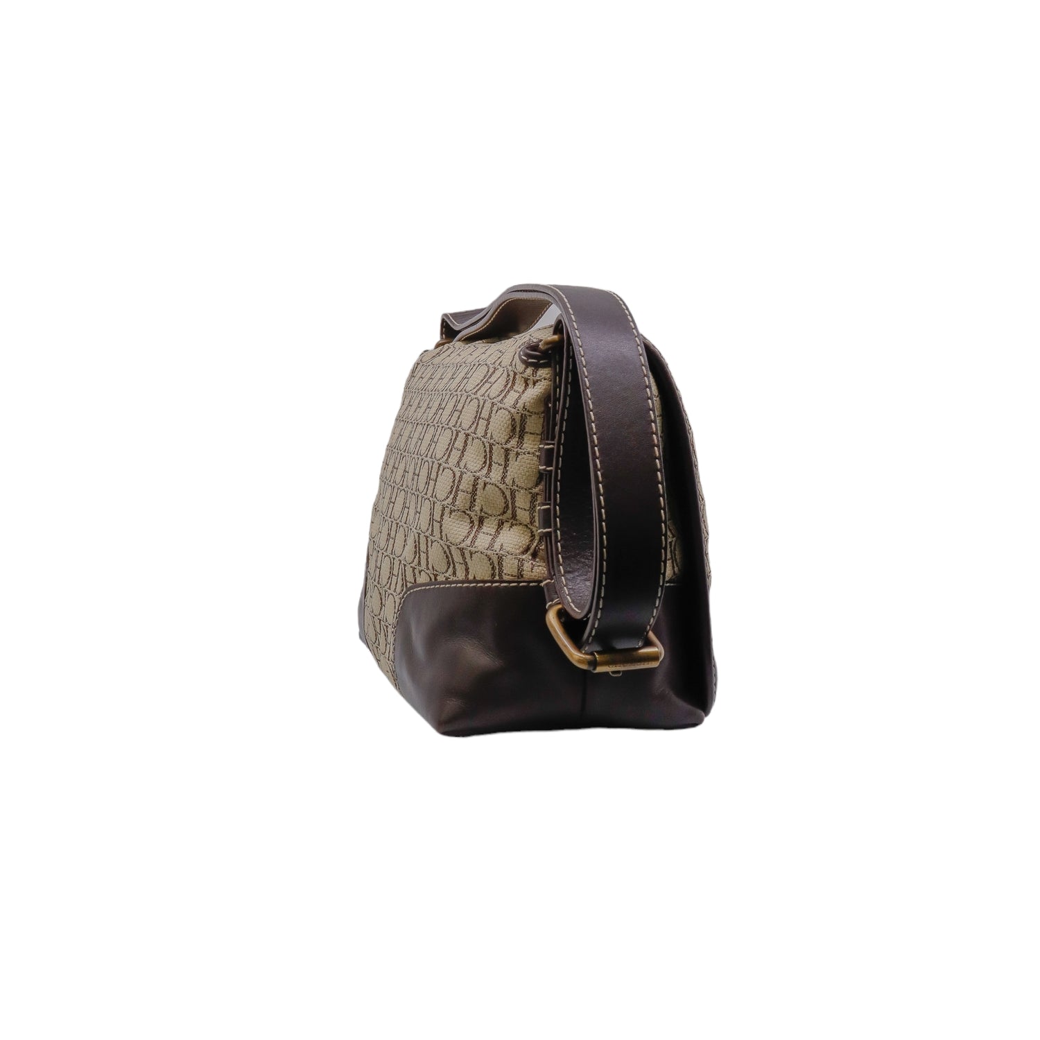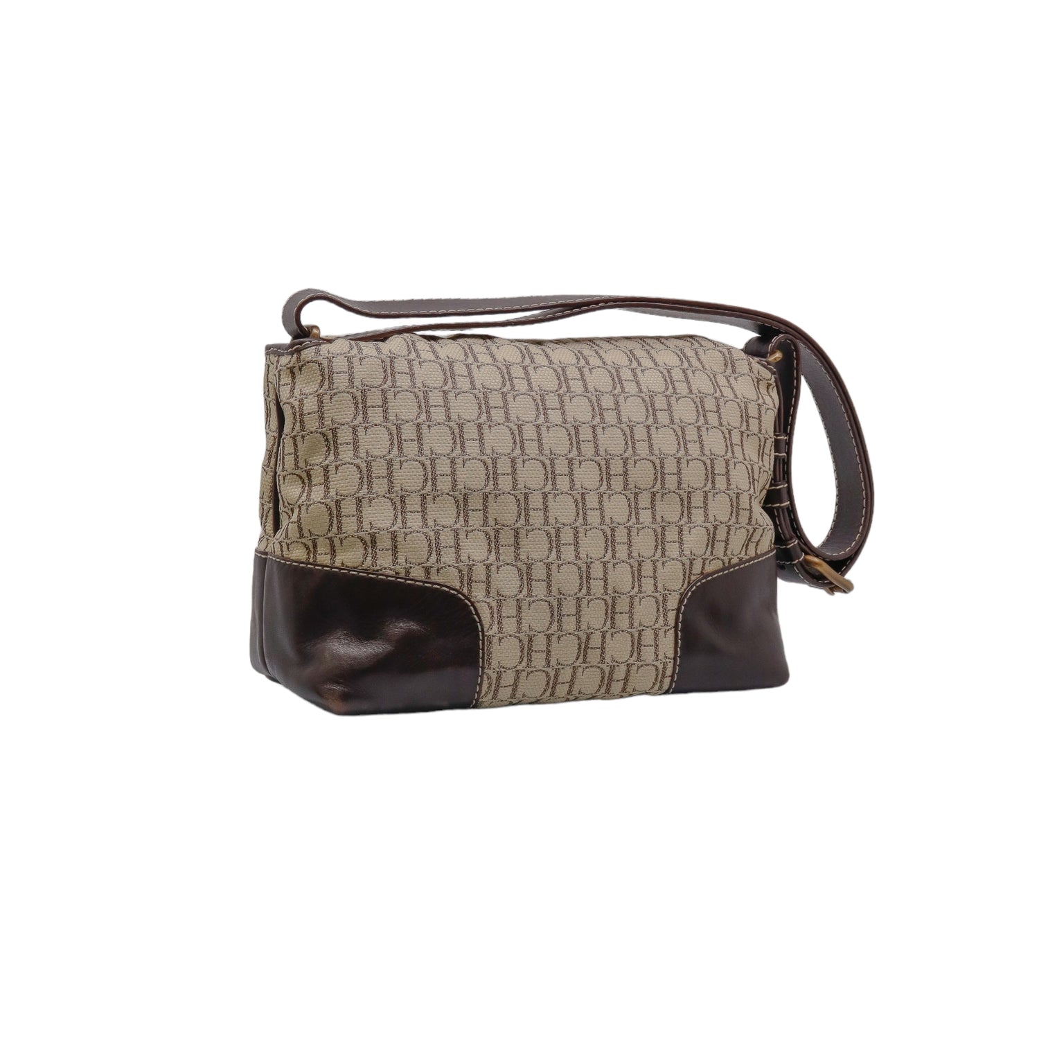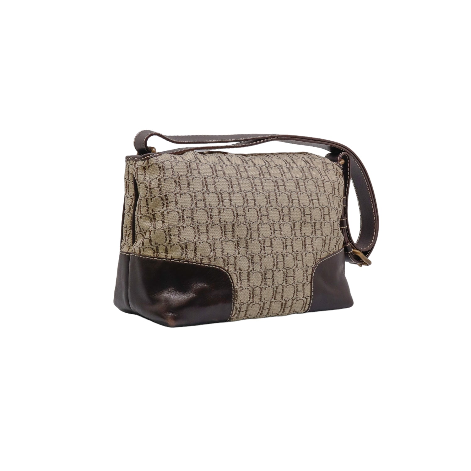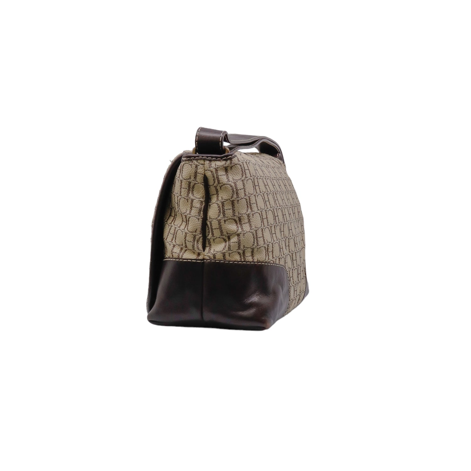 Bolso Carolina Herrera de la línea Caracas, confeccionado en jacquard beige con las iniciales de la marca en la solapa, forro interno en tela, base , esquinas, solapa y bandolera de piel color café, bolsillo interior con cierre de cremallera, poco desgaste, herrajes en color bronce.