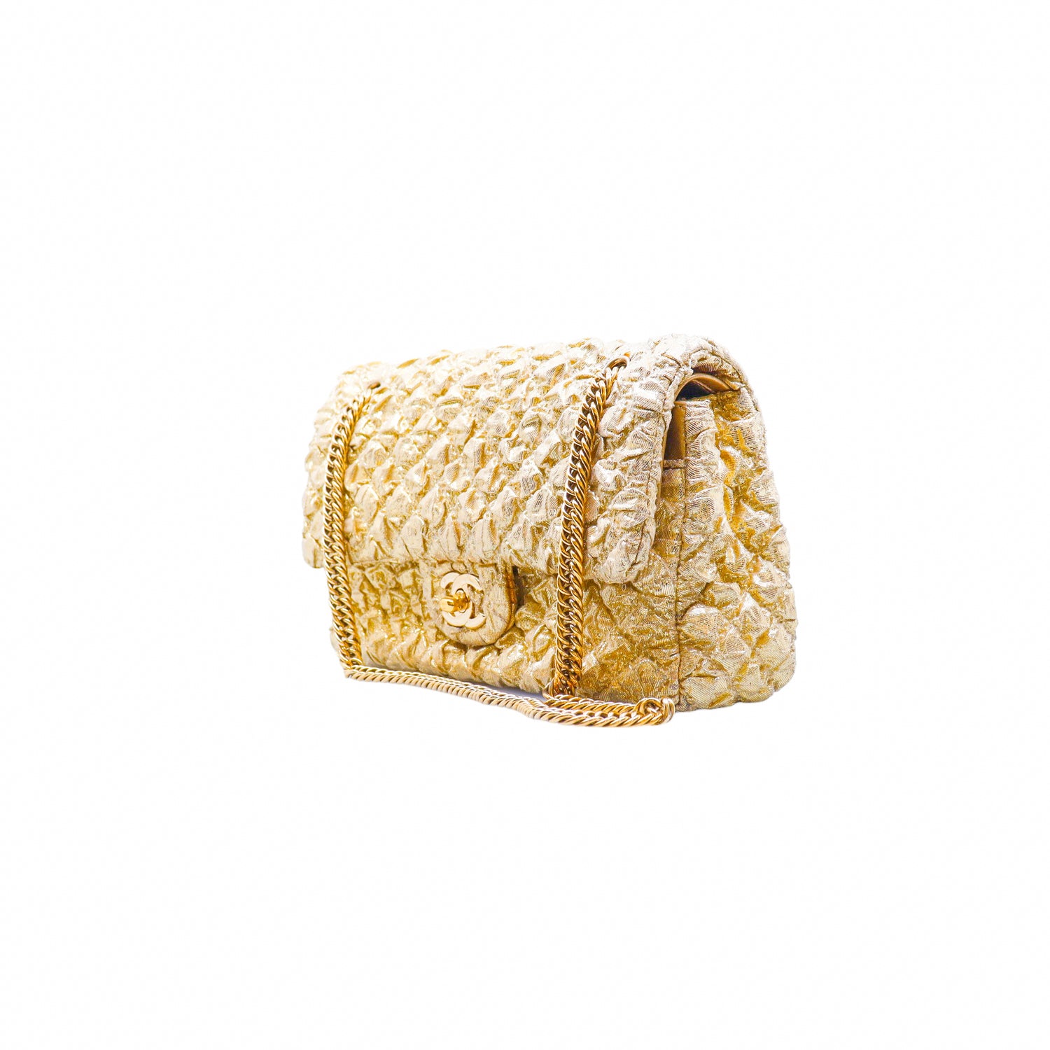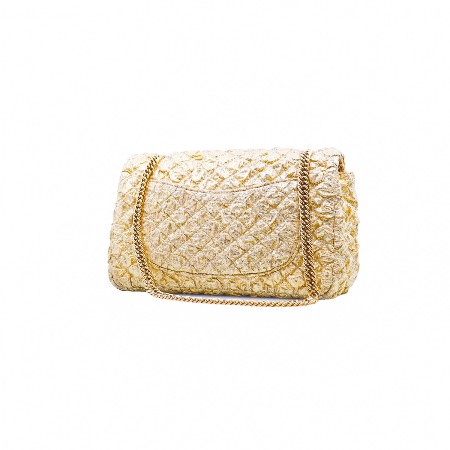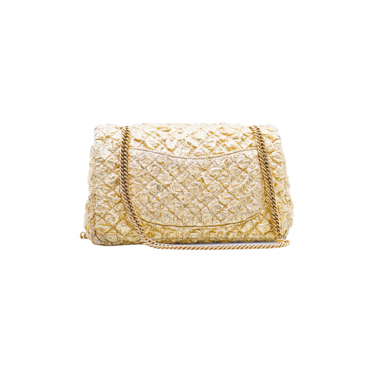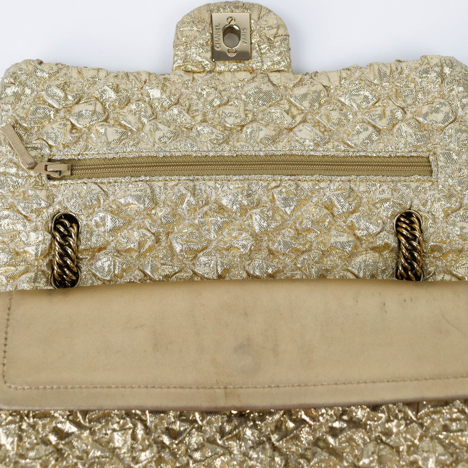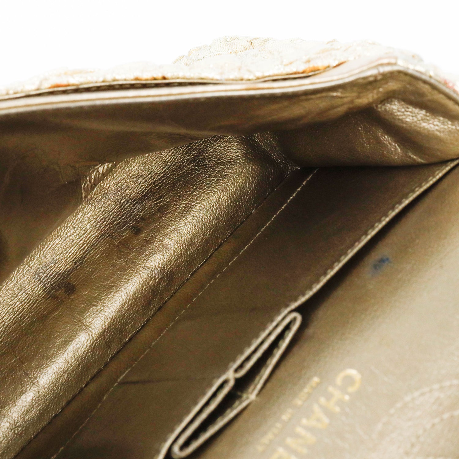 Bolso Chanel Clásico Double Flap, confeccionado en lame dorado, con herrajes y cadena en mismo color, con desgaste por uso en parte trasera, poco sucia por dentro, leves desgaste en base.