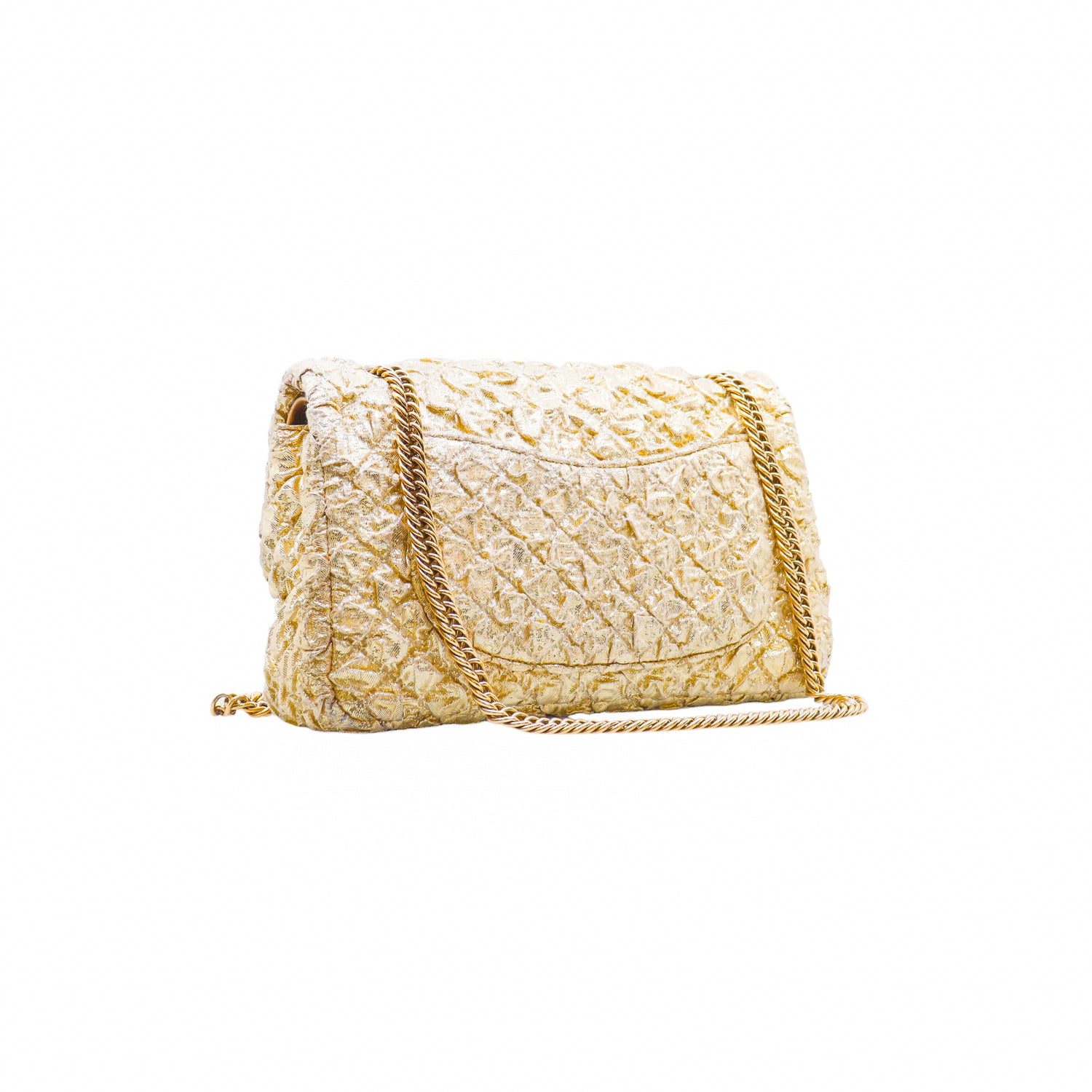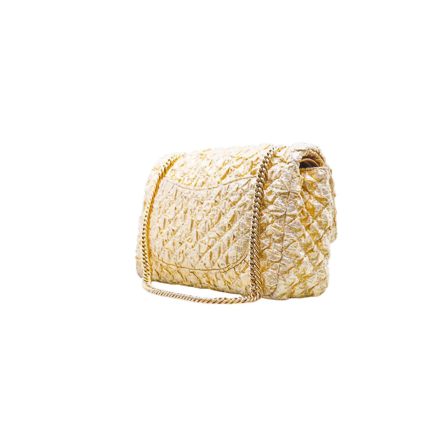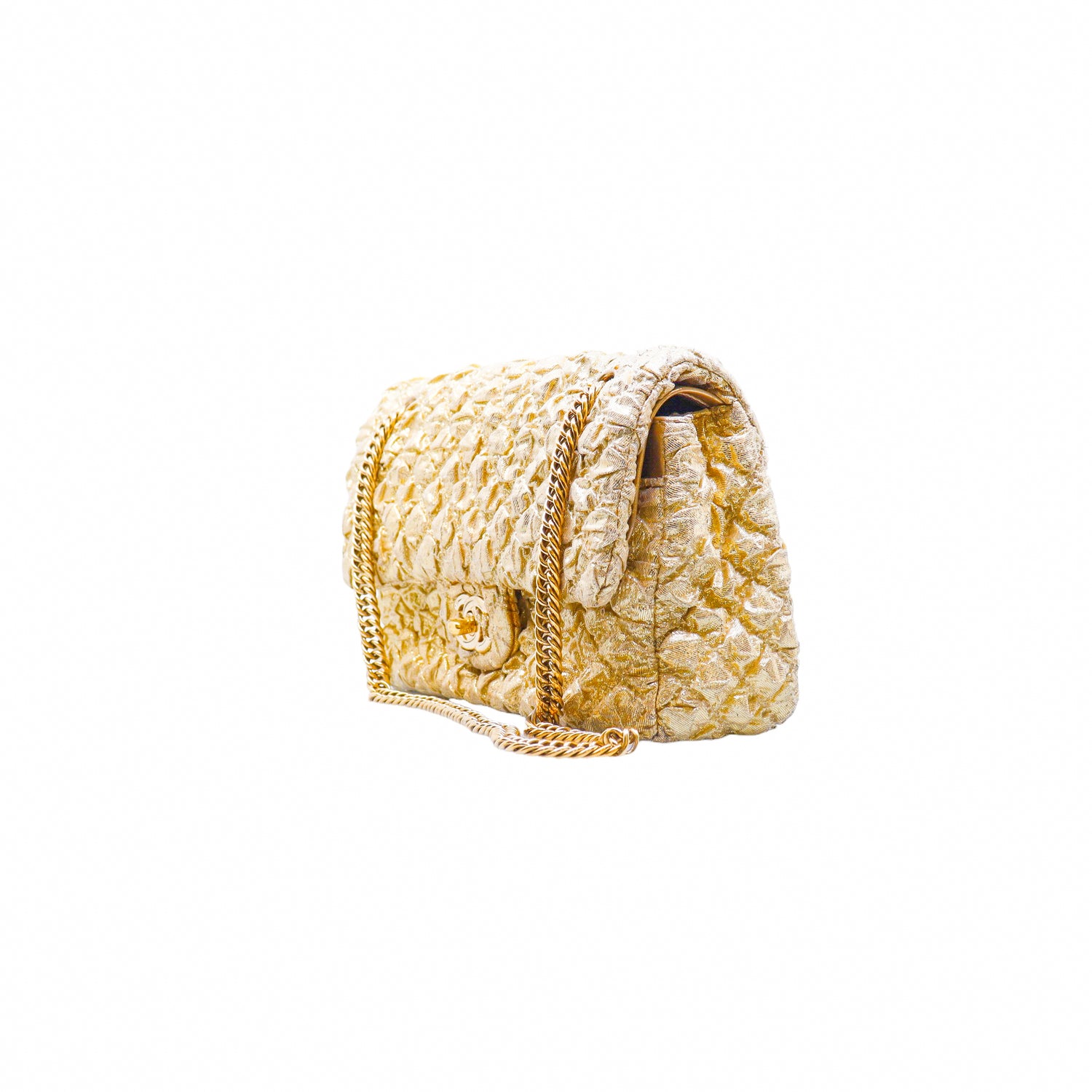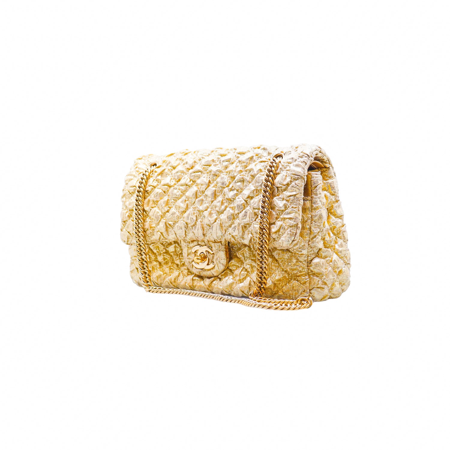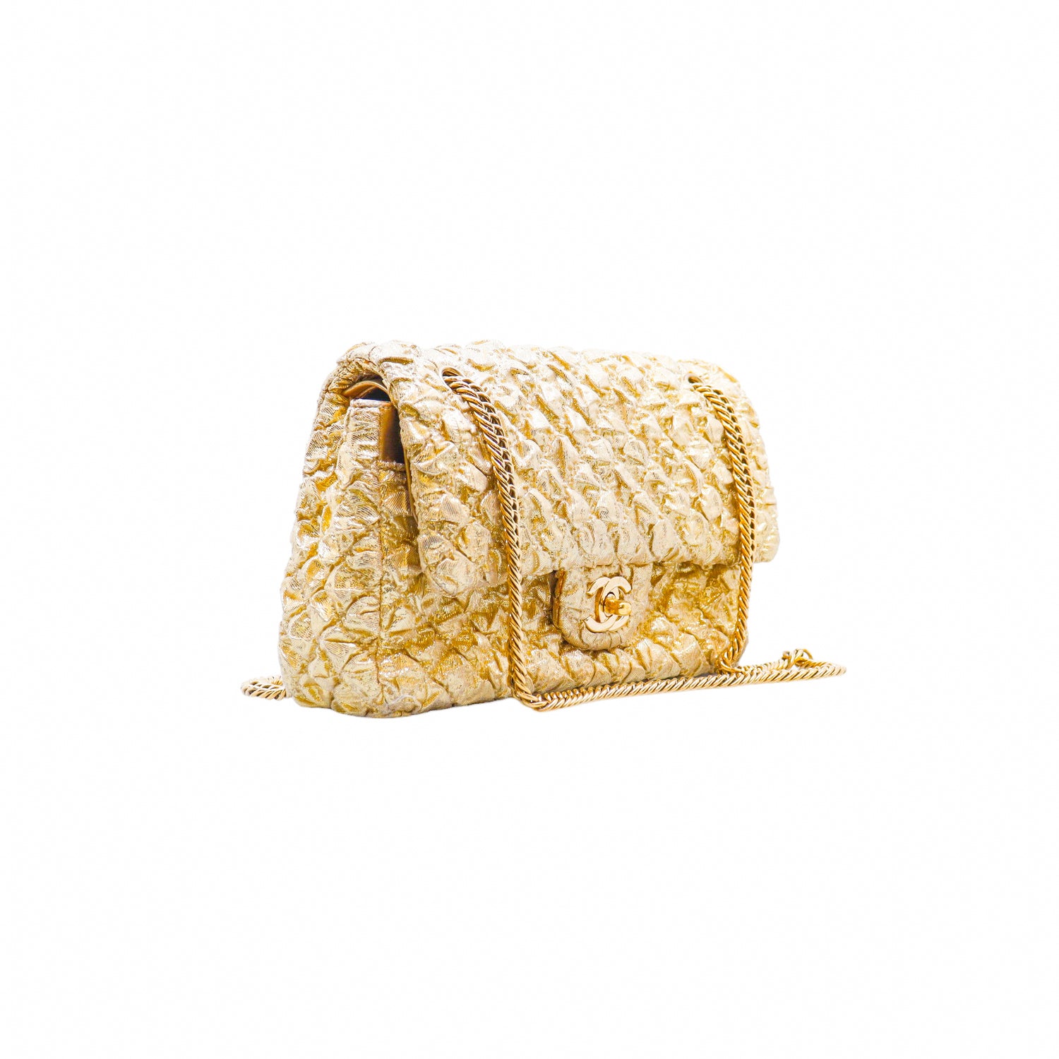 Bolso Chanel Clásico Double Flap, confeccionado en lame dorado, con herrajes y cadena en mismo color, con desgaste por uso en parte trasera, poco sucia por dentro, leves desgaste en base.