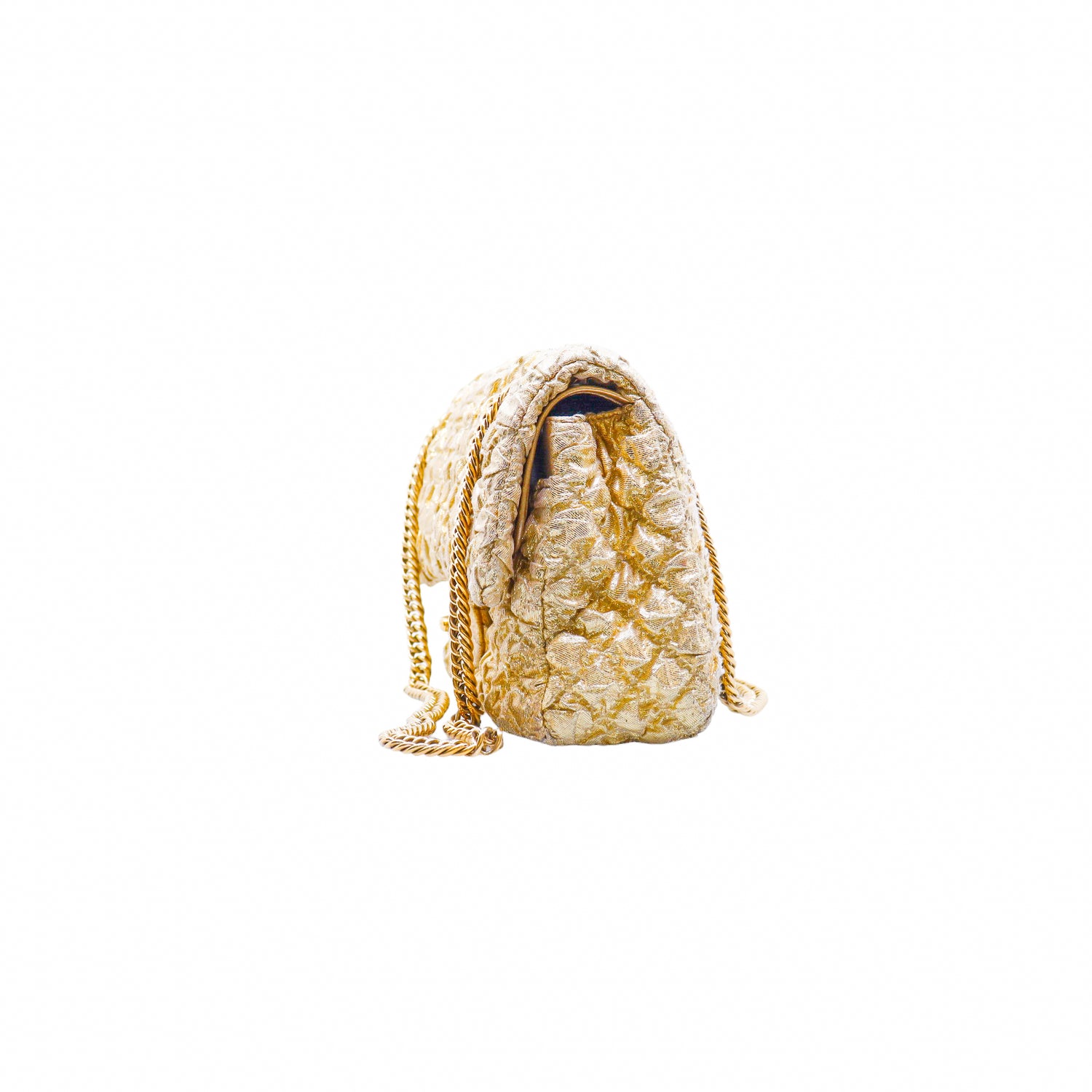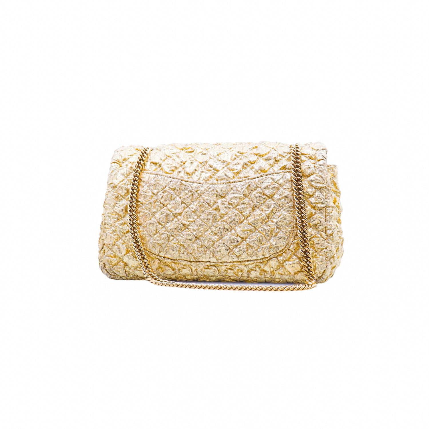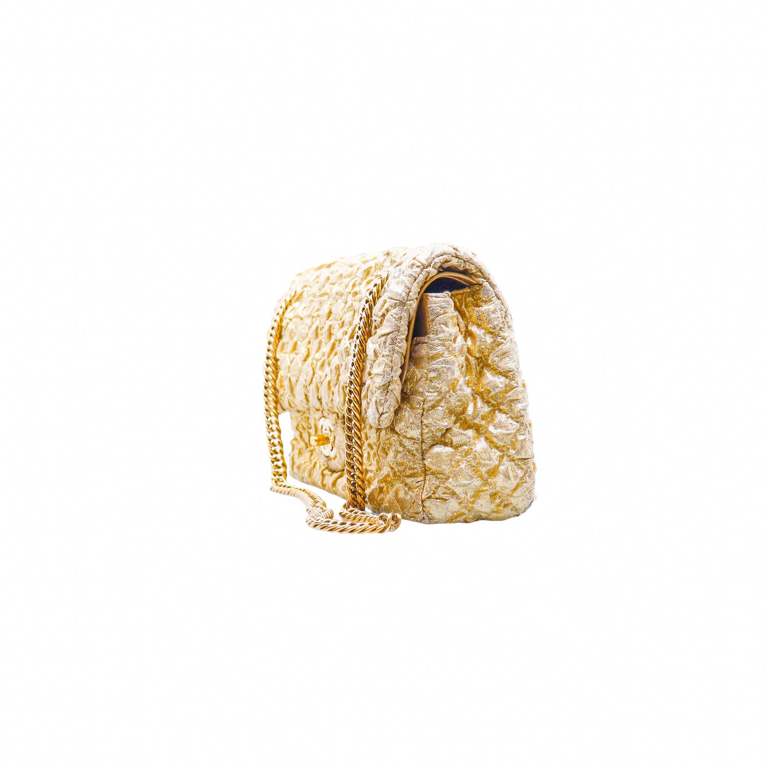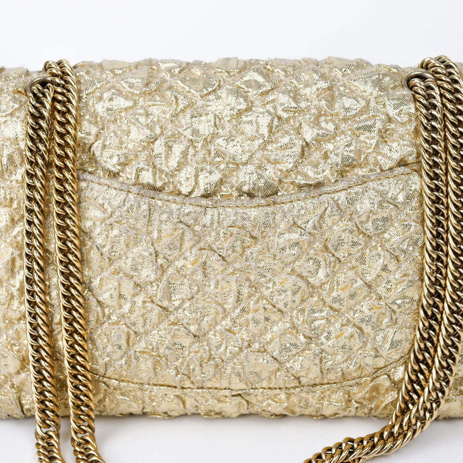Bolso Chanel Clásico Double Flap, confeccionado en lame dorado, con herrajes y cadena en mismo color, con desgaste por uso en parte trasera, poco sucia por dentro, leves desgaste en base.