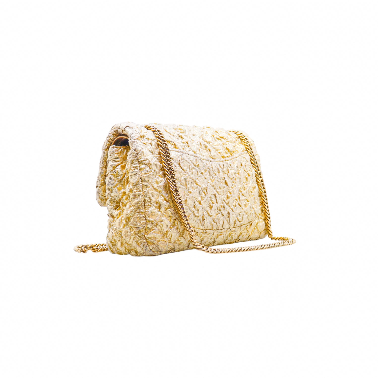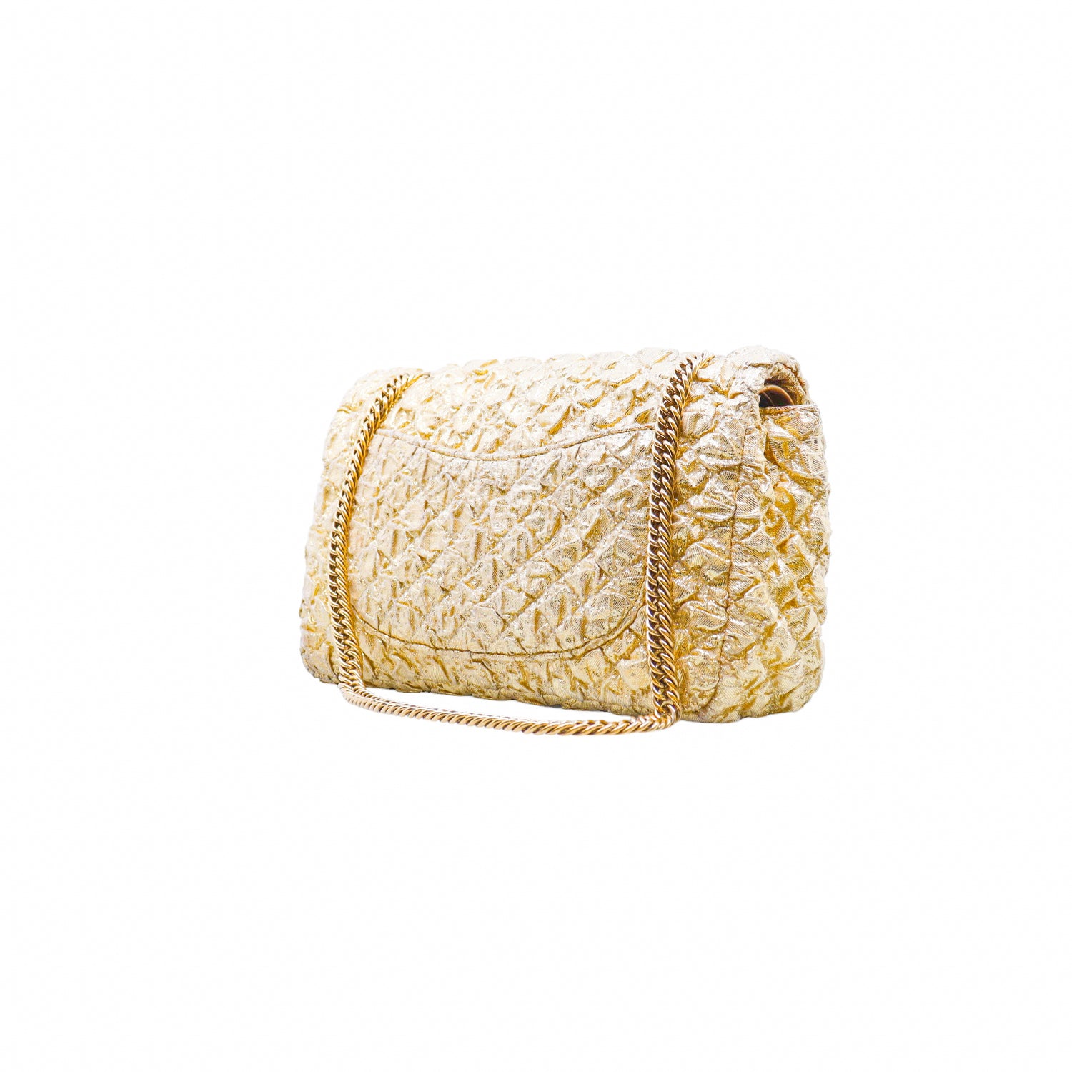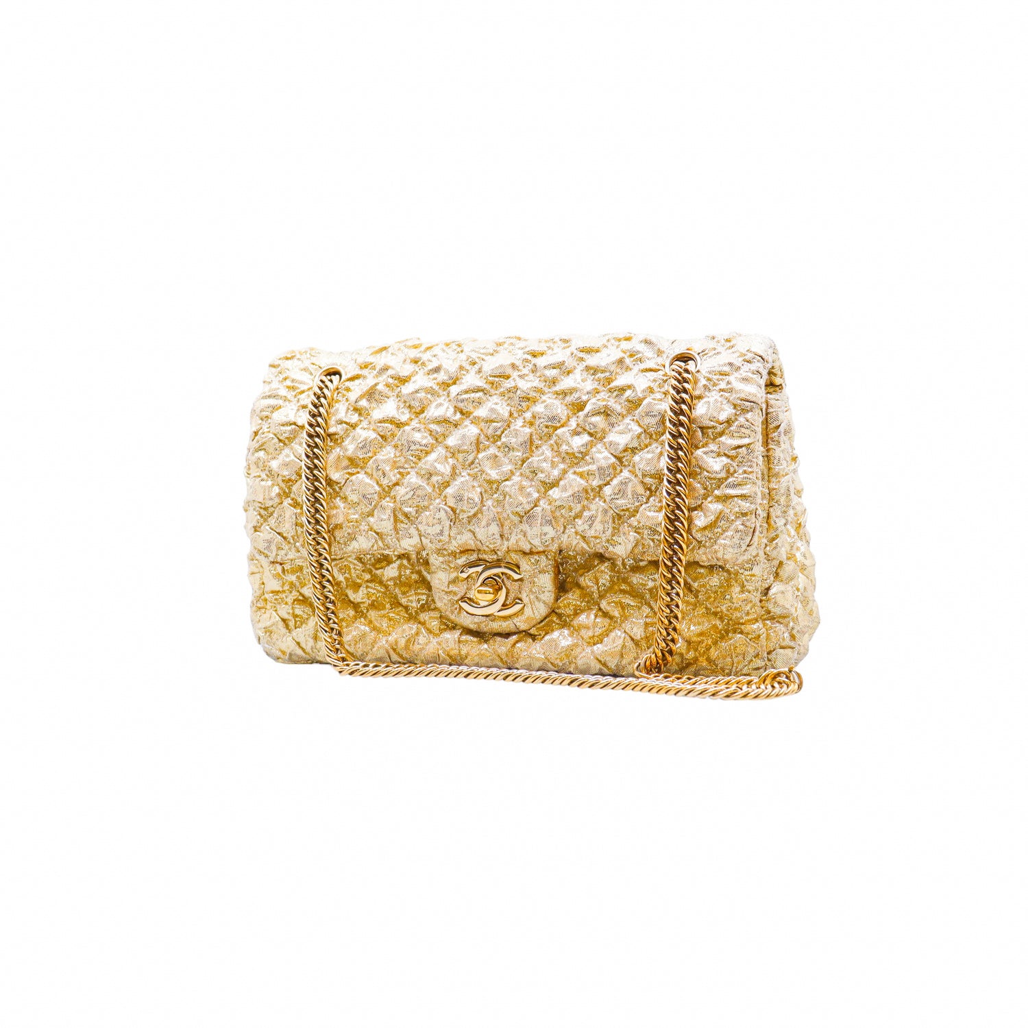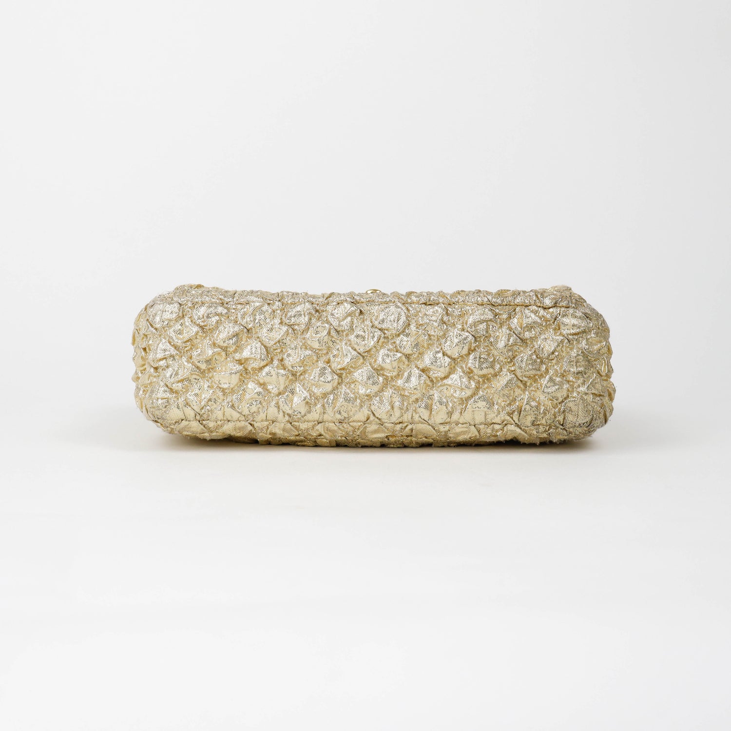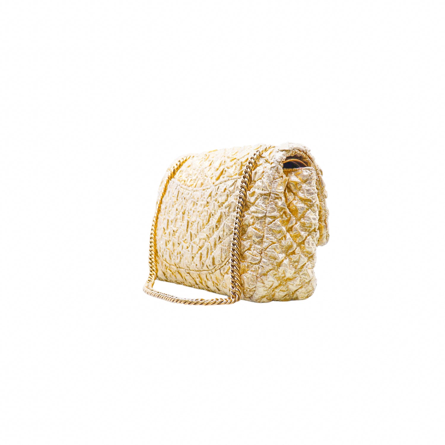 Bolso Chanel Clásico Double Flap, confeccionado en lame dorado, con herrajes y cadena en mismo color, con desgaste por uso en parte trasera, poco sucia por dentro, leves desgaste en base.