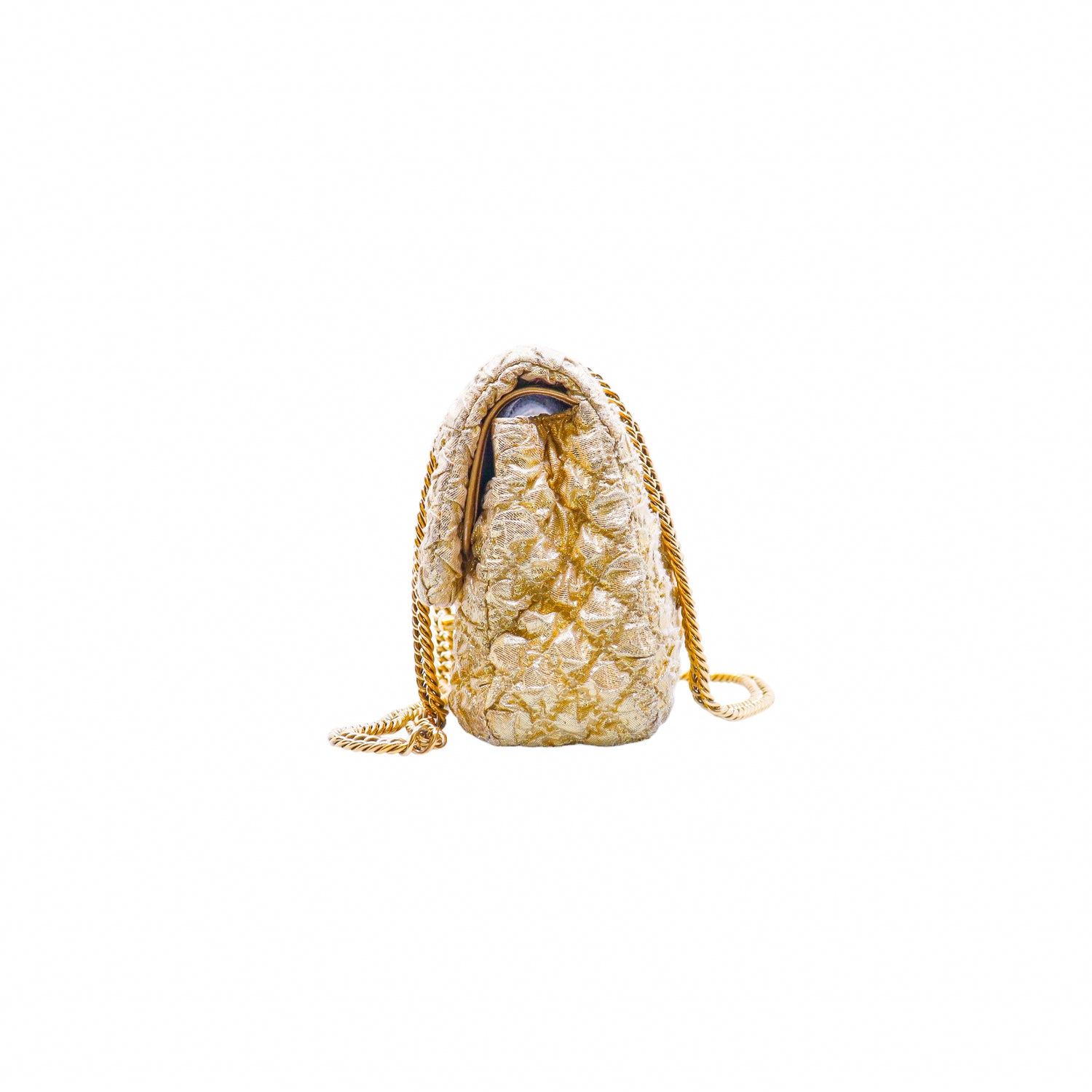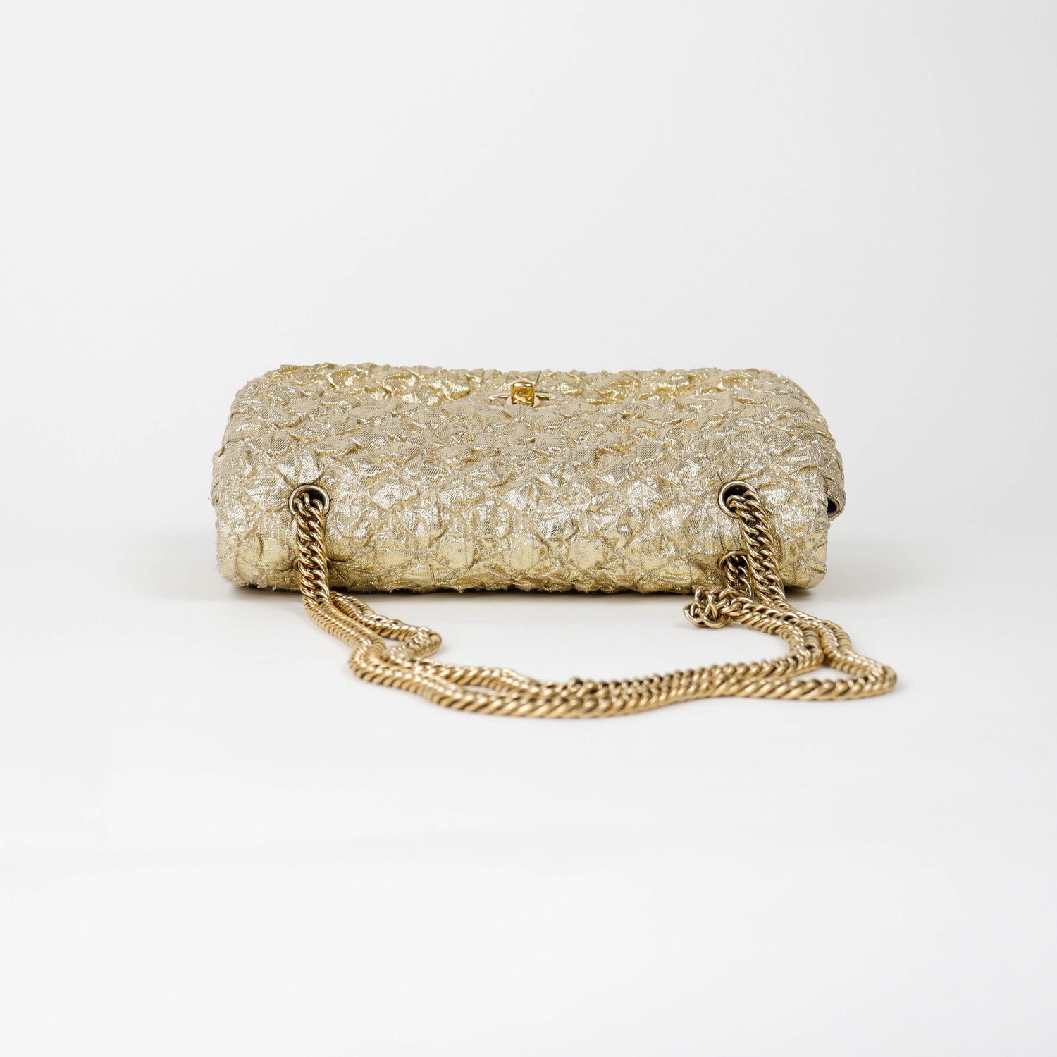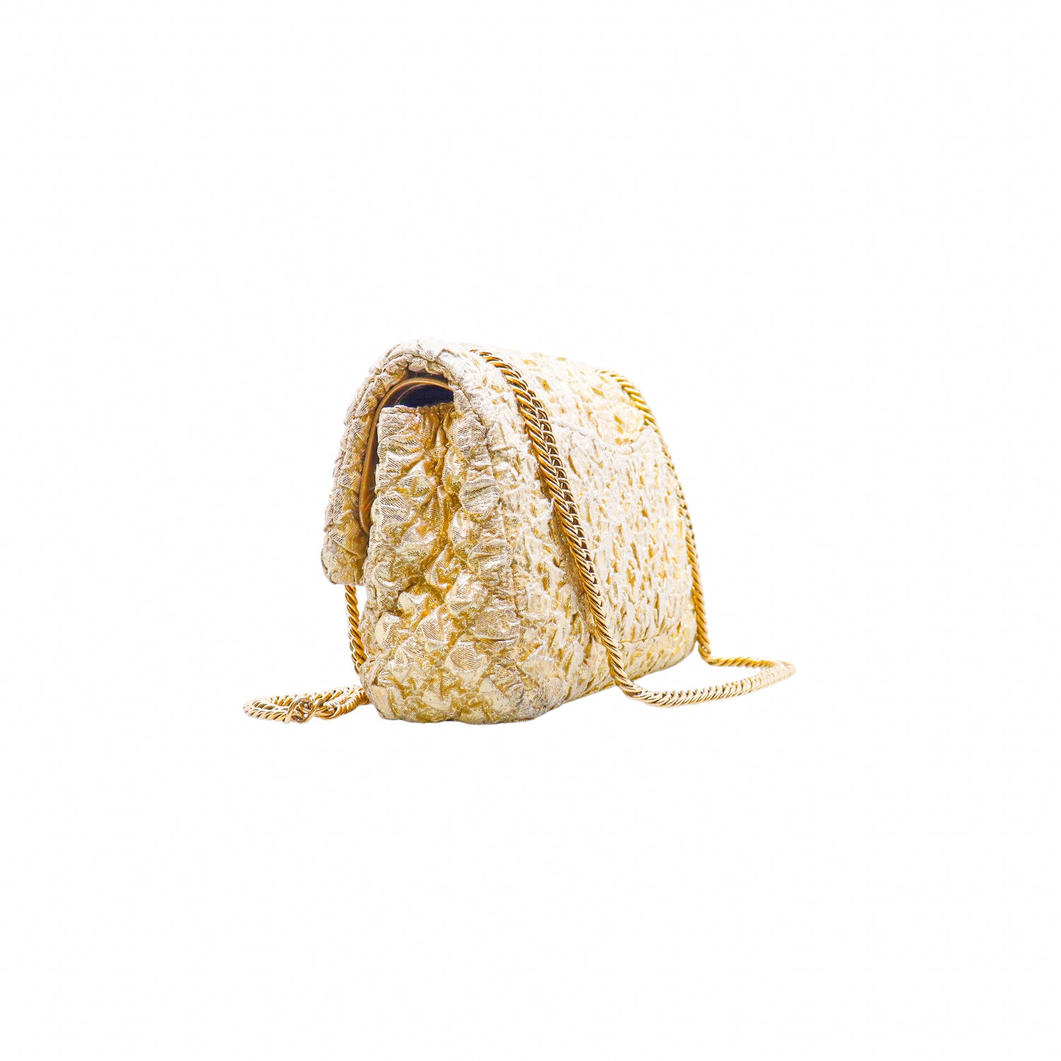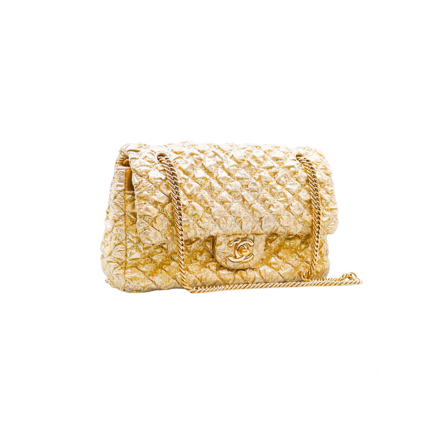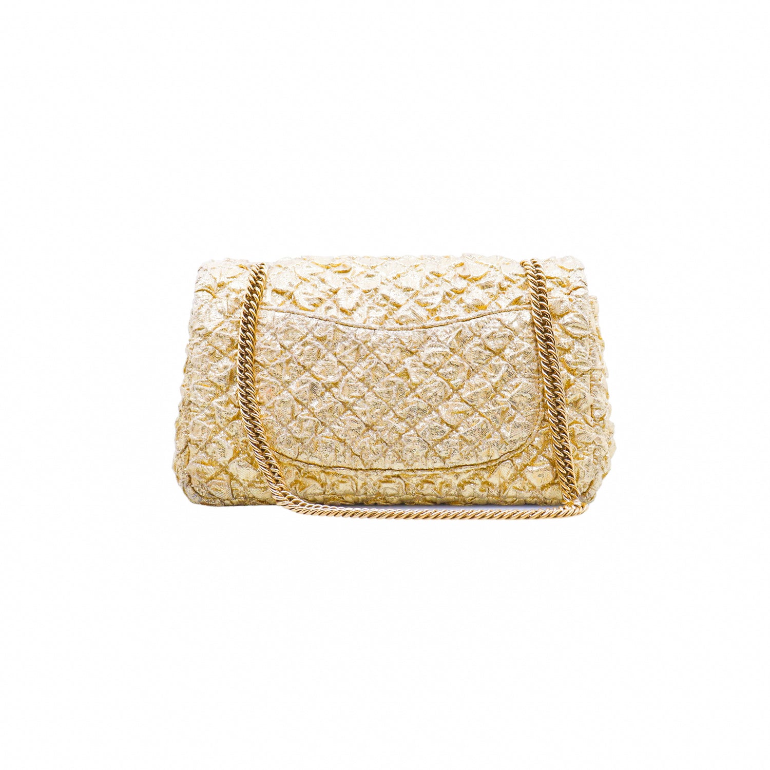 Bolso Chanel Clásico Double Flap, confeccionado en lame dorado, con herrajes y cadena en mismo color, con desgaste por uso en parte trasera, poco sucia por dentro, leves desgaste en base.