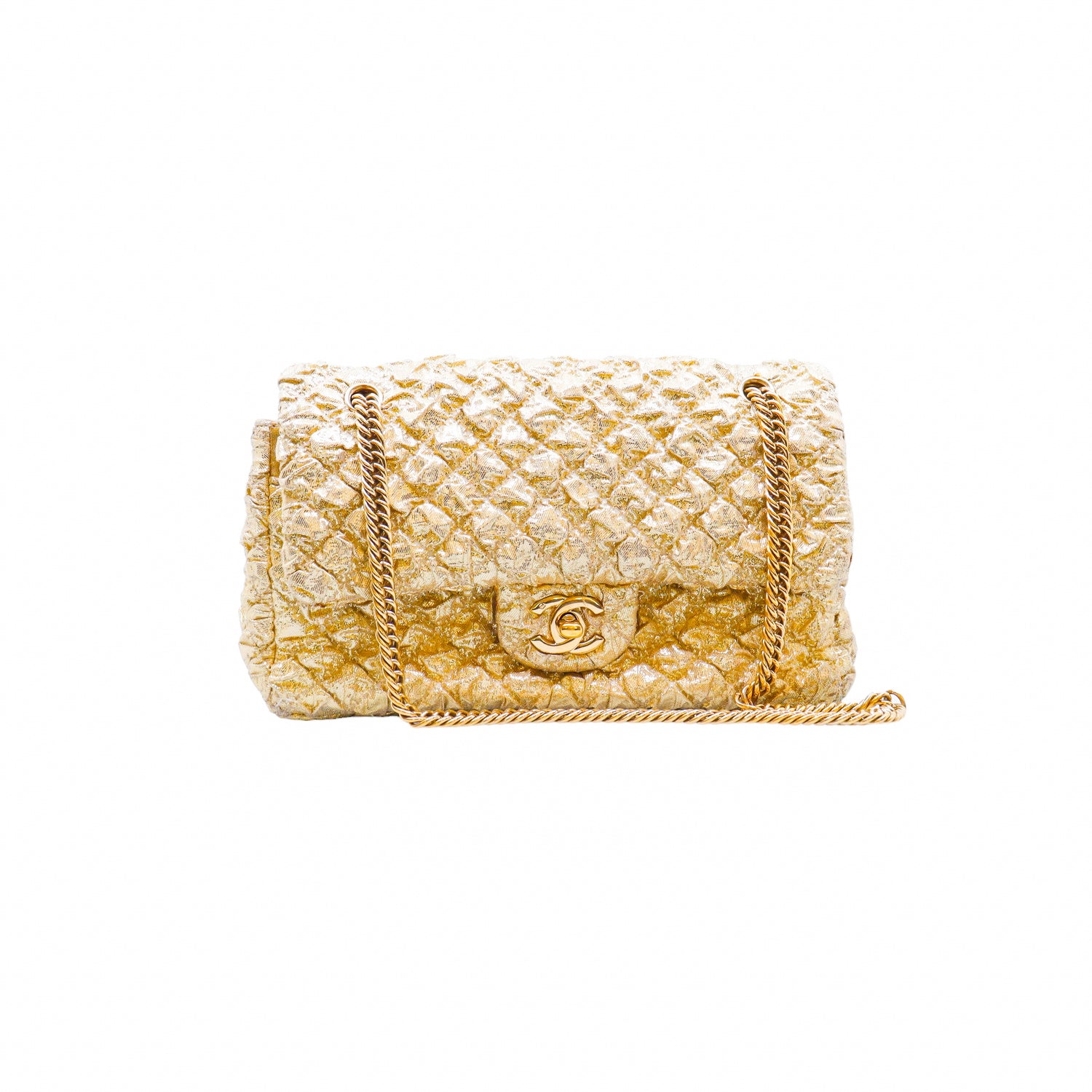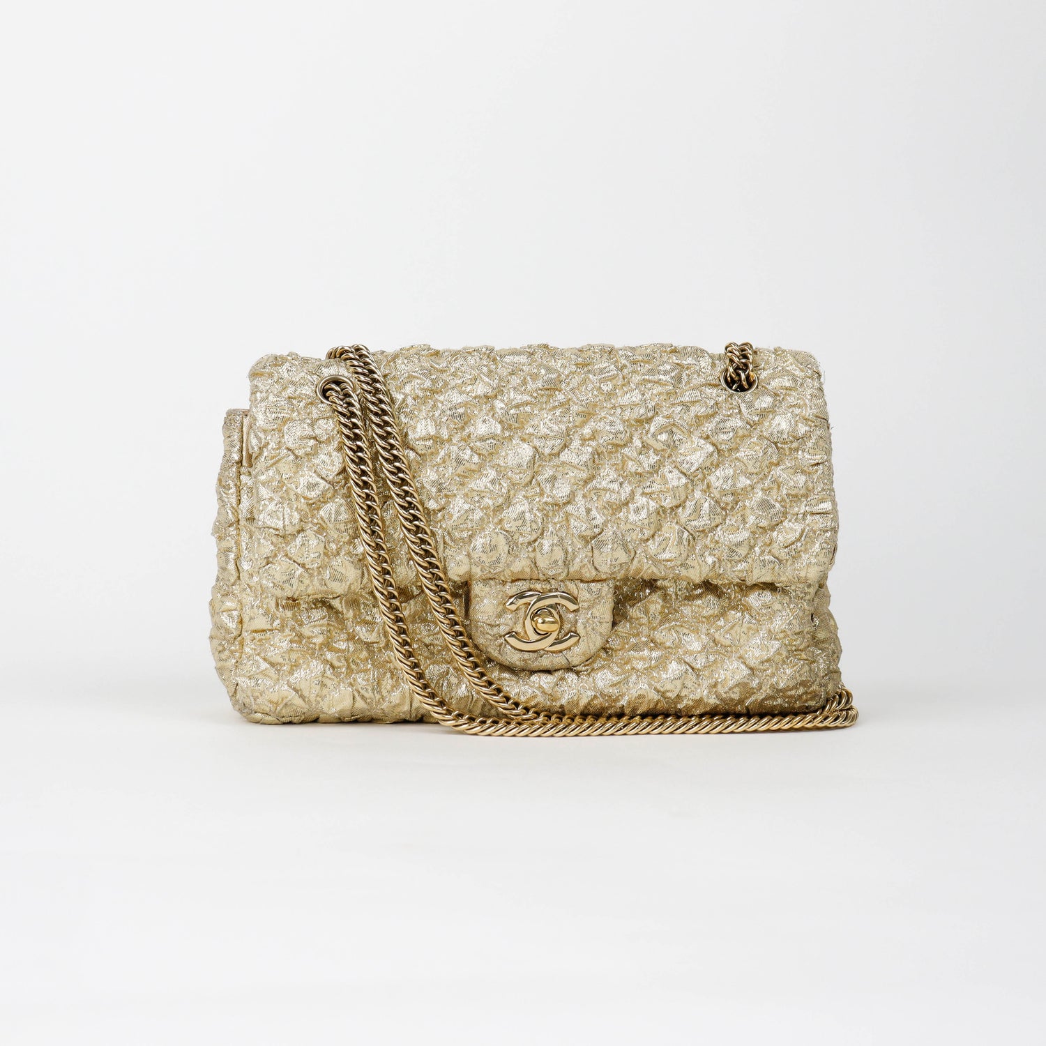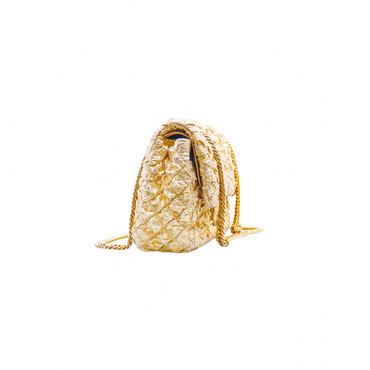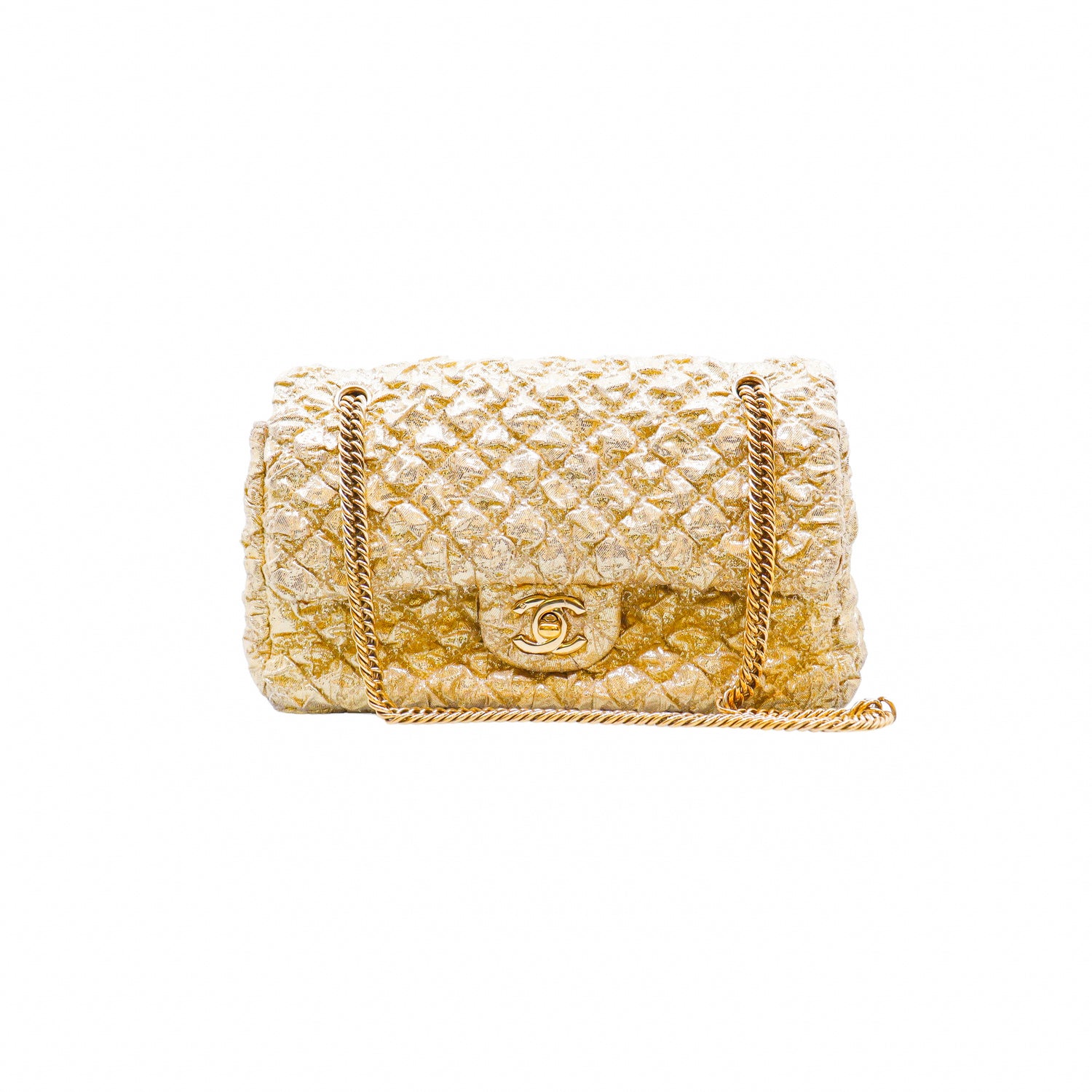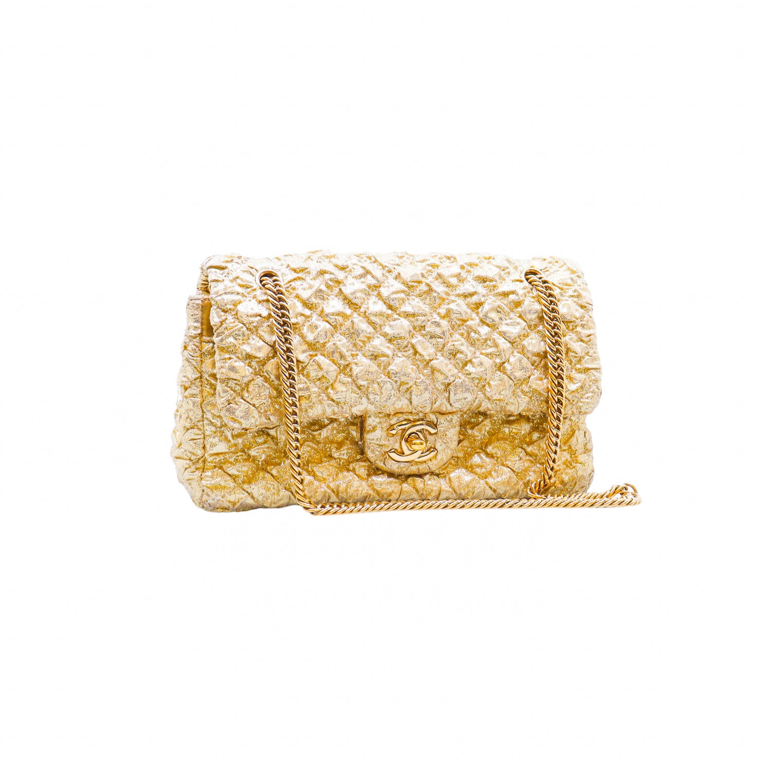 Bolso Chanel Clásico Double Flap, confeccionado en lame dorado, con herrajes y cadena en mismo color, con desgaste por uso en parte trasera, poco sucia por dentro, leves desgaste en base.