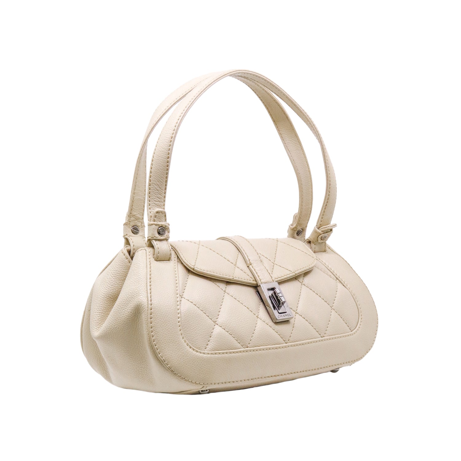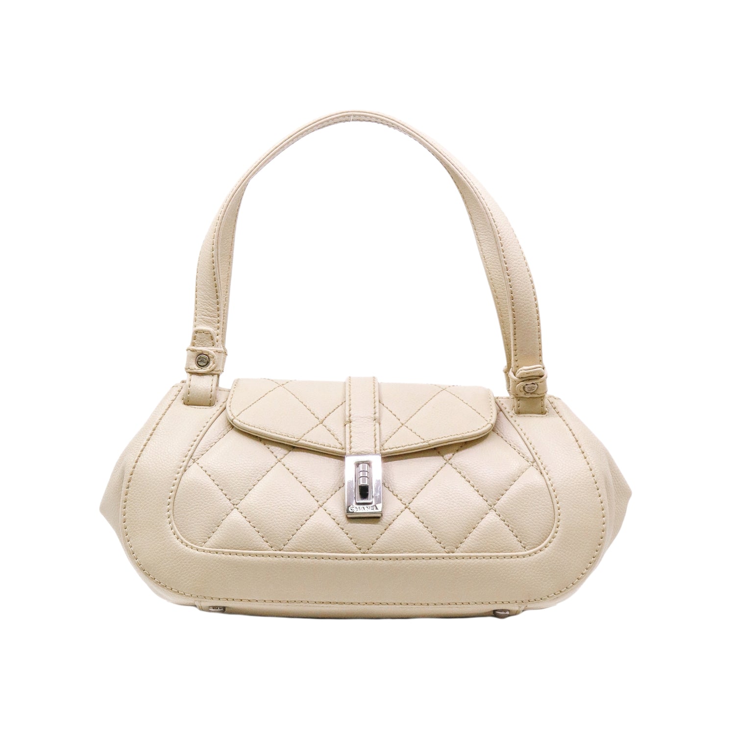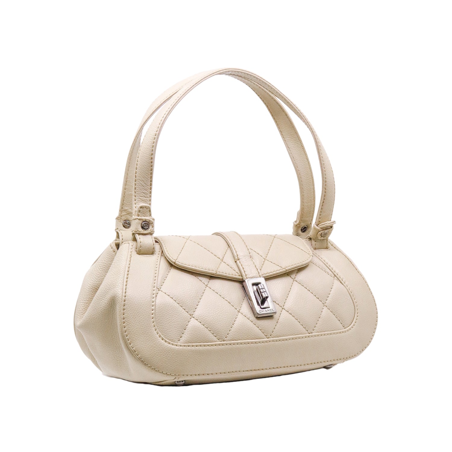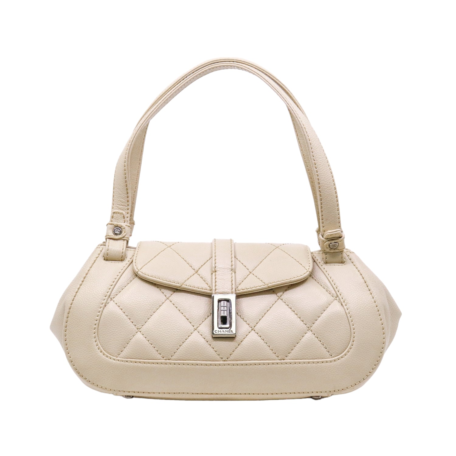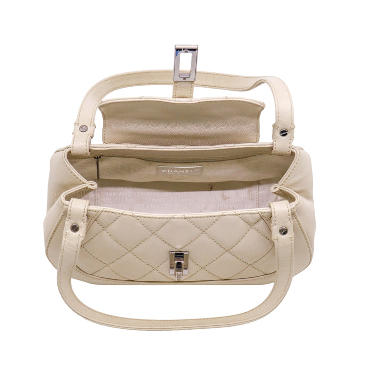 Bolso clásico Chanel Mademoiselle en piel tipo caviar acolchada en color beige, forro interno poco sucio en mismo tono, con 2 asas semi-rígidas, bolso interno con cierre de cremallera, broche frontal y herrajes en metal plateado.
