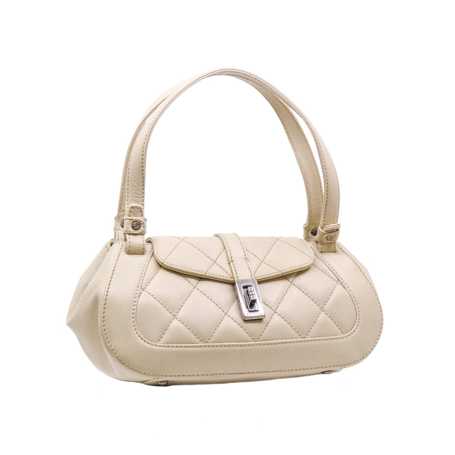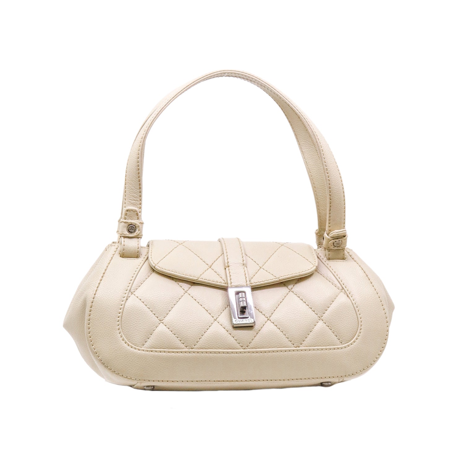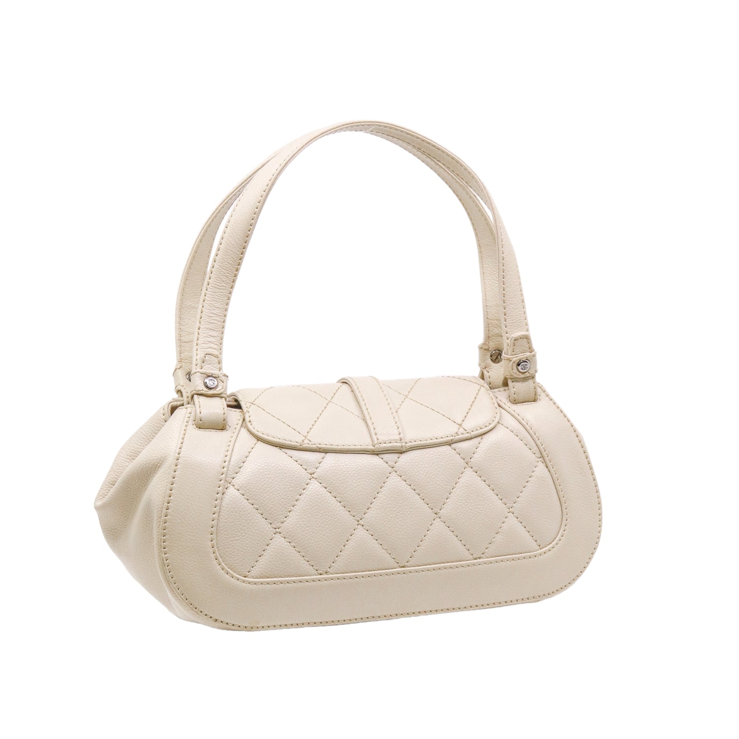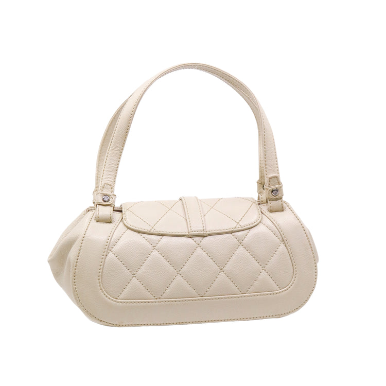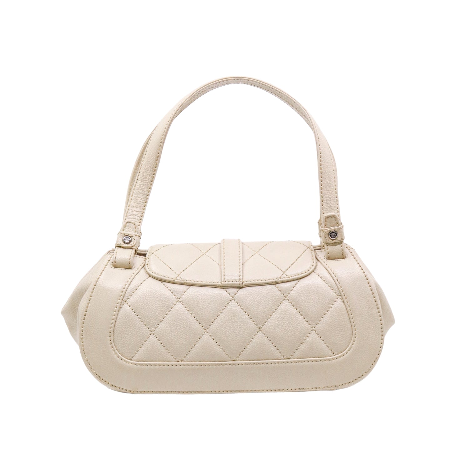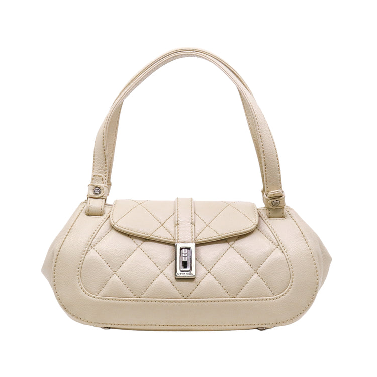 Bolso clásico Chanel Mademoiselle en piel tipo caviar acolchada en color beige, forro interno poco sucio en mismo tono, con 2 asas semi-rígidas, bolso interno con cierre de cremallera, broche frontal y herrajes en metal plateado.
