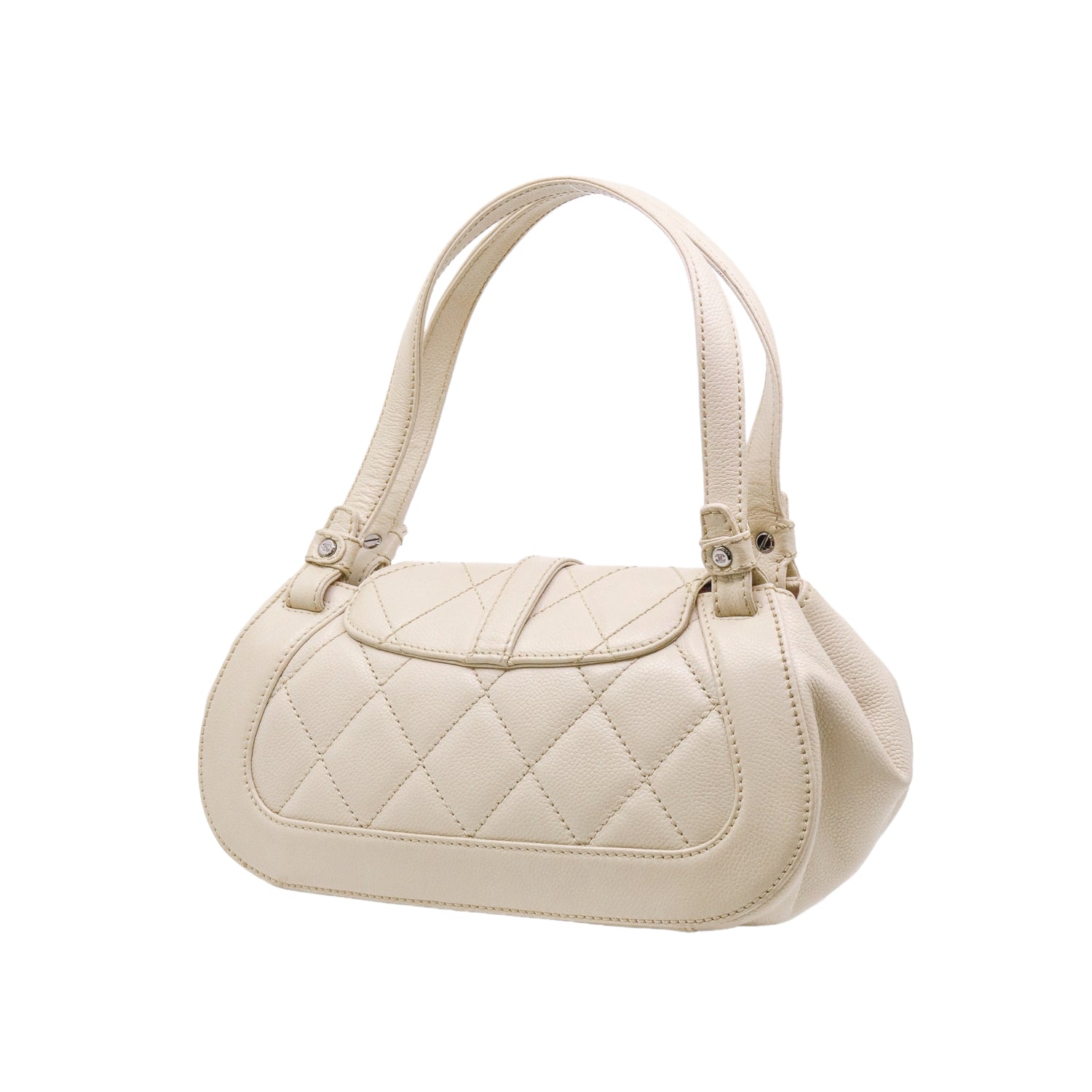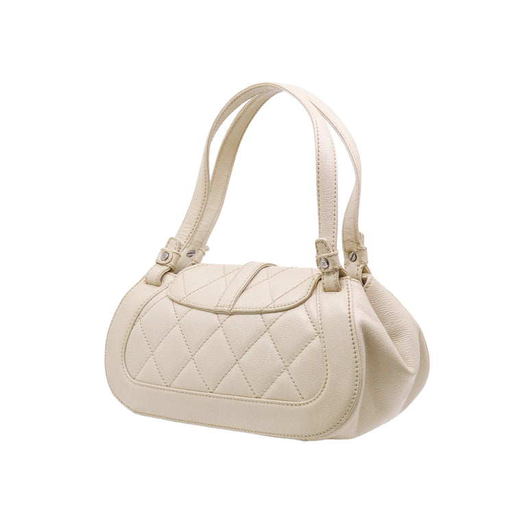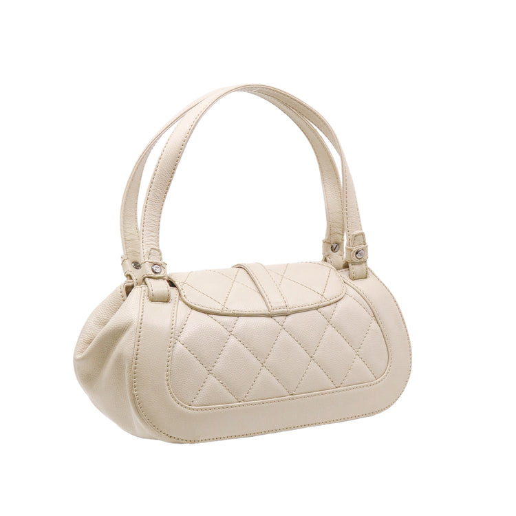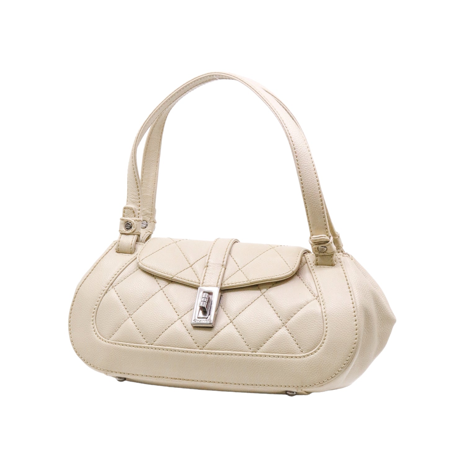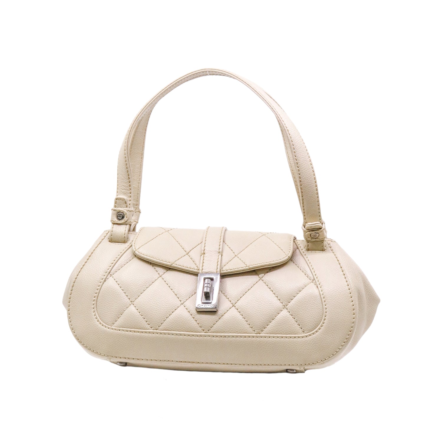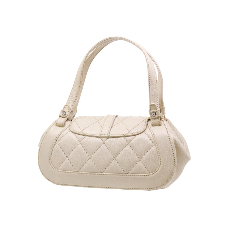 Bolso clásico Chanel Mademoiselle en piel tipo caviar acolchada en color beige, forro interno poco sucio en mismo tono, con 2 asas semi-rígidas, bolso interno con cierre de cremallera, broche frontal y herrajes en metal plateado.