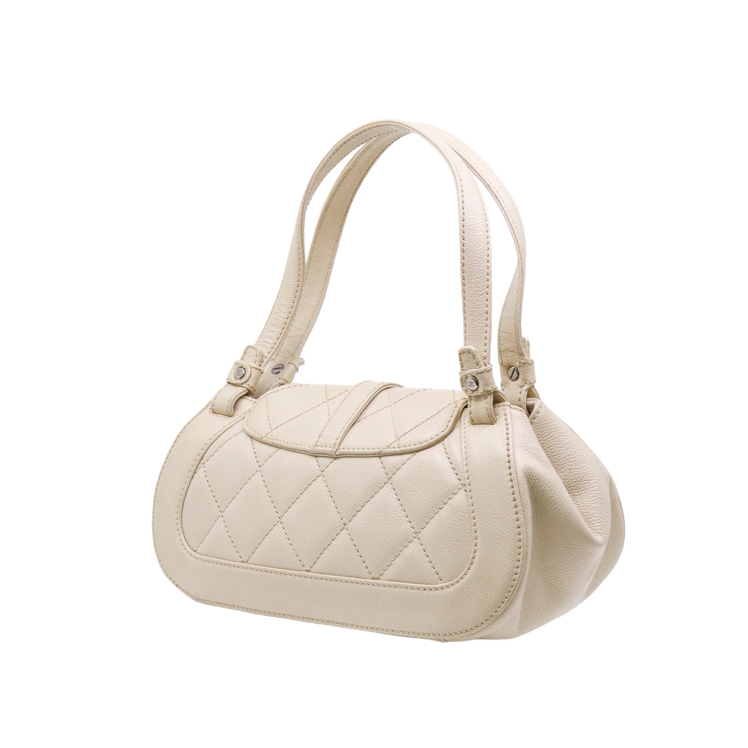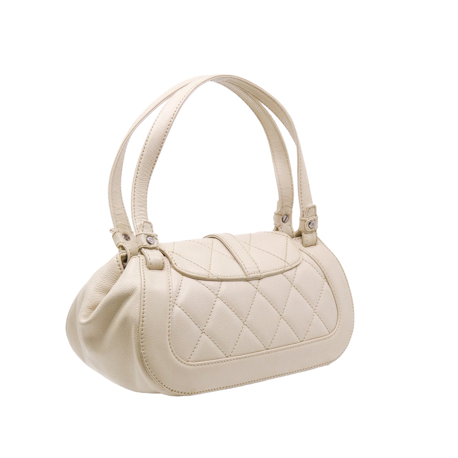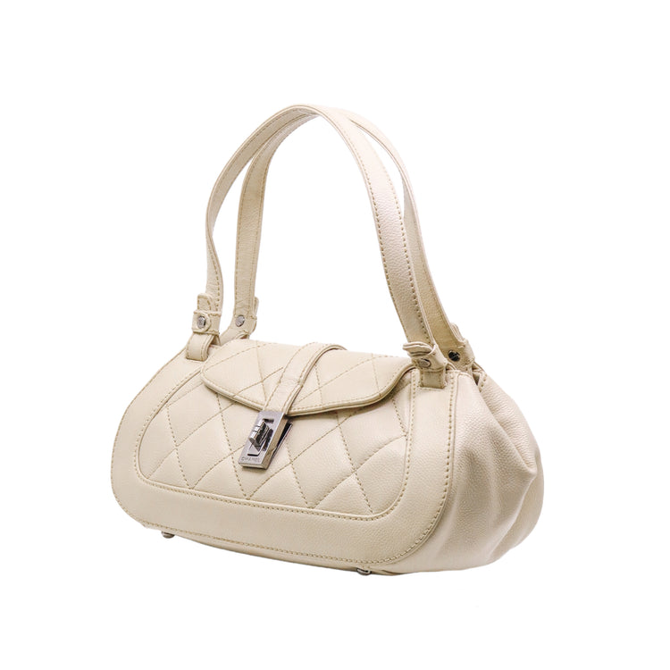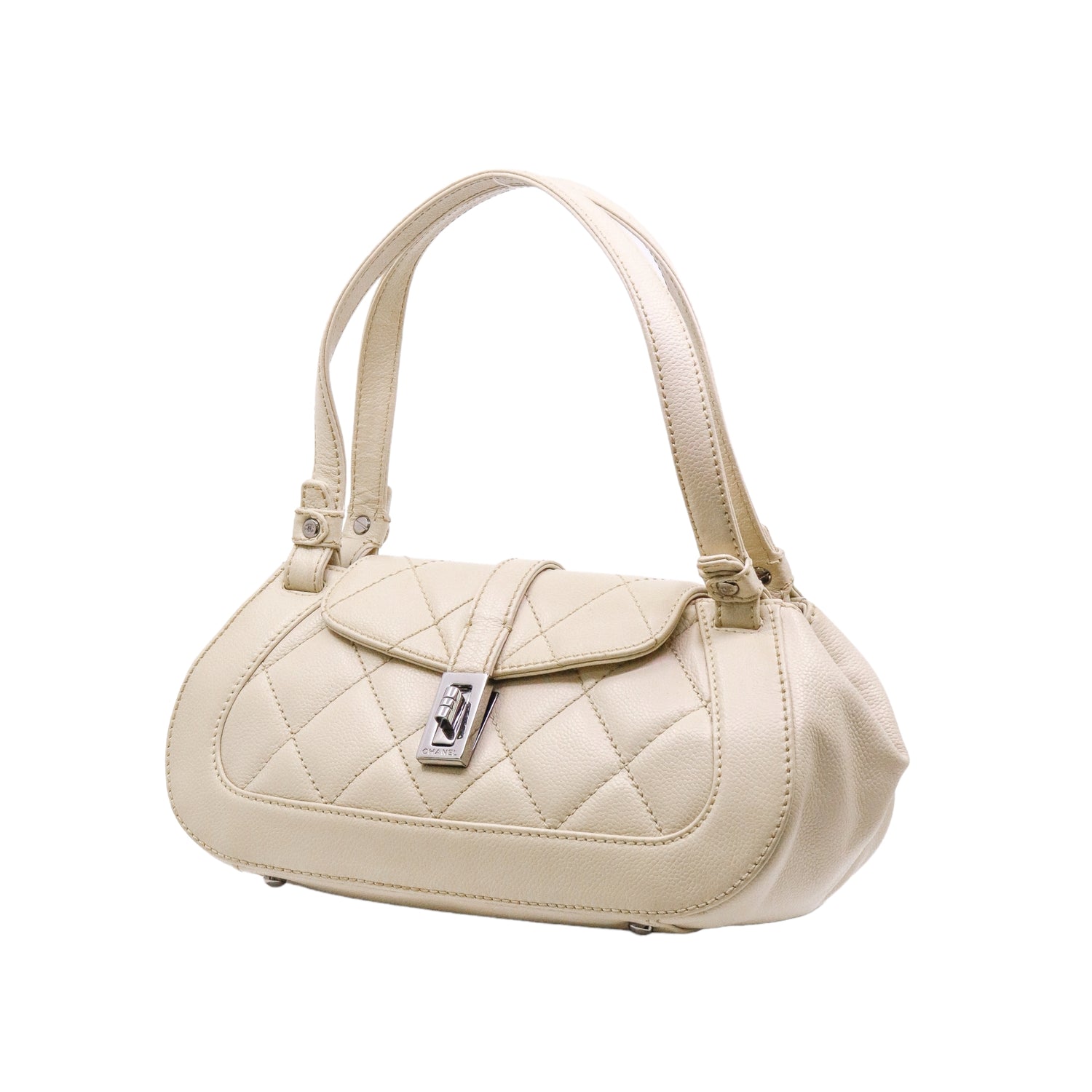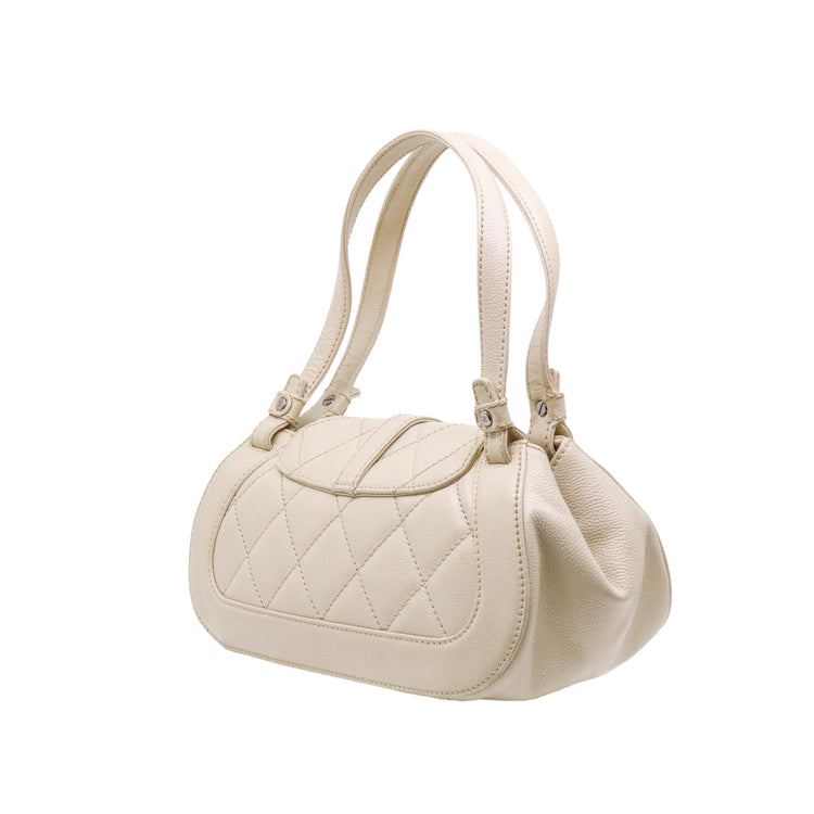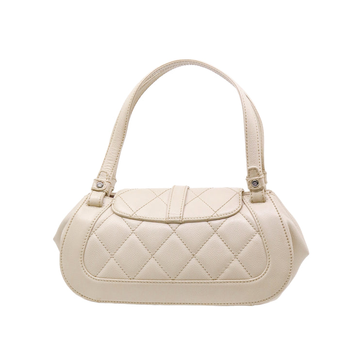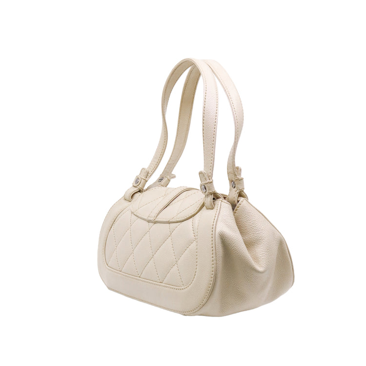 Bolso clásico Chanel Mademoiselle en piel tipo caviar acolchada en color beige, forro interno poco sucio en mismo tono, con 2 asas semi-rígidas, bolso interno con cierre de cremallera, broche frontal y herrajes en metal plateado.